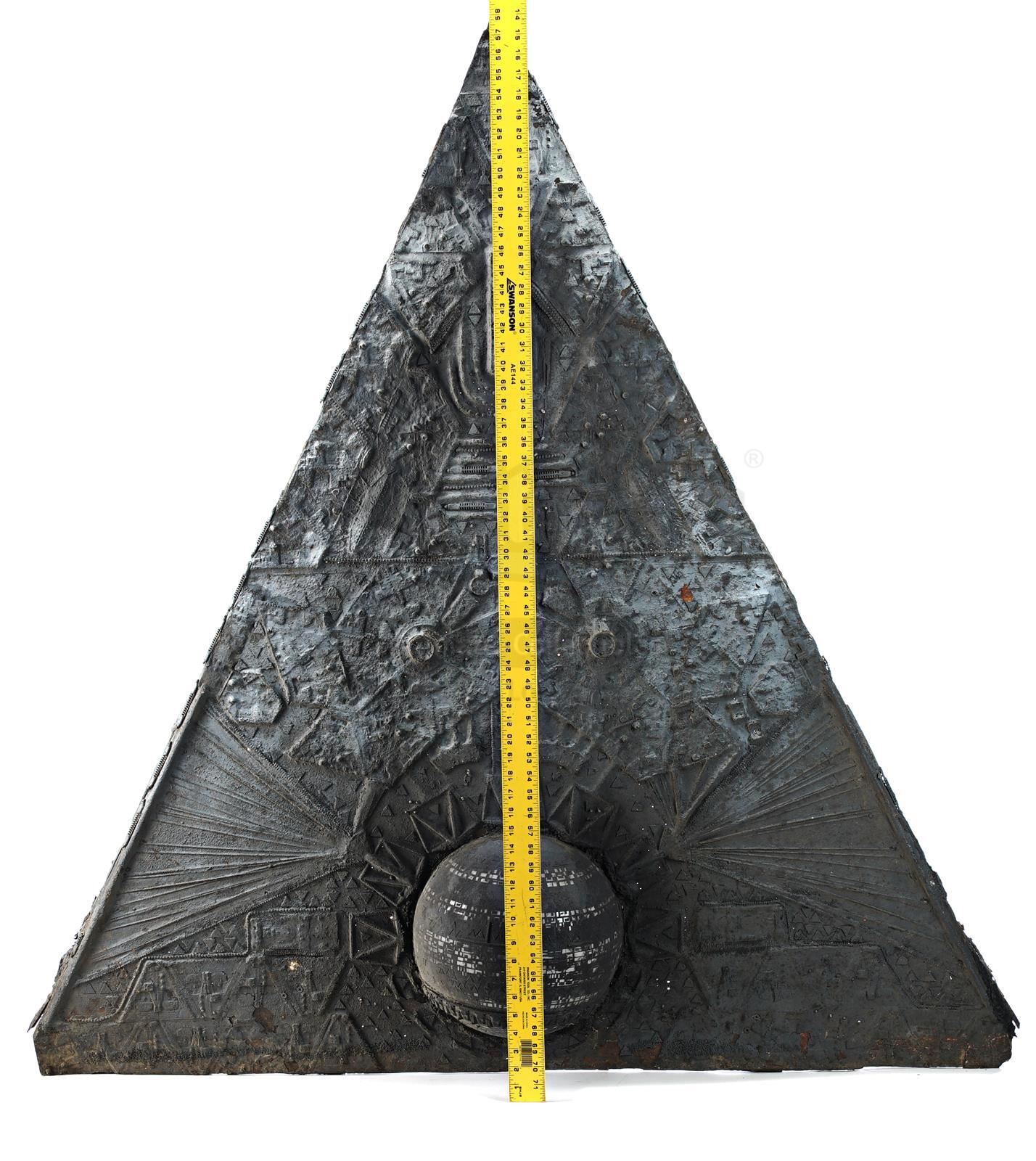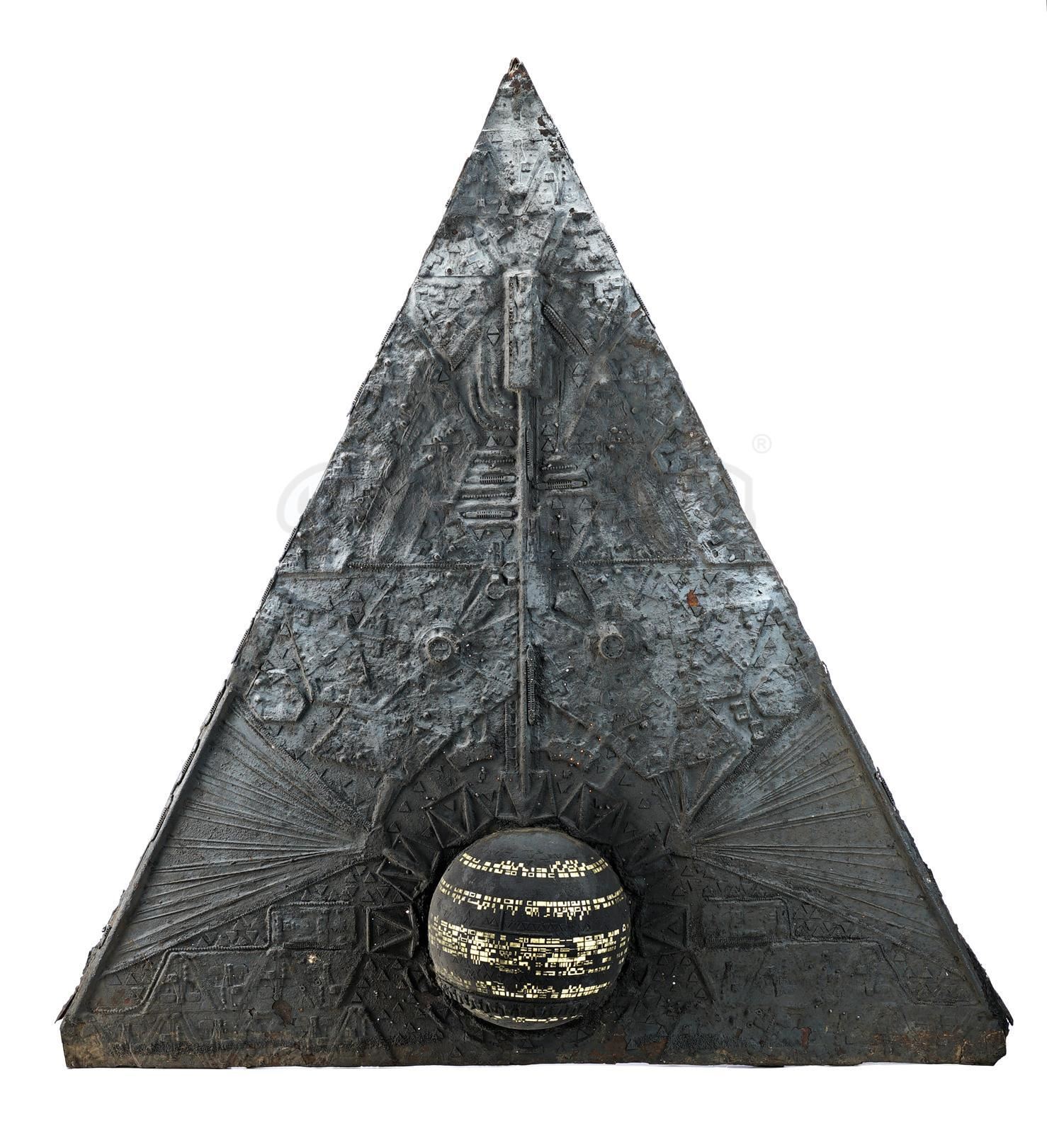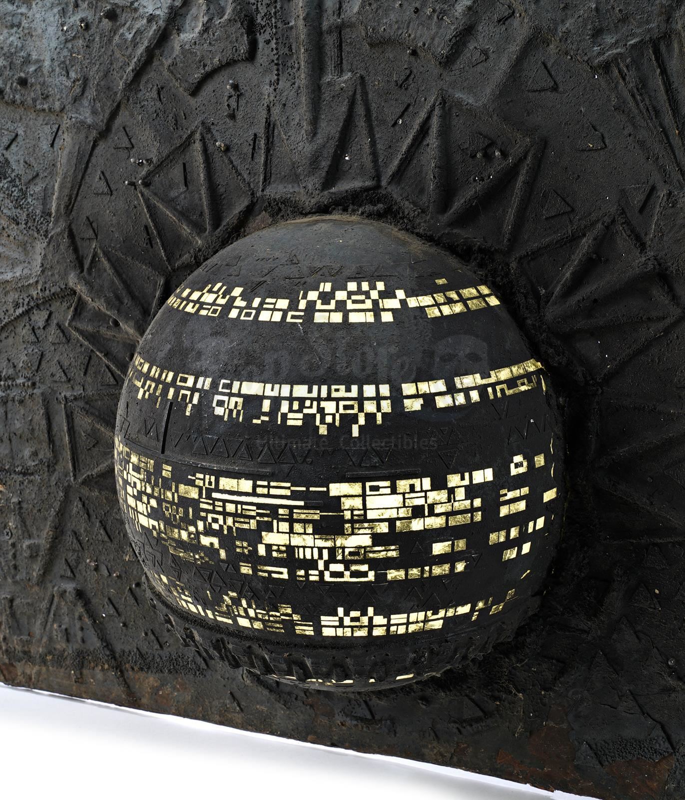 This lot will be auctioned on Thursday, July 1st. The auction will begin at 9:00am PDT and lots are sold sequentially via live auctioneer; tune in to the live streaming broadcast on auction day to follow the pace. Note other lots in the auction may close on June 29th or June 30th. A light-up V'ger panel from Robert Wise's sci-fi film Star Trek: The Motion Picture. The Enterprise passed lit panels as it entered V'ger. The panel is made of gray-painted fiberglass over a wooden frame with sculpted patterns, optical fibers, and a spherical structure with window-like, light-up stripes. The rear houses bundled optical fibers, wiring, a power supply cable, and metal chains. It is in fair overall condition with some wear from production and age, including scuffing, staining, cracking, and loose fibers. Dimensions: 58" x 55" x 24" (147.5 cm x 139.75 cm x 61 cm) Contains electronic components; see notice in the Buyer's Guide. Estimate: $1,200 - 1,800