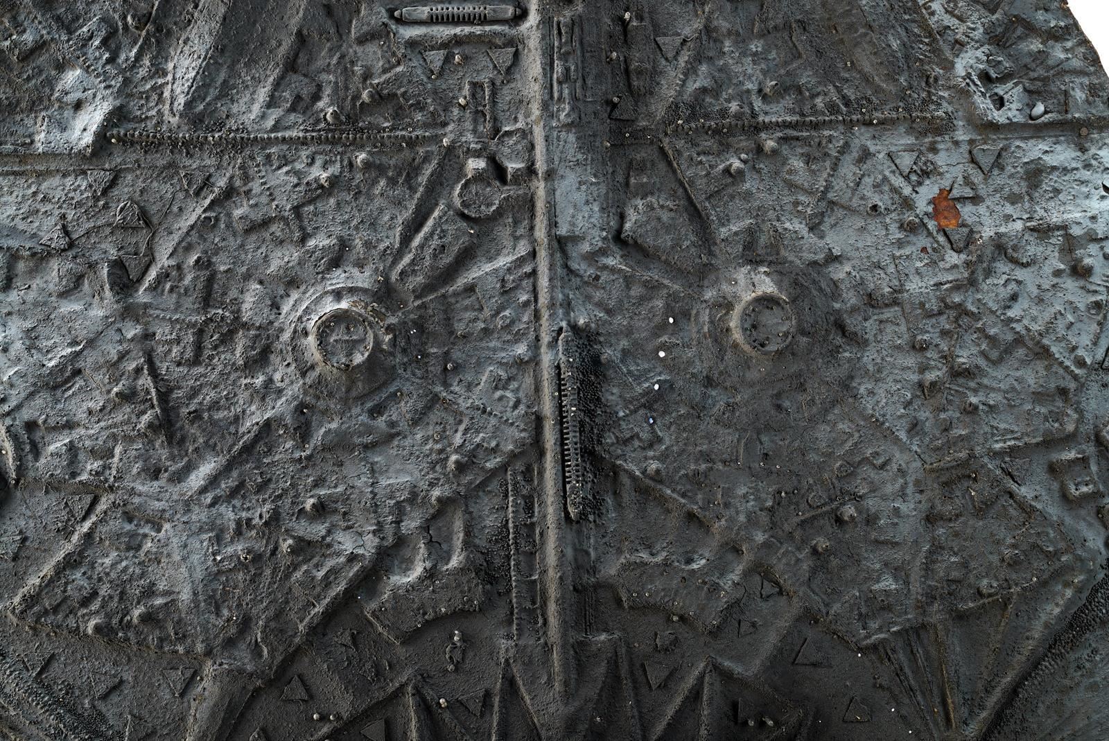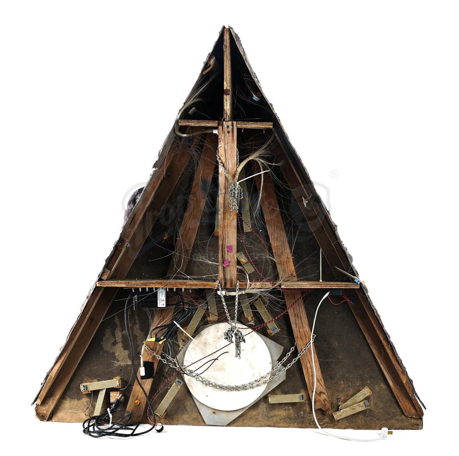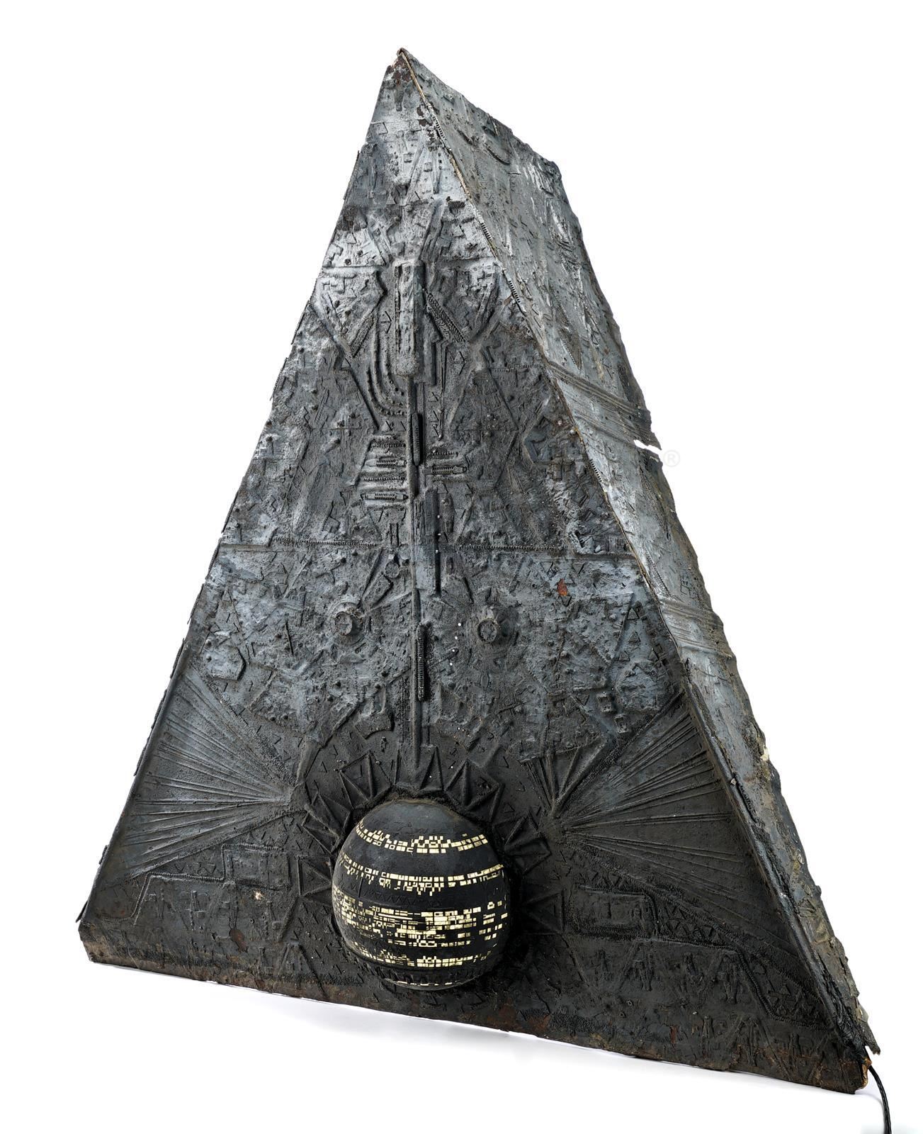 This lot will be auctioned on Thursday, July 1st. The auction will begin at 9:00am PDT and lots are sold sequentially via live auctioneer; tune in to the live streaming broadcast on auction day to follow the pace. Note other lots in the auction may close on June 29th or June 30th. A light-up V'ger panel from Robert Wise's sci-fi film Star Trek: The Motion Picture. The Enterprise passed lit panels as it entered V'ger. The panel is made of gray-painted fiberglass over a wooden frame with sculpted patterns, optical fibers, and a spherical structure with window-like, light-up stripes. The rear houses bundled optical fibers, wiring, a power supply cable, and metal chains. It is in fair overall condition with some wear from production and age, including scuffing, staining, cracking, and loose fibers. Dimensions: 58" x 55" x 24" (147.5 cm x 139.75 cm x 61 cm) Contains electronic components; see notice in the Buyer's Guide. Estimate: $1,200 - 1,800