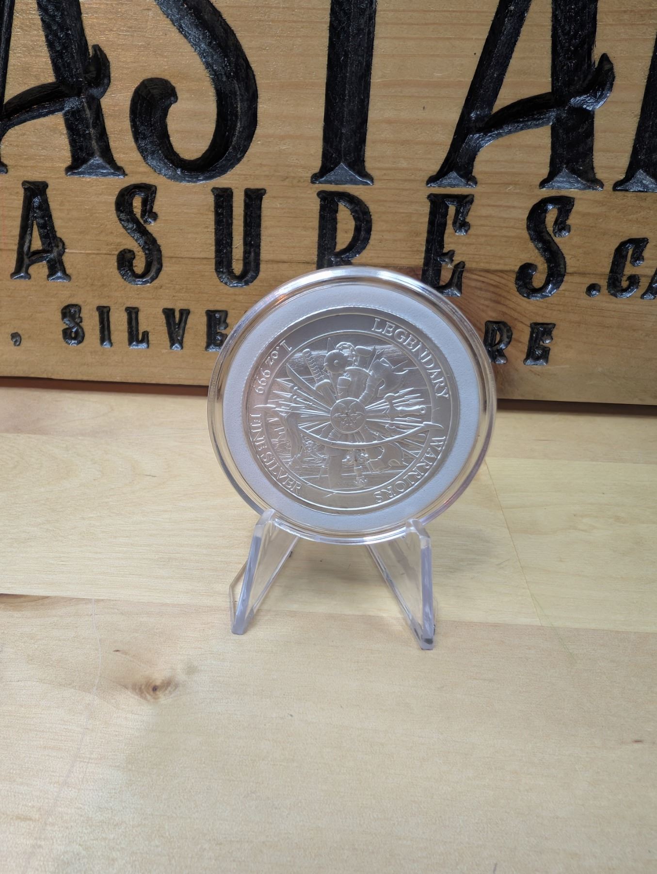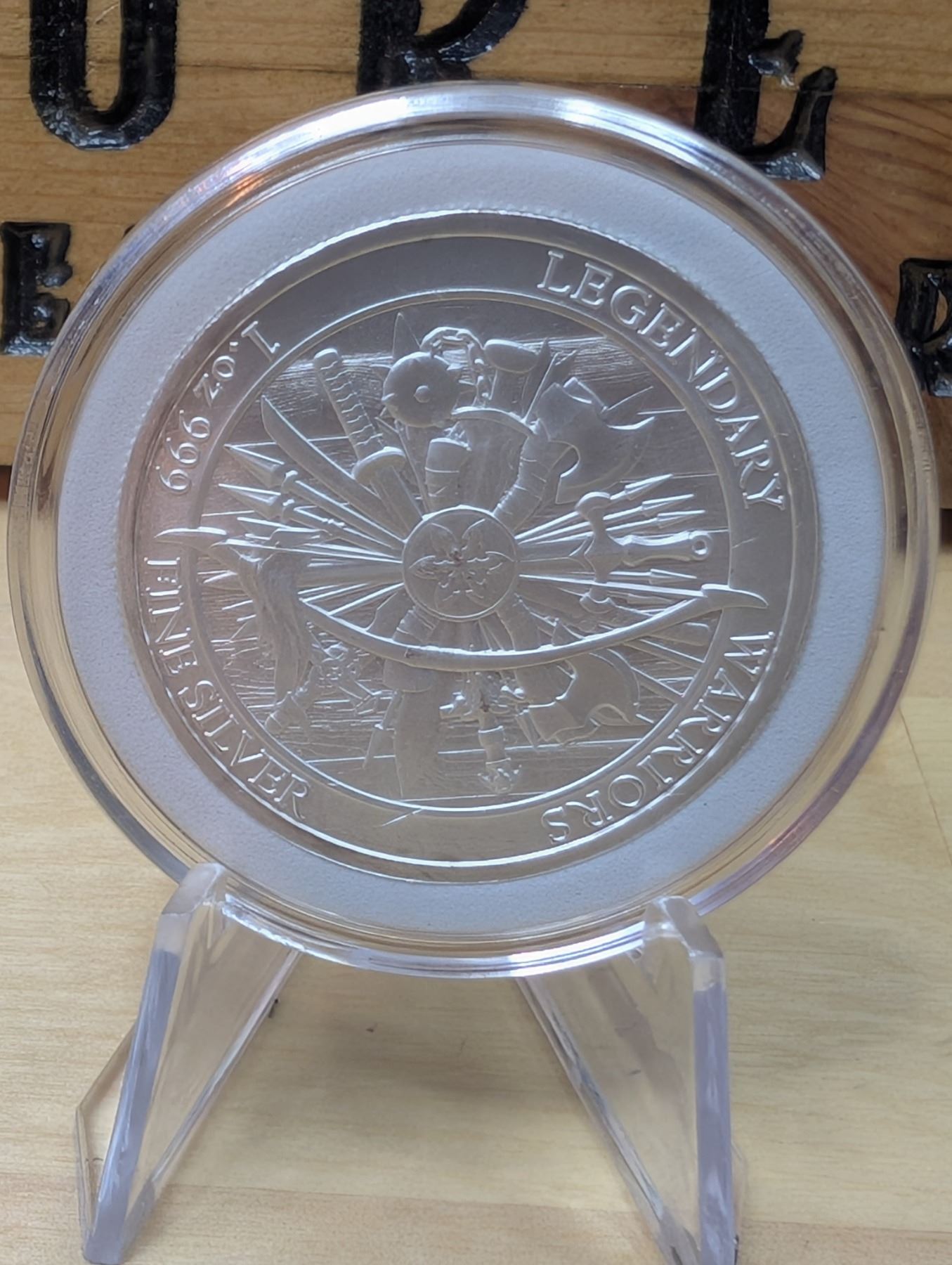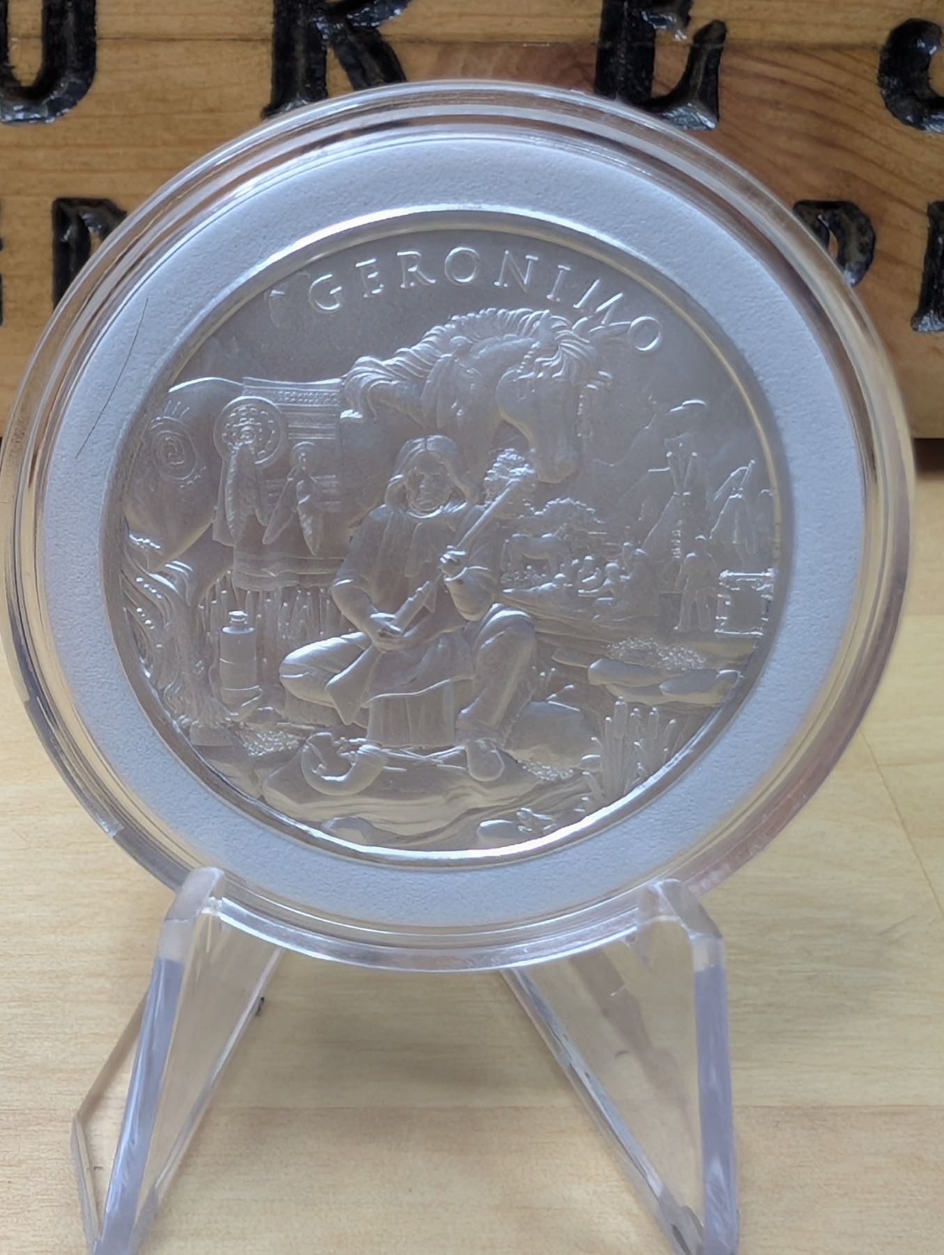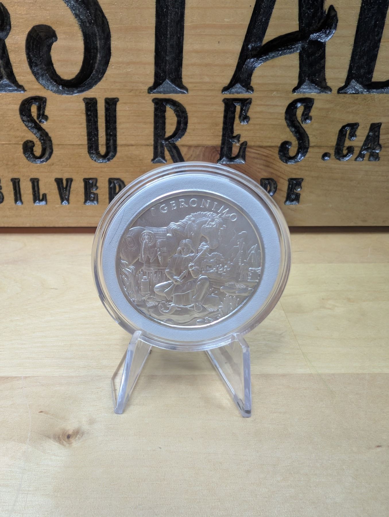 The 1 oz Geronimo Legendary Warriors Coin is a silver coin that celebrates Geronimo, the famous Apache leader and warrior. The coin typically contains 1 ounce of .999 fine silver and features a detailed design of Geronimo, often in a traditional pose or with elements representing his heritage and leadership in battle. As part of the Legendary Warriors series, this coin honors Geronimo's legacy and his role in Native American history. It is popular among collectors interested in both historical figures and precious metal investments.