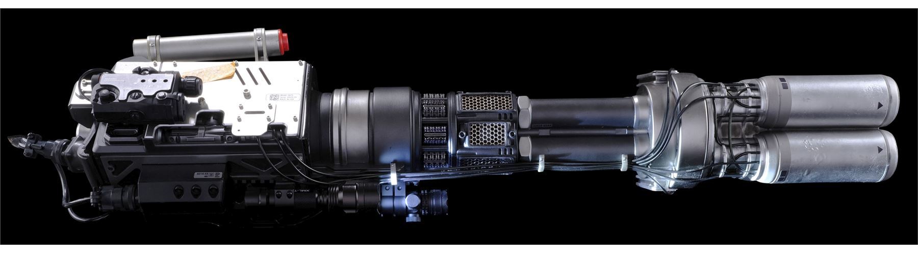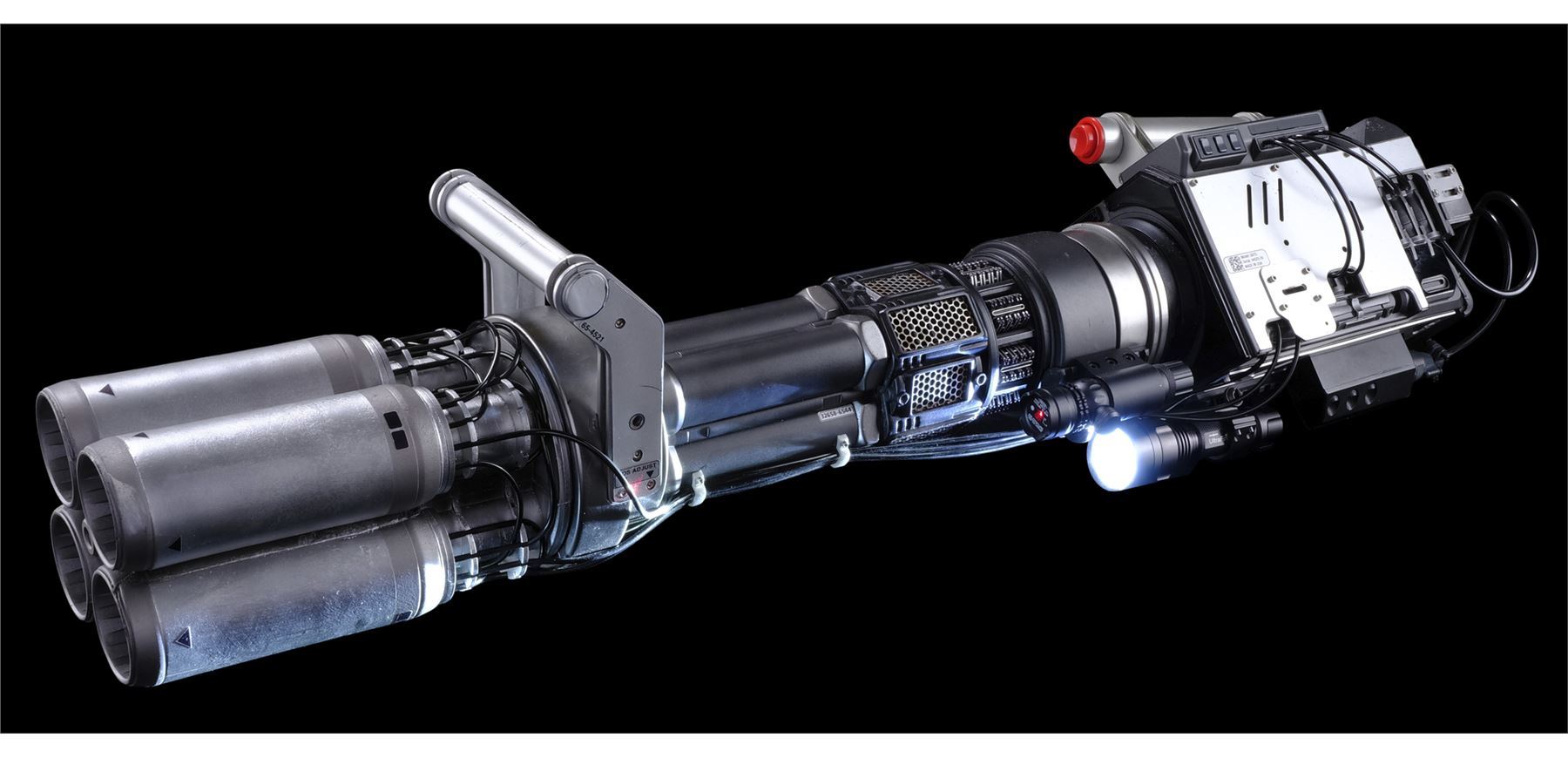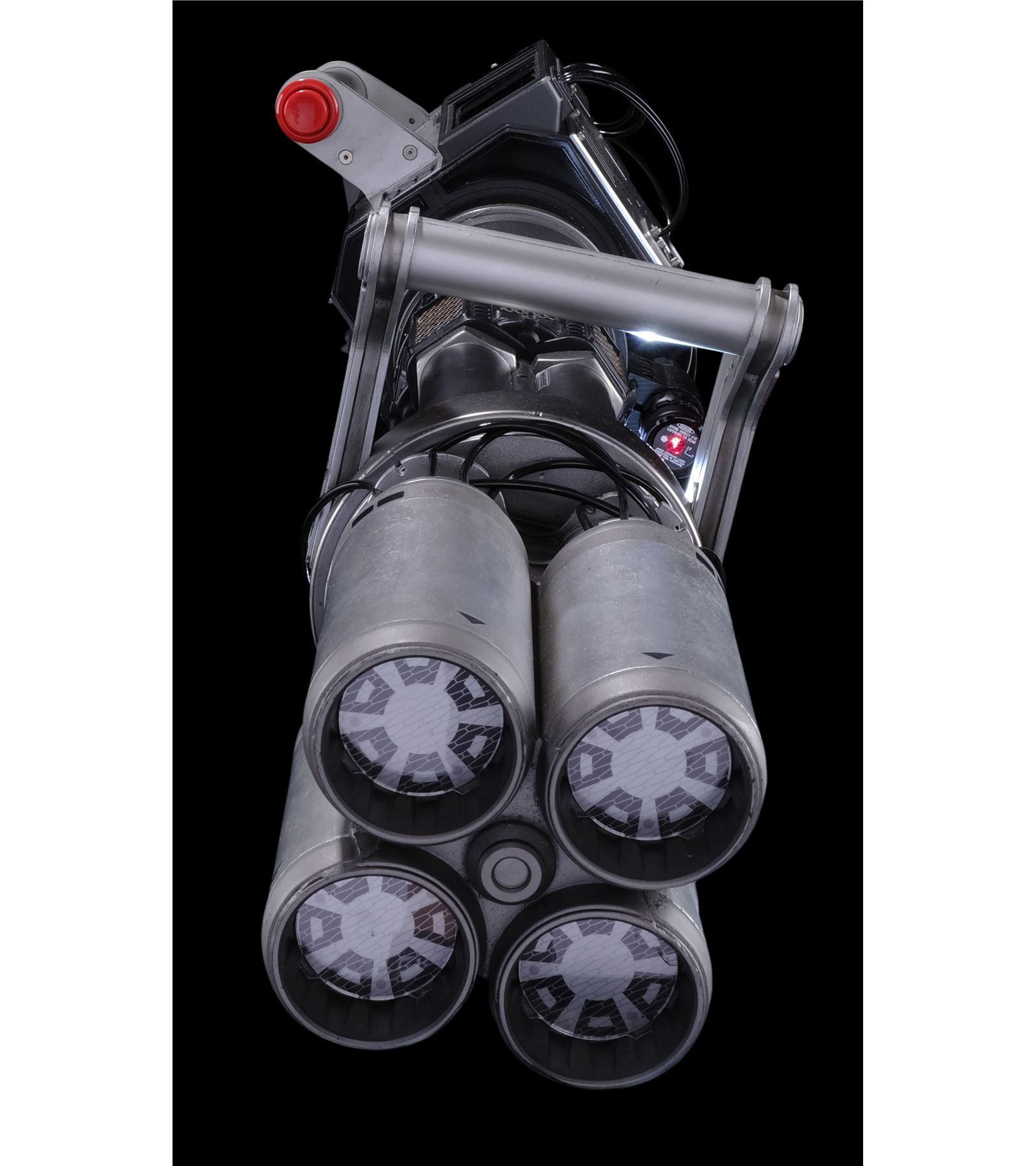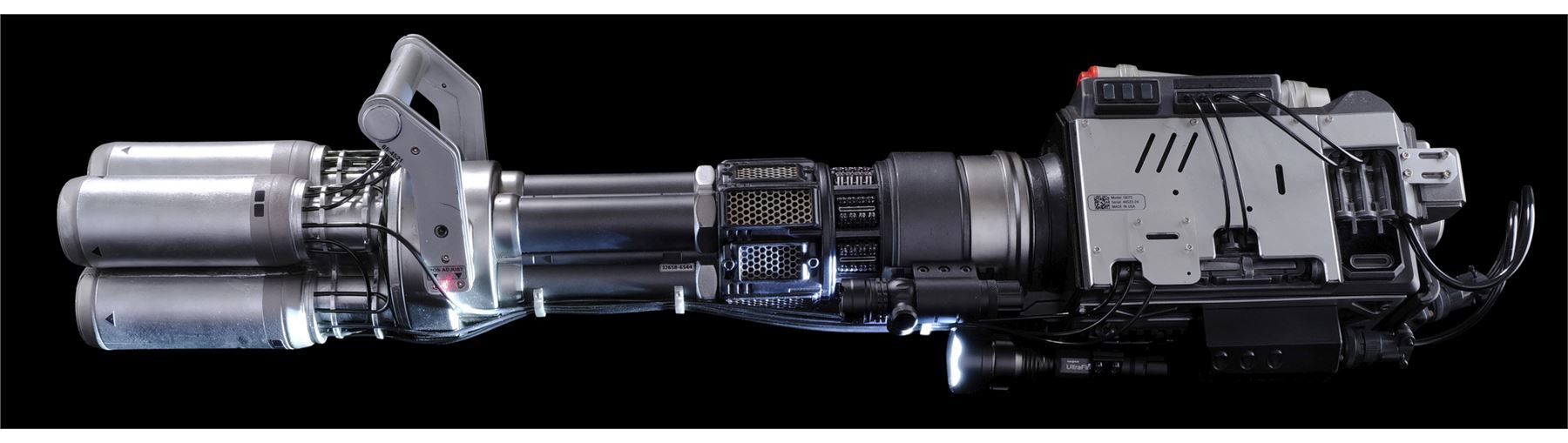 This lot consists of a black nylon strap, a gray- and black-painted urethane cannon featuring a clear acrylic panels at the front of four barrels, two black flashlights, two gray-painted urethane handles with one featuring a red-painted start button, and artificial buttons and panels. This cannon lights up when the flashlights are powered. This lot exhibits minor scuffs and a bent back piece from production use. Dimensions: 40" x 9" x 10" (101.75 cm x 23 cm x 25.5 cm)