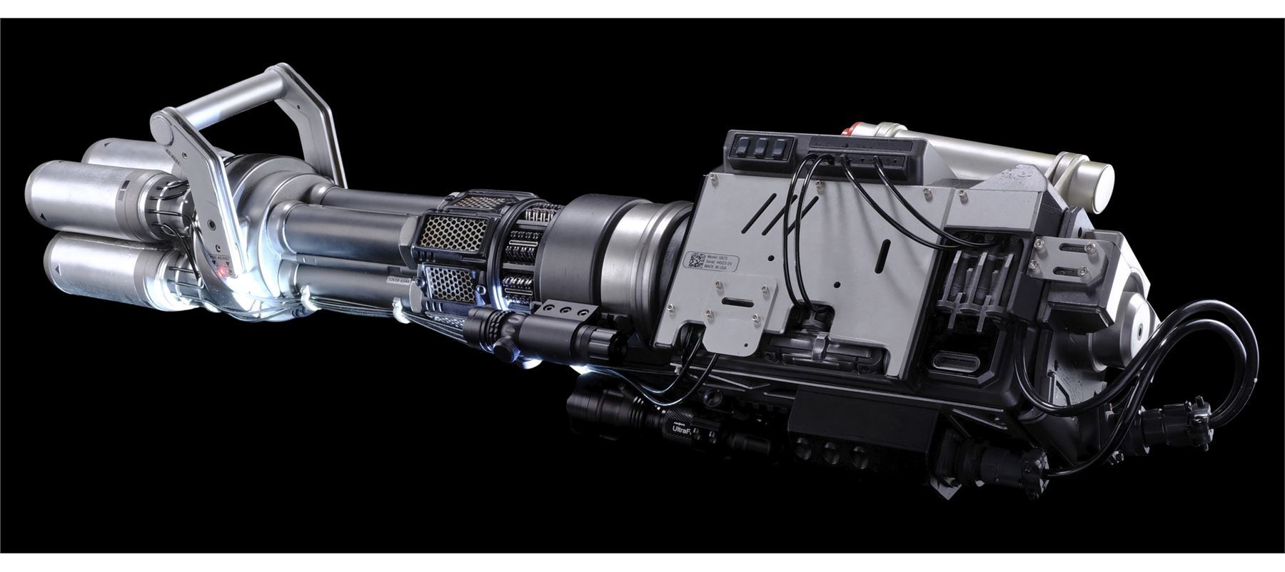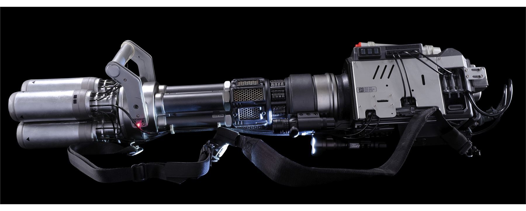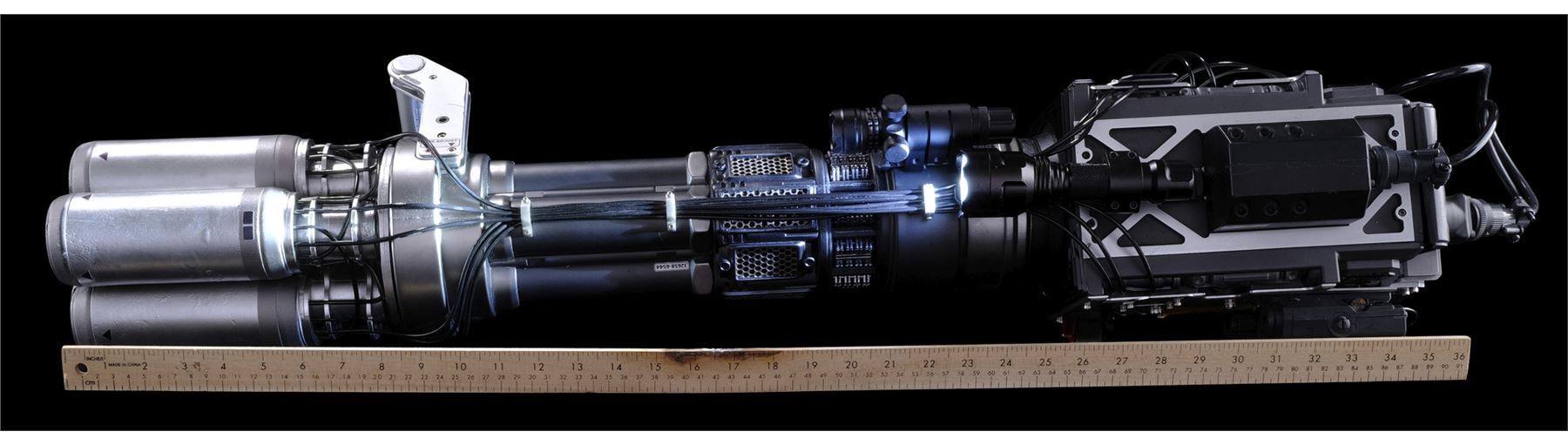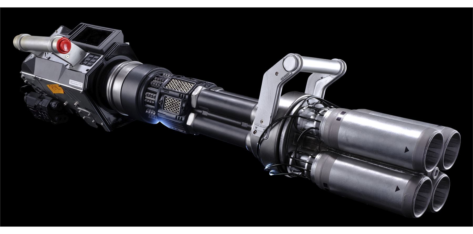 This lot consists of a black nylon strap, a gray- and black-painted urethane cannon featuring a clear acrylic panels at the front of four barrels, two black flashlights, two gray-painted urethane handles with one featuring a red-painted start button, and artificial buttons and panels. This cannon lights up when the flashlights are powered. This lot exhibits minor scuffs and a bent back piece from production use. Dimensions: 40" x 9" x 10" (101.75 cm x 23 cm x 25.5 cm)