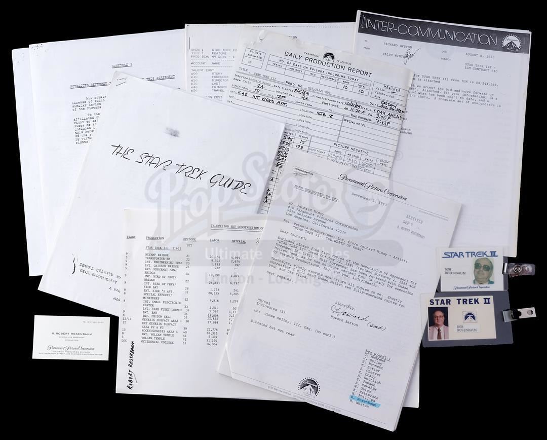 This lot will be auctioned on Thursday, July 1st. The auction will begin at 9:00am PDT and lots are sold sequentially via live auctioneer; tune in to the live streaming broadcast on auction day to follow the pace. Note other lots in the auction may close on June 29th or June 30th. A cast and crew contract and production documents collection from the productions of Star Trek II: The Wrath of Khan and Star Trek III: The Search for Spock. R. Robert Rosenbaum was an SVP at Paramount during both productions. This lot consists of two of his production IDs; his business card; 17 pages of Star Trek III budget proposals; a 42-page Star Trek II contract for Leonard Nimoy; Nimoy's glossy black and white headshot; three set cost pages for Star Trek III and other Paramount Studios projects; 31 hand-marked Star Trek III salary and budget pages; a 1983 Star Trek III production report; and a 35-page Star Trek production bible labeled "The Star Trek Guide." The lot is in fair overall condition with various tears, loose pages, and stains from age and use. Dimensions (largest): 14" x 8.5" (35.75 cm x 21.75 cm); (smallest): 3.5" x 2" (9 cm x 5.25 cm) Estimate: $700 - 900