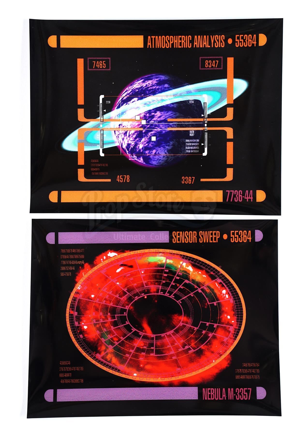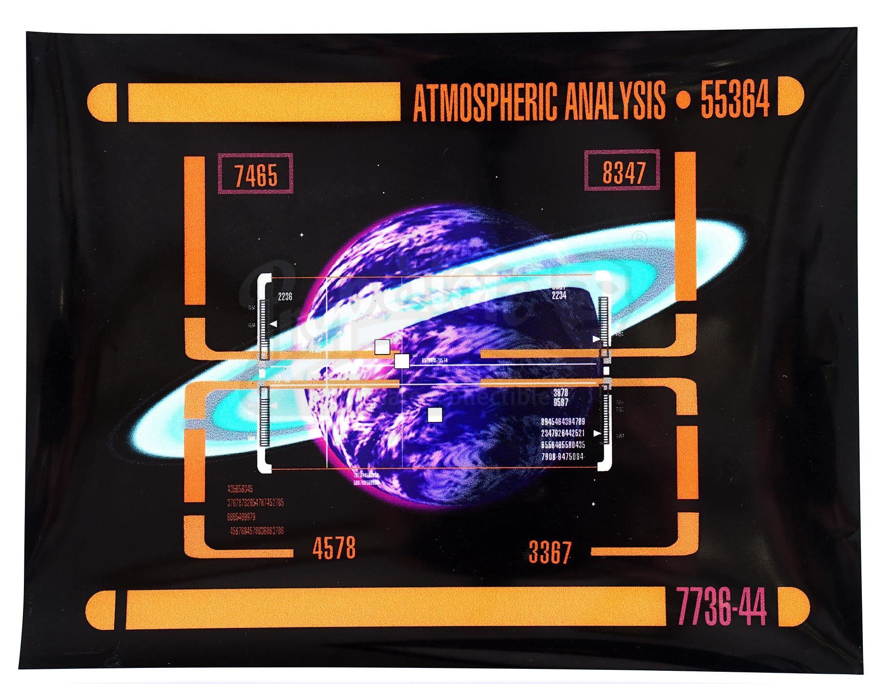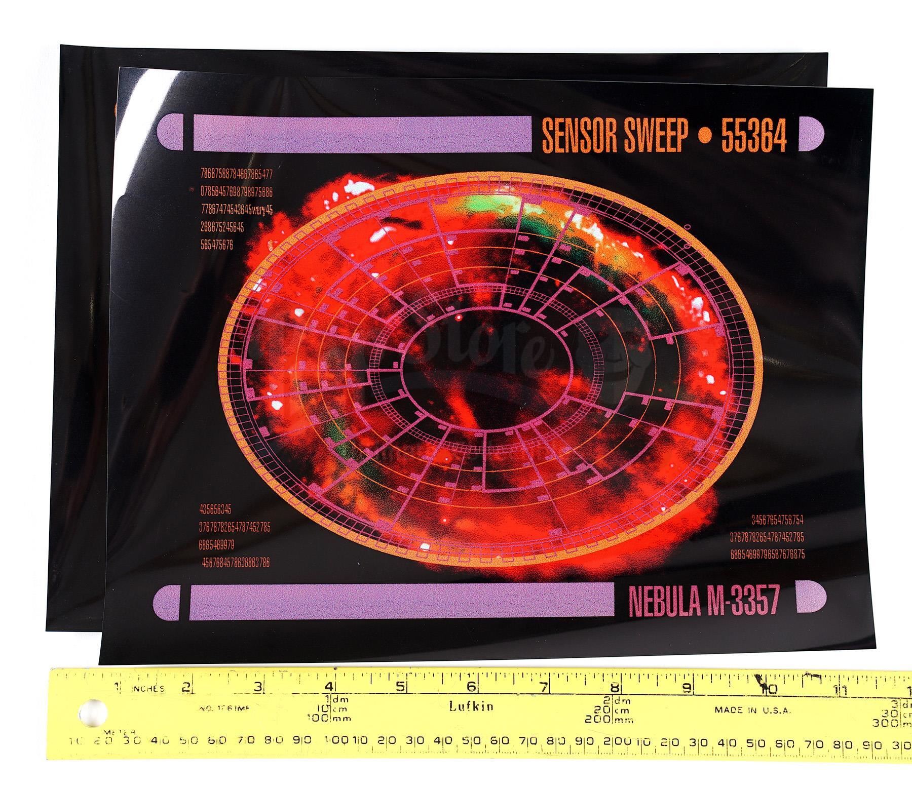 This lot will be auctioned on Thursday, July 1st. The auction will begin at 9:00am PDT and lots are sold sequentially via live auctioneer; tune in to the live streaming broadcast on auction day to follow the pace. Note other lots in the auction may close on June 29th or June 30th. PADD planetary graphics from Jonathan Frakes' sci-fi sequel Star Trek: Insurrection. The crew of the U.S.S. Enterprise used computerized PADDs throughout the film. This pair of printed plastic screen graphics designed to be affixed to the PADDs comes from long-time Star Trek scenic artist Doug Drexler. One is labeled "Sensor Sweep 55364" and "Nebula M 3367," while the other reads "Atmospheric Analysis 55364" and "7736-44." They exhibit some bending and edge wear from production and age, but remain in good overall condition. Dimensions (each): 8.25" x 10.75" (21 cm x 27.5 cm) Estimate: $400 - 600