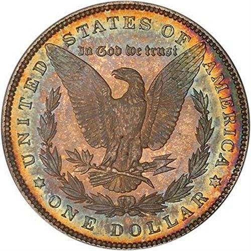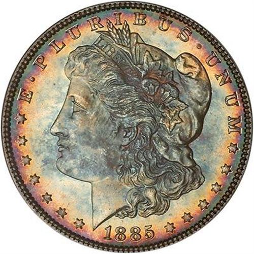 1885 Morgan Dollar. A lovely Superb Gem that has radiant blazing multicolor toning on top of booming mirror reflection. Lustrous and sharply struck with top-quality virtually pristine fields. No power of will or muscle can save this coin from strong competitive action, so prepare your bids with that in mind. (#7159)