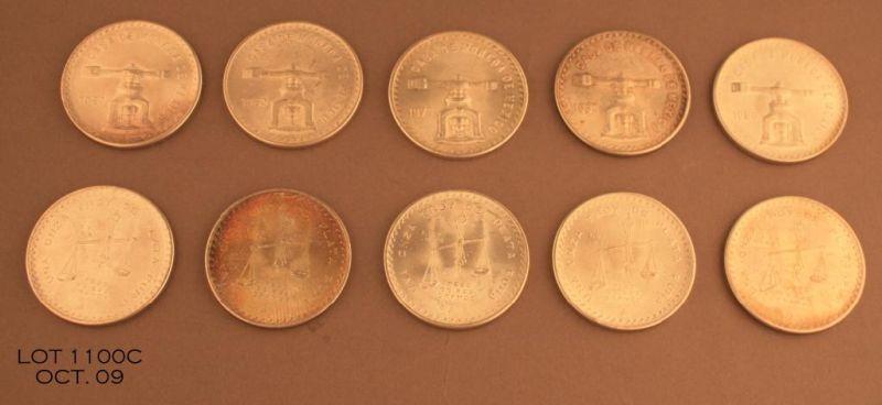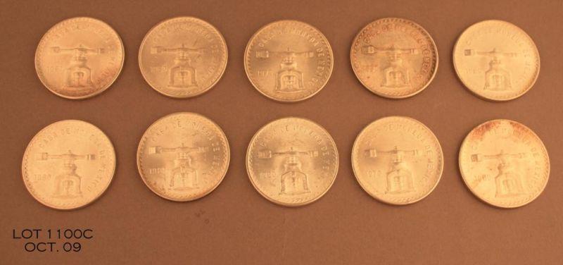 Lot 1100C (9IQ-37): Lot of ten Mexican one Troy ounce rounds, two dated 1979 and eight dated 1980 in circulated very good condition. Est.: $150-$250.