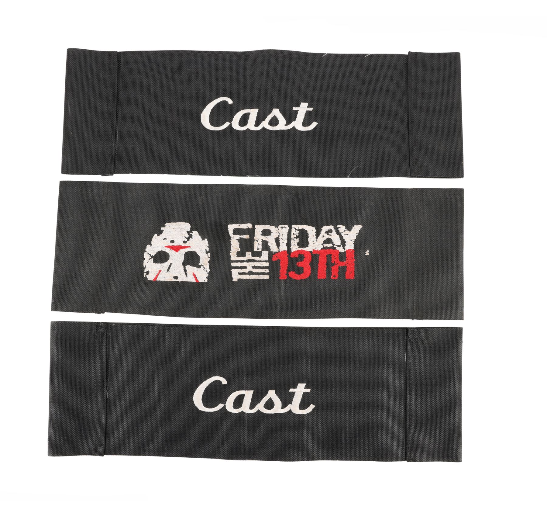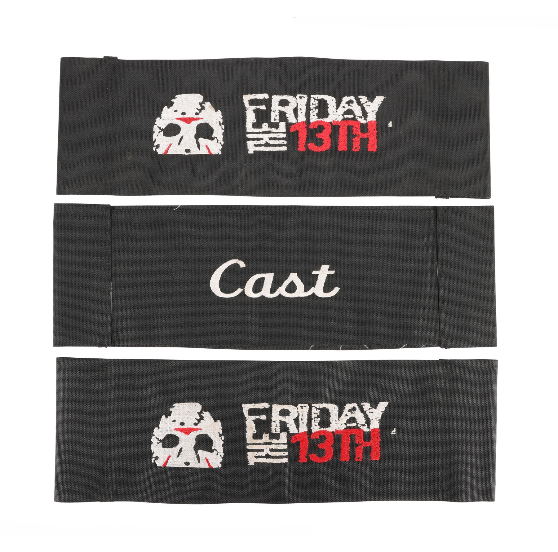 A set of three cast chair backs from Marcus Nispel's horror reboot Friday the 13th. Chair backs are placed onto chairs assigned for cast and certain crew members to sit on during filming. Made of woven black canvas, the front of each chair back has the word "Cast" embroidered in white thread. The back of each chair back has the film's title and a depiction of the top half of Jason Voorhees' (Derek Mears) iconic hockey mask embroidered in white and red thread. Holes are present at both ends of each chair back, allowing them to be easily placed on a chair. The chair backs display minor scuffs and some loose threads but they remain in good condition. The lot comes with a studio certificate of authenticity. Dimensions: 56 cm x 18 cm x 3 cm (22" x 7" x 1 1/2")