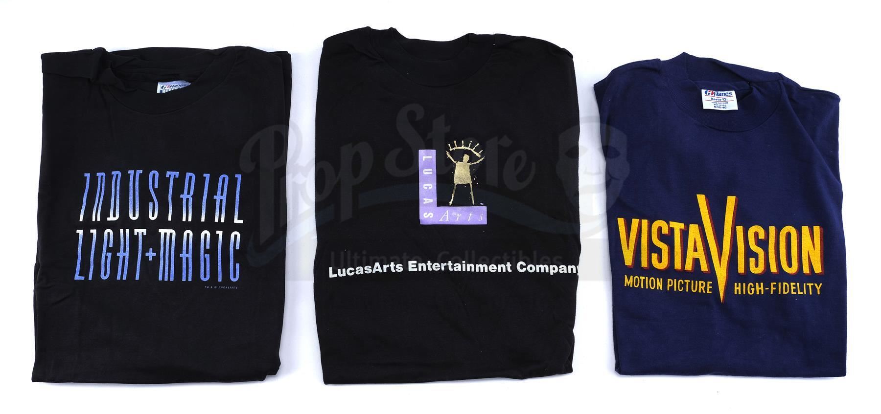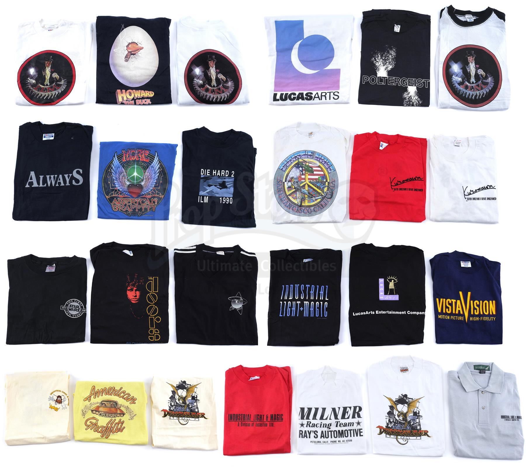 This lot will be auctioned on Thursday, July 1st. The auction will begin at 9:00am PDT and lots are sold sequentially via live auctioneer; tune in to the live streaming broadcast on auction day to follow the pace. Note other lots in the auction may close on June 29th or June 30th. A large lot of crew apparel issued to the staff of Industrial Light & Magic (ILM). This lot consists of 23 cotton blend shirts and one sweater in a variety of colors and styles. They feature several embossed graphics for various divisions of the effects company as well as crew shirts for films in franchises such as Star Wars, Star Trek, American Graffiti, Dragonslayer, and Poltergeist. These shirts show signs of wear from age and use, but remain in excellent overall condition. Estimate: $500 - 700