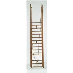 Lot # 1113: INTERESTING SUPPLY SLED. Iron runners, oak construction with thirteen spindle top, one missing. This sled was used to transport produce from the market to home across frozen water. SIZE: 67” l x 13: w. CONDITION: Very good. 9-97527