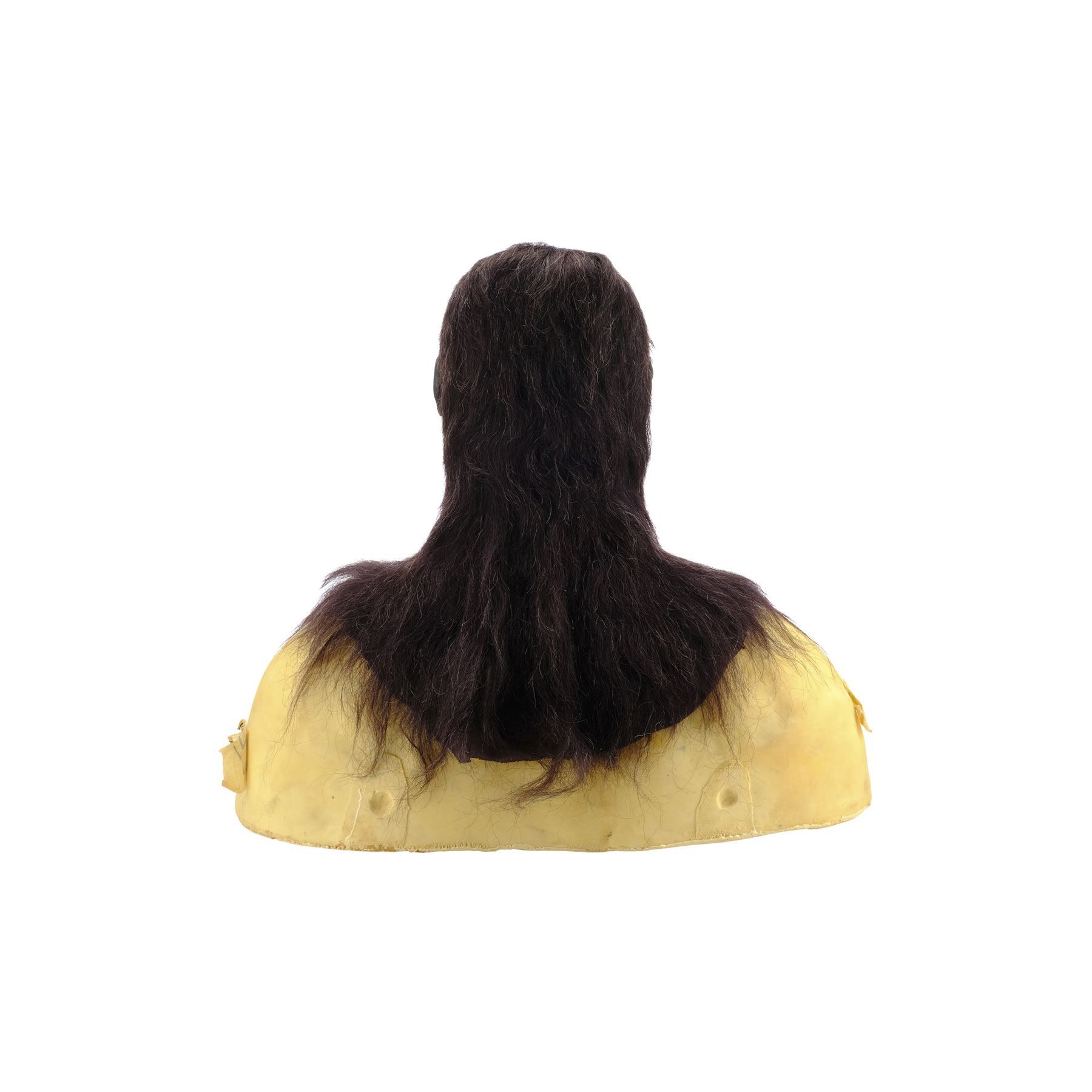 This lot consists of four bundles of dark-brown synthetic hair; a black-painted foam bust with carved eyes and teeth labeled "CHAD B" and "CHAD BANNON HAIR COWL''; a dark-brown synthetic hair cowl with snap buttons and foam padding; and a black-painted latex foam face covering adhered to the bust. It exhibits grime and label adhesion loss. Dimensions: 25" x 13.5" x 22" (63.5 cm x 34.5 cm x 56 cm)