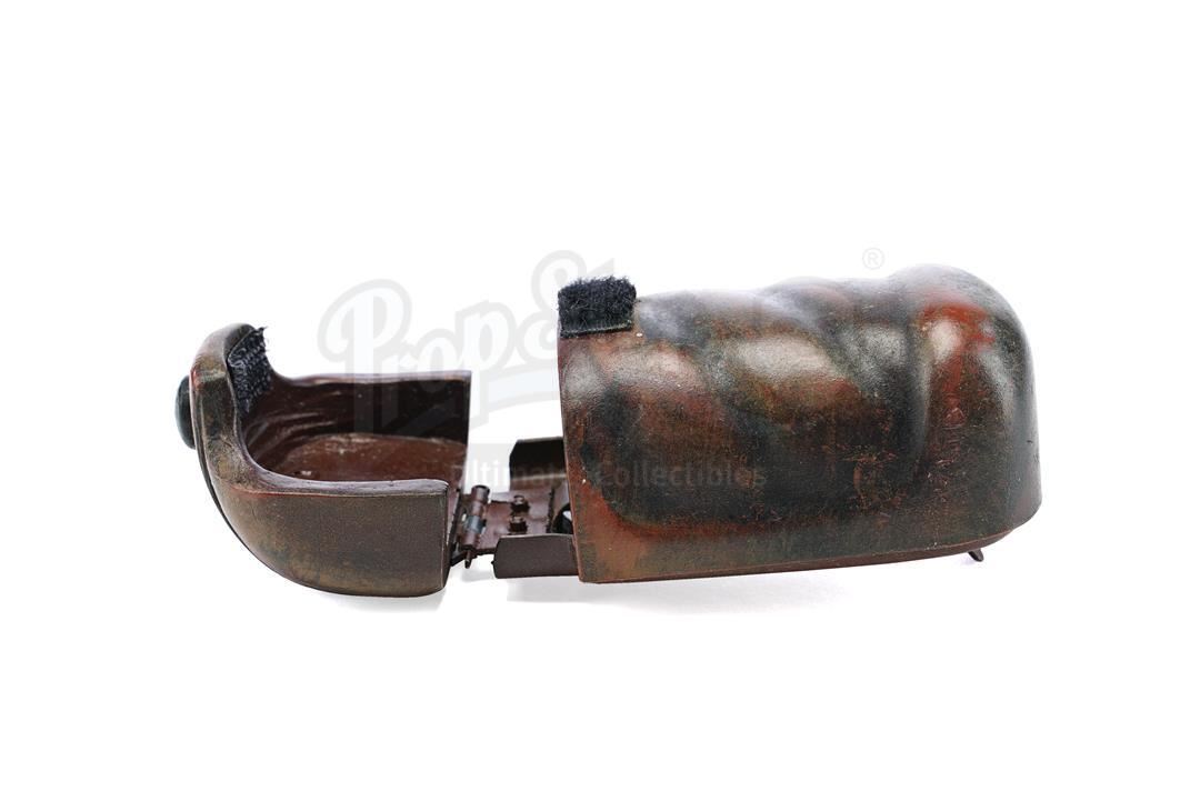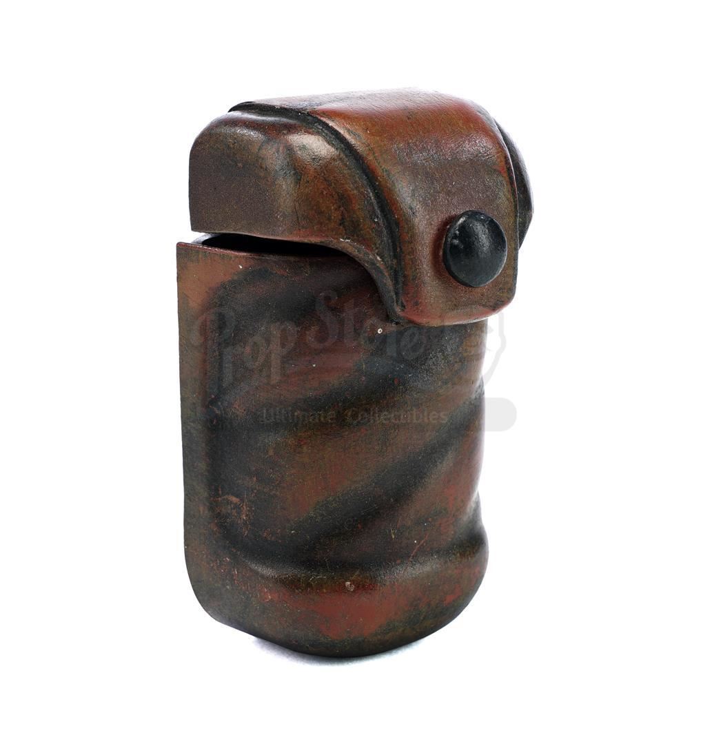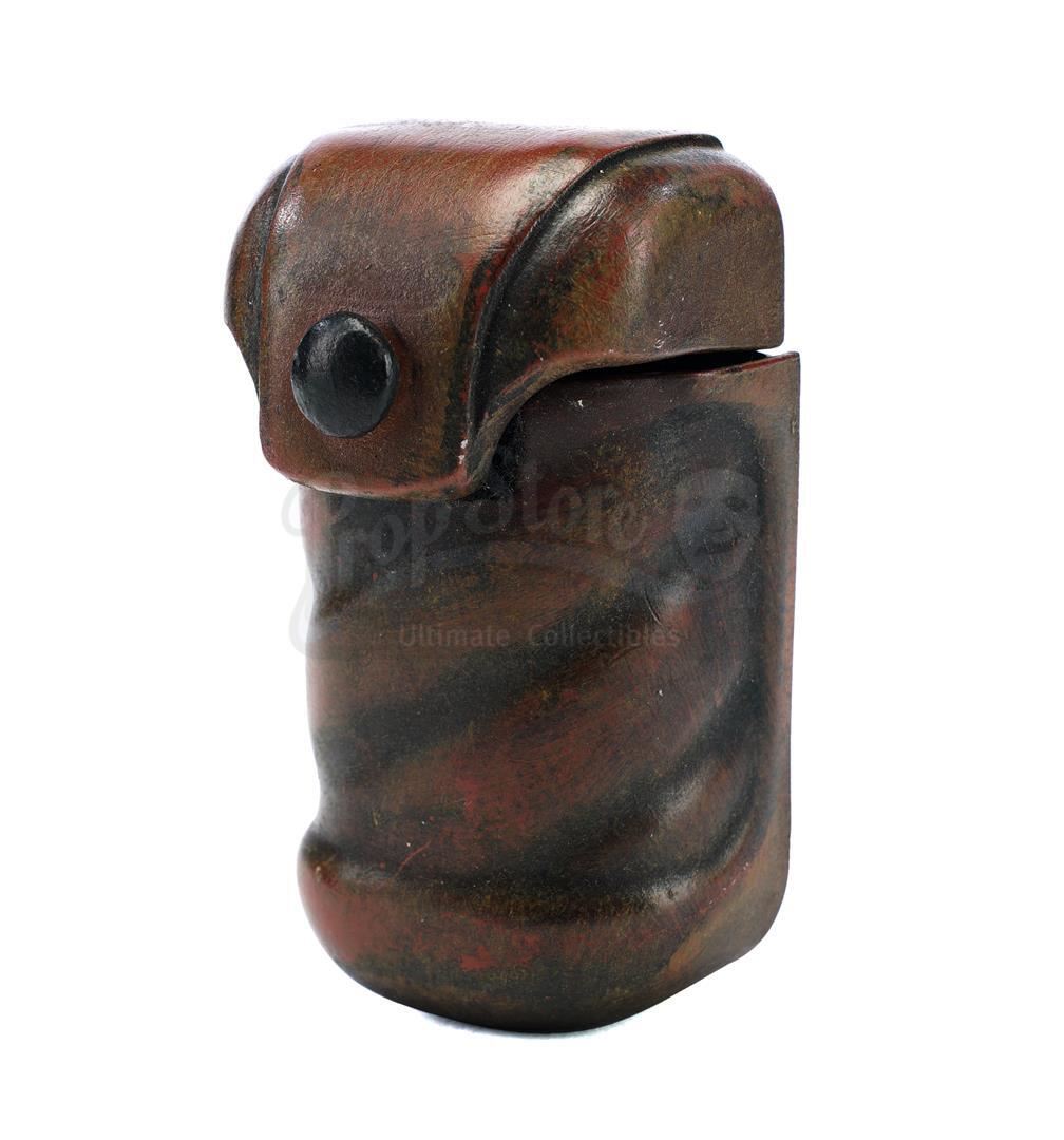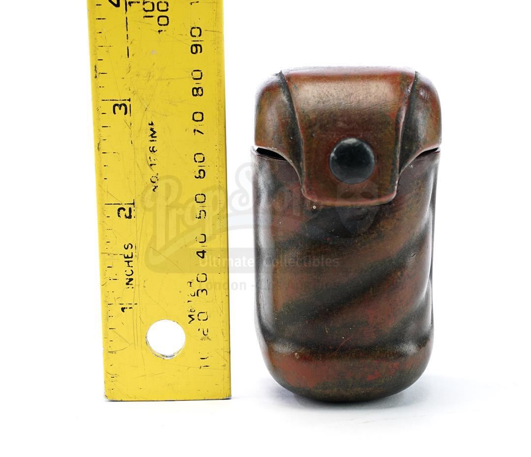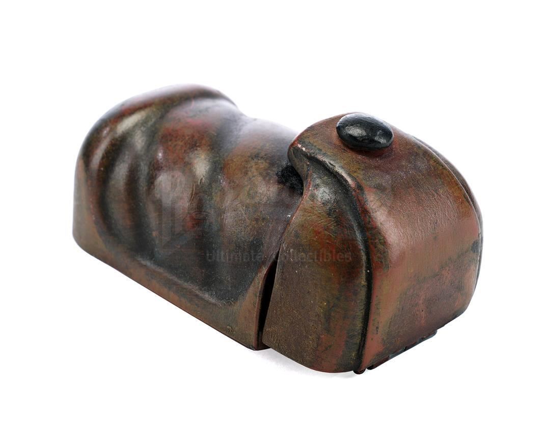This lot will be auctioned on Thursday, July 1st. The auction will begin at 9:00am PDT and lots are sold sequentially via live auctioneer; tune in to the live streaming broadcast on auction day to follow the pace. Note other lots in the auction may close on June 29th or June 30th. A Jedi utility pouch from George Lucas' Star Wars: The Phantom Menace. Jedi, including Qui-Gon Jinn (Liam Neeson) and Obi-Wan Kenobi (Ewan McGregor), wore pouches on their utility belts throughout the film. This small resin pouch with wavy ridges is painted brown to resemble leather with a metal button. It exhibits minor wear to the paint from age but remains in otherwise good overall condition. Dimensions: 4" x 2" x 2" (10.25 cm x 5 cm x 5 cm) Estimate: $1,500 - 2,500