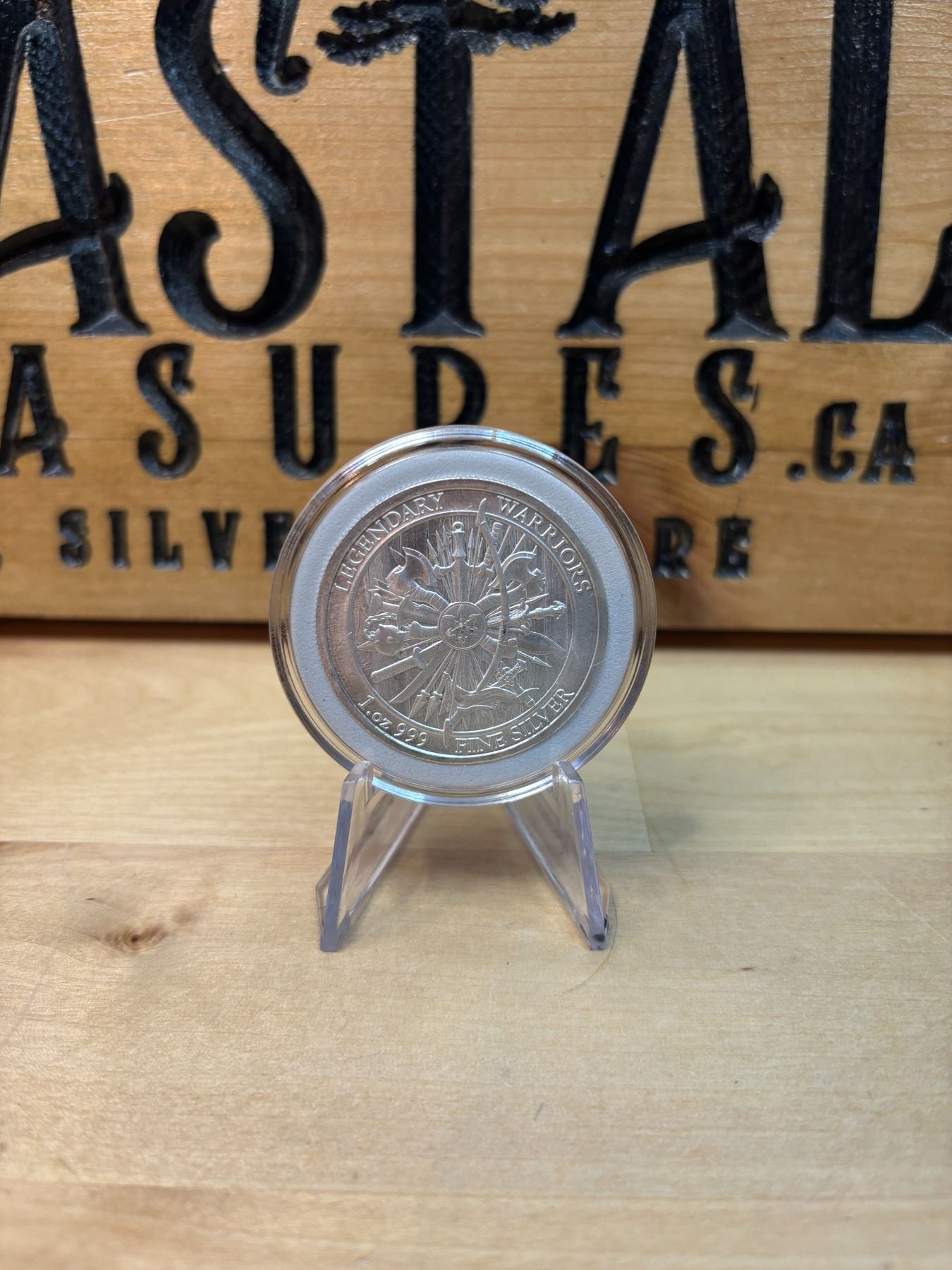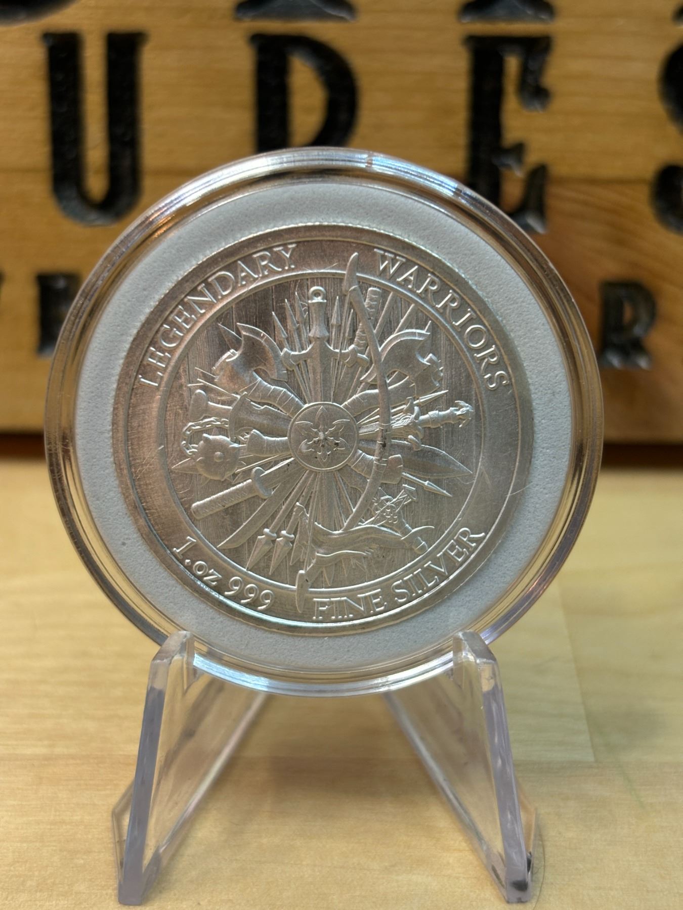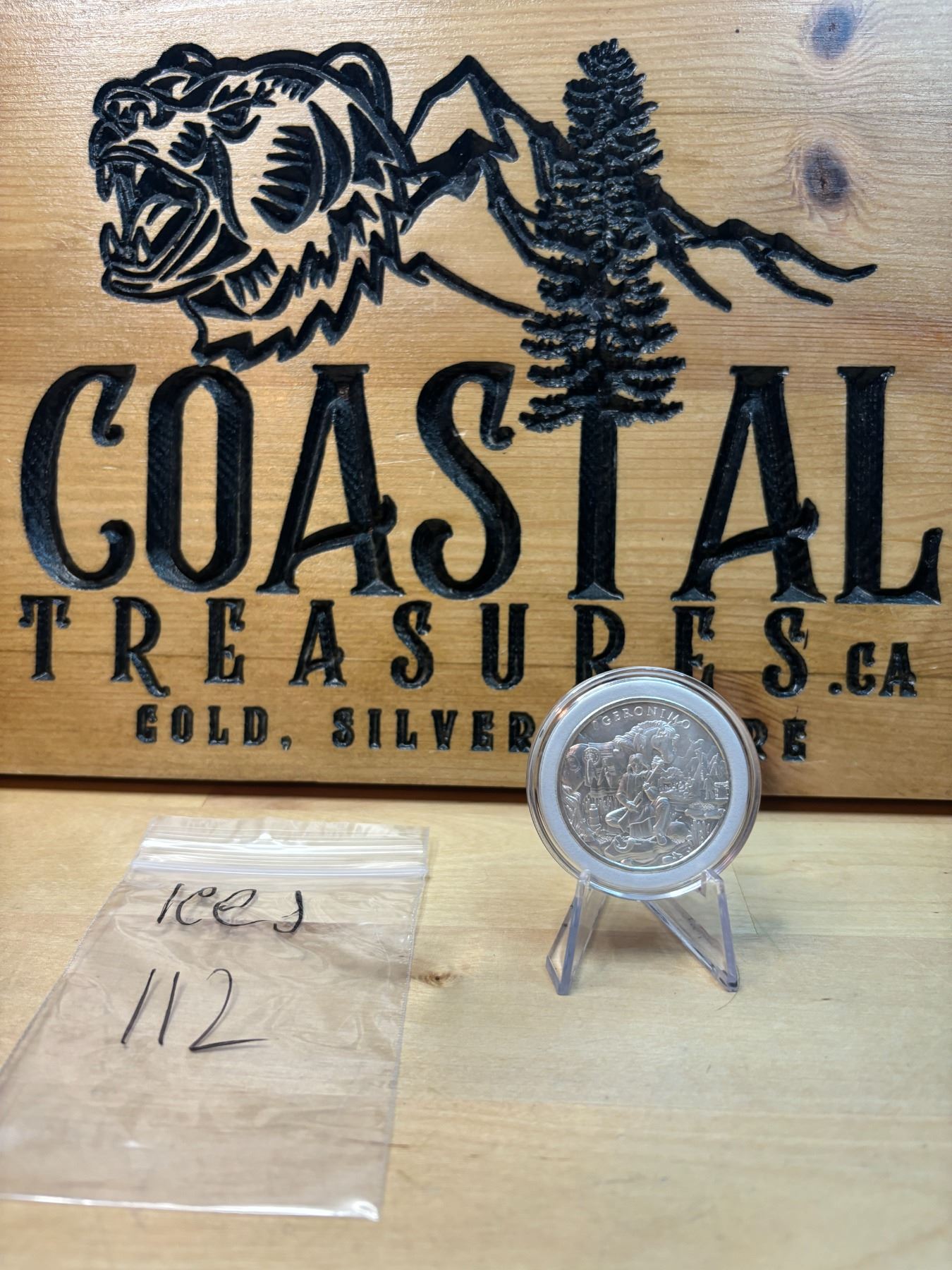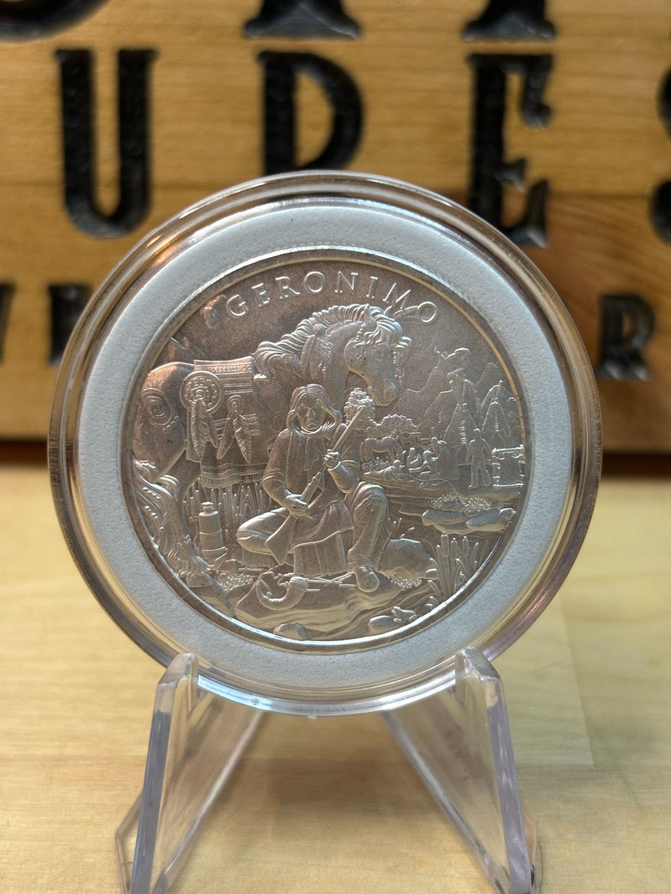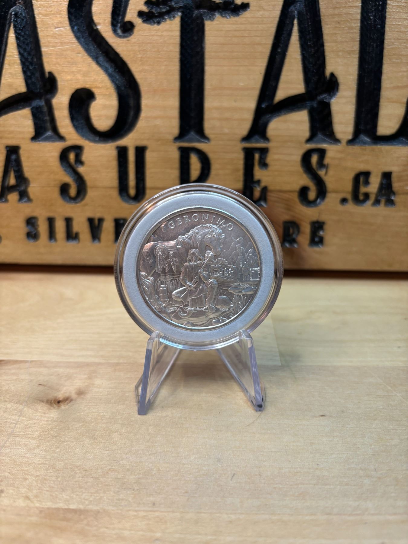 The 1 oz Geronimo Silver Round is a 1-ounce silver round made from 99.9% pure silver. It typically features a detailed design of Geronimo, the legendary Apache leader and warrior. Known for his resistance against both Mexican and U.S. military forces during the Apache Wars, Geronimo is an iconic figure in Native American history. The round may depict his image in a dramatic, traditional style, symbolizing his leadership and defiance. This silver round is highly collectible, especially among those interested in Native American history, and is valued for both its silver content and its tribute to Geronimo’s legacy.