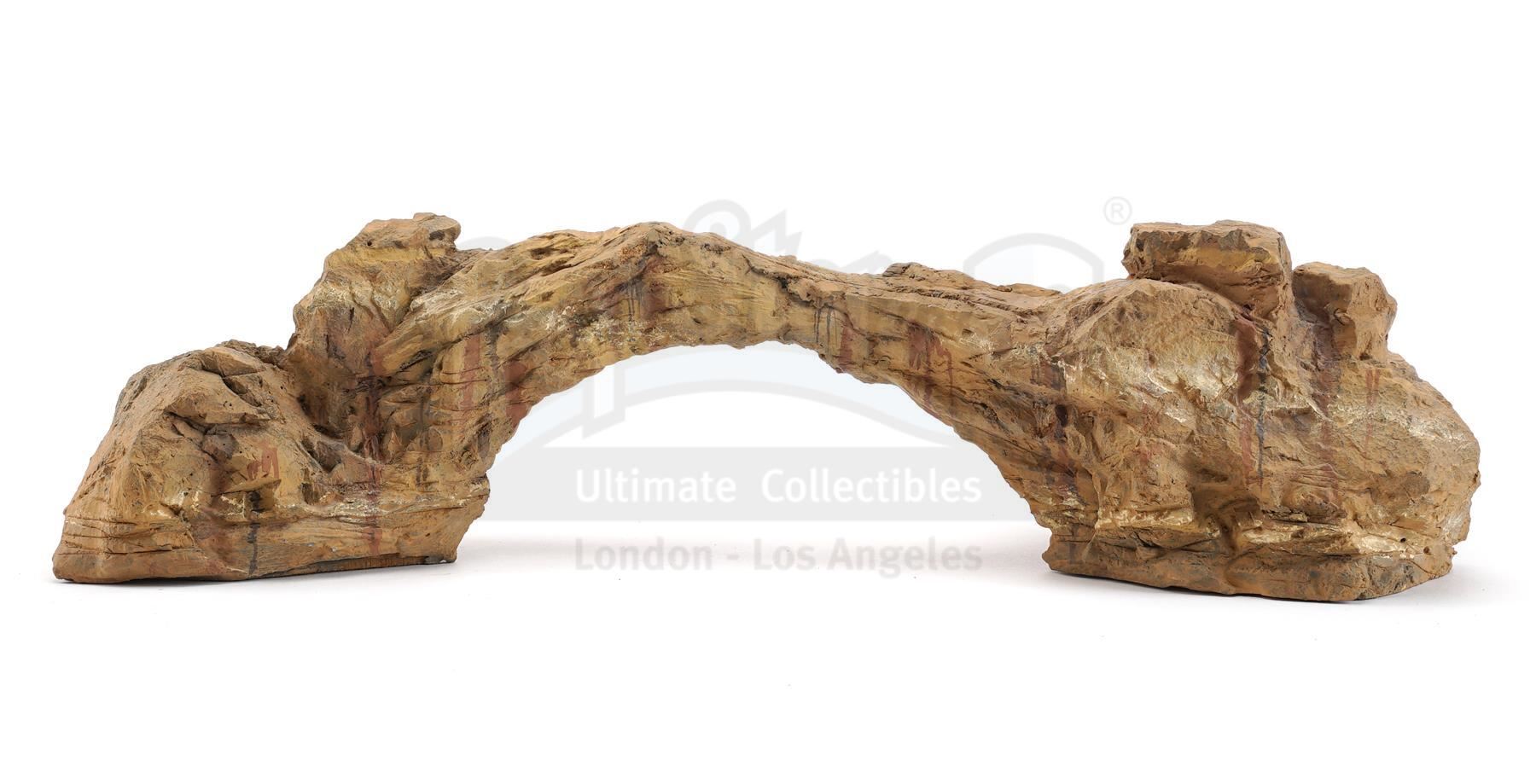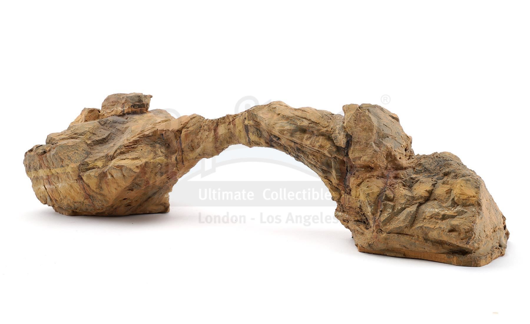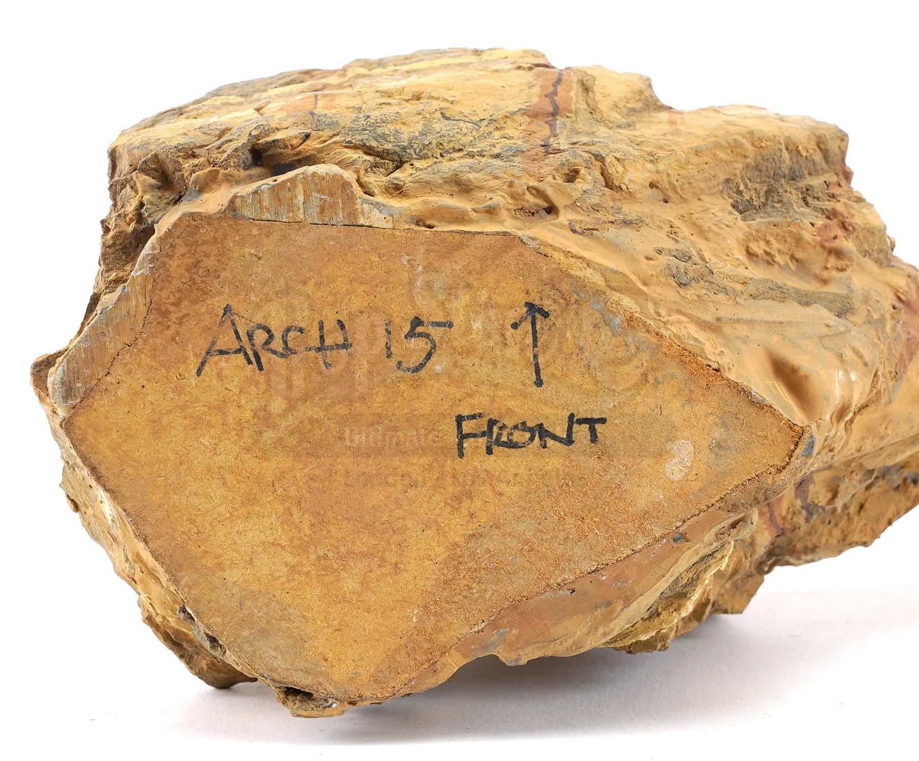 This lot will be auctioned on Thursday, July 1st. The auction will begin at 9:00am PDT and lots are sold sequentially via live auctioneer; tune in to the live streaming broadcast on auction day to follow the pace. Note other lots in the auction may close on June 29th or June 30th. A podracing rock arch model miniature from George Lucas' Star Wars: The Phantom Menace. Anakin Skywalker (Jake Lloyd) won his freedom in a deadly, high-speed podrace through the rocky deserts of Tatooine. Industrial Light & Magic (ILM) created physical models of rock elements for the sequence, with images of the models' textures projected onto digital forms to create the final look of the elements for the podracing environment. This rock arch was built using mixed media, including foam and wood labeled "Arch 15 Front" and painted in shades of brown with sculpted cracks and purposeful weathering applied throughout. The miniature rests on a wooden base and is in excellent overall condition with minimal wear from production and age. Dimensions: 4.5" x 18.5" x 5" (11.5 cm x 47 cm x 12.75 cm) Estimate: $2,000 - 3,000