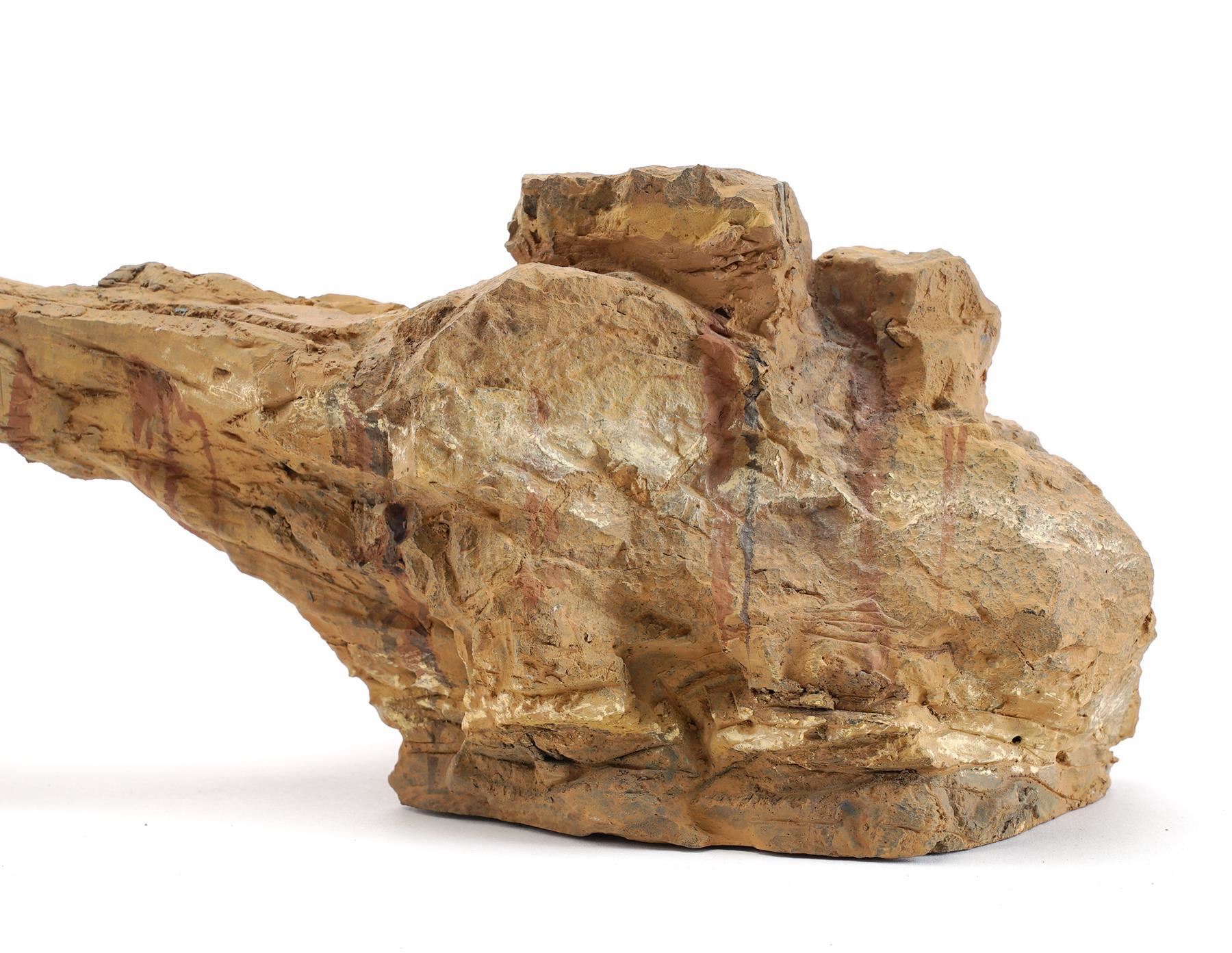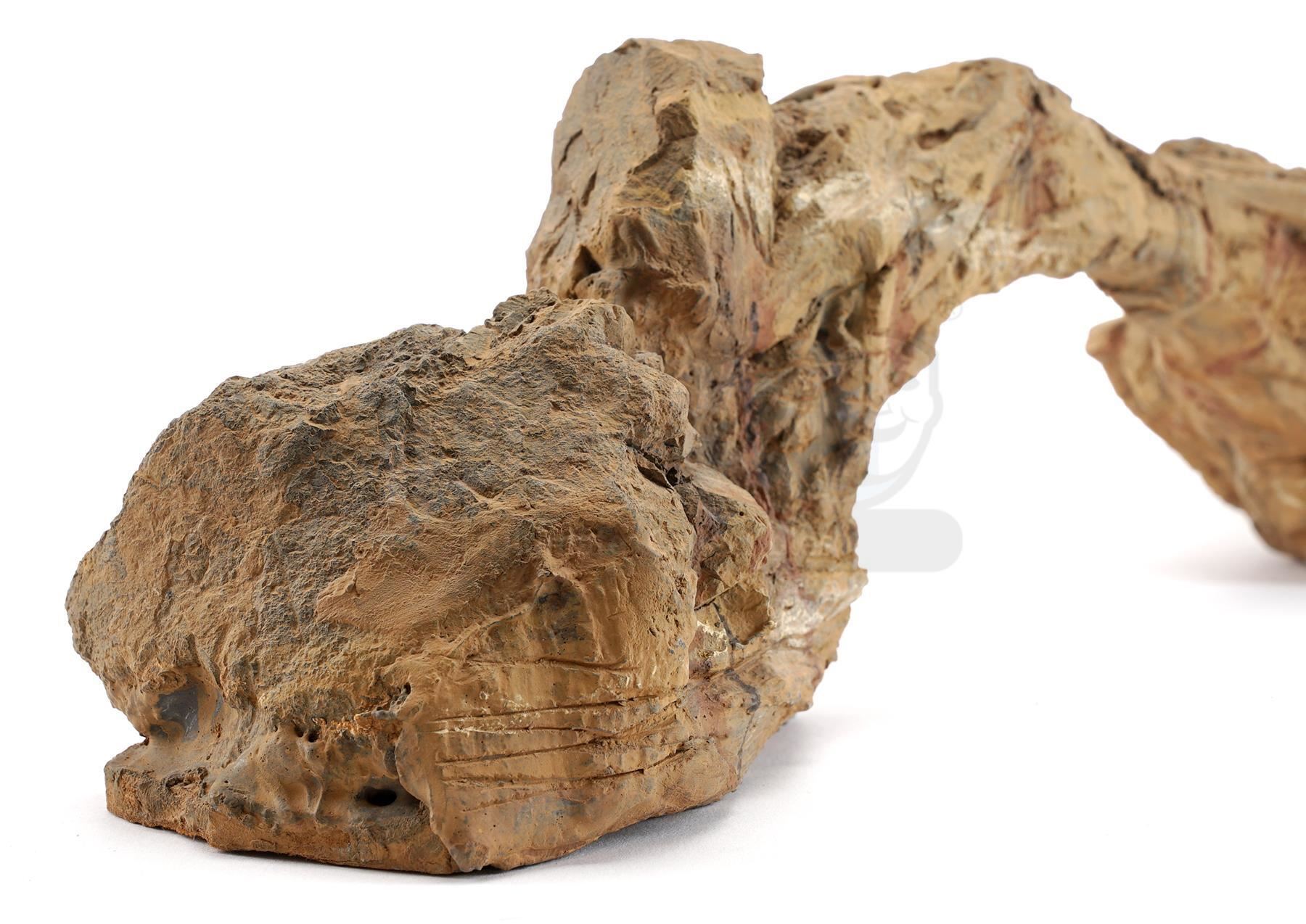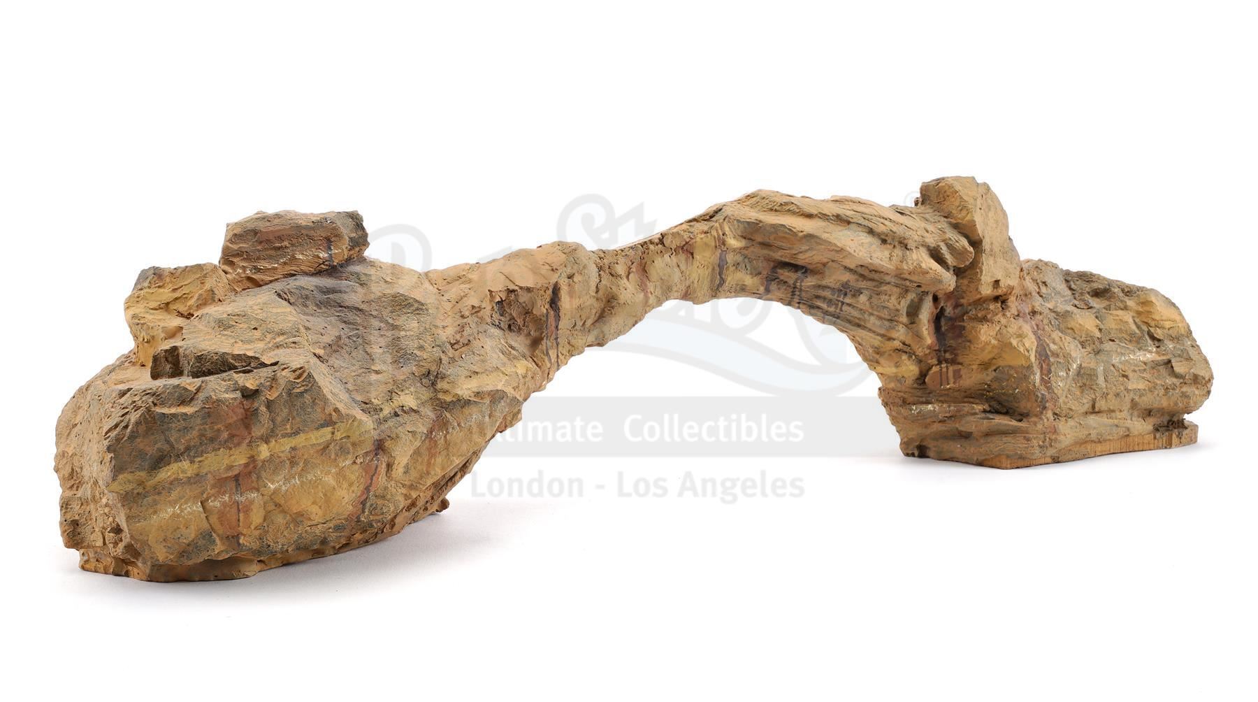 This lot will be auctioned on Thursday, July 1st. The auction will begin at 9:00am PDT and lots are sold sequentially via live auctioneer; tune in to the live streaming broadcast on auction day to follow the pace. Note other lots in the auction may close on June 29th or June 30th. A podracing rock arch model miniature from George Lucas' Star Wars: The Phantom Menace. Anakin Skywalker (Jake Lloyd) won his freedom in a deadly, high-speed podrace through the rocky deserts of Tatooine. Industrial Light & Magic (ILM) created physical models of rock elements for the sequence, with images of the models' textures projected onto digital forms to create the final look of the elements for the podracing environment. This rock arch was built using mixed media, including foam and wood labeled "Arch 15 Front" and painted in shades of brown with sculpted cracks and purposeful weathering applied throughout. The miniature rests on a wooden base and is in excellent overall condition with minimal wear from production and age. Dimensions: 4.5" x 18.5" x 5" (11.5 cm x 47 cm x 12.75 cm) Estimate: $2,000 - 3,000