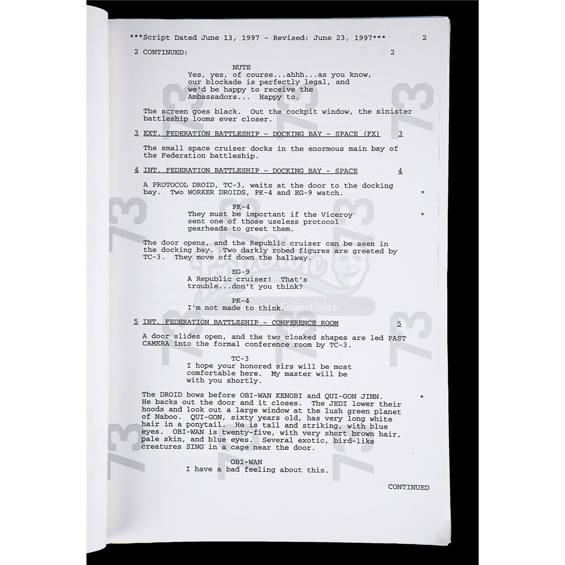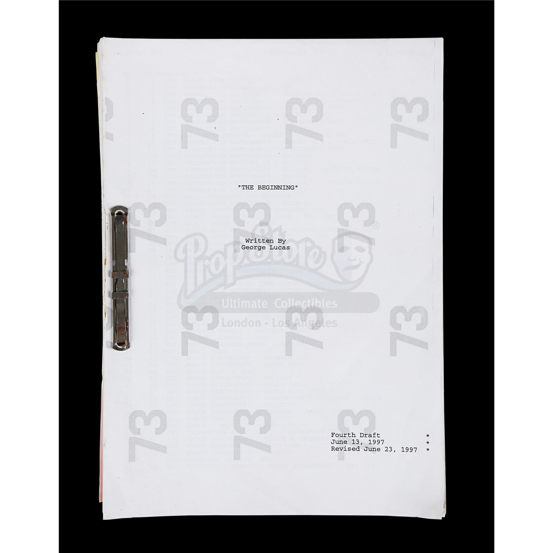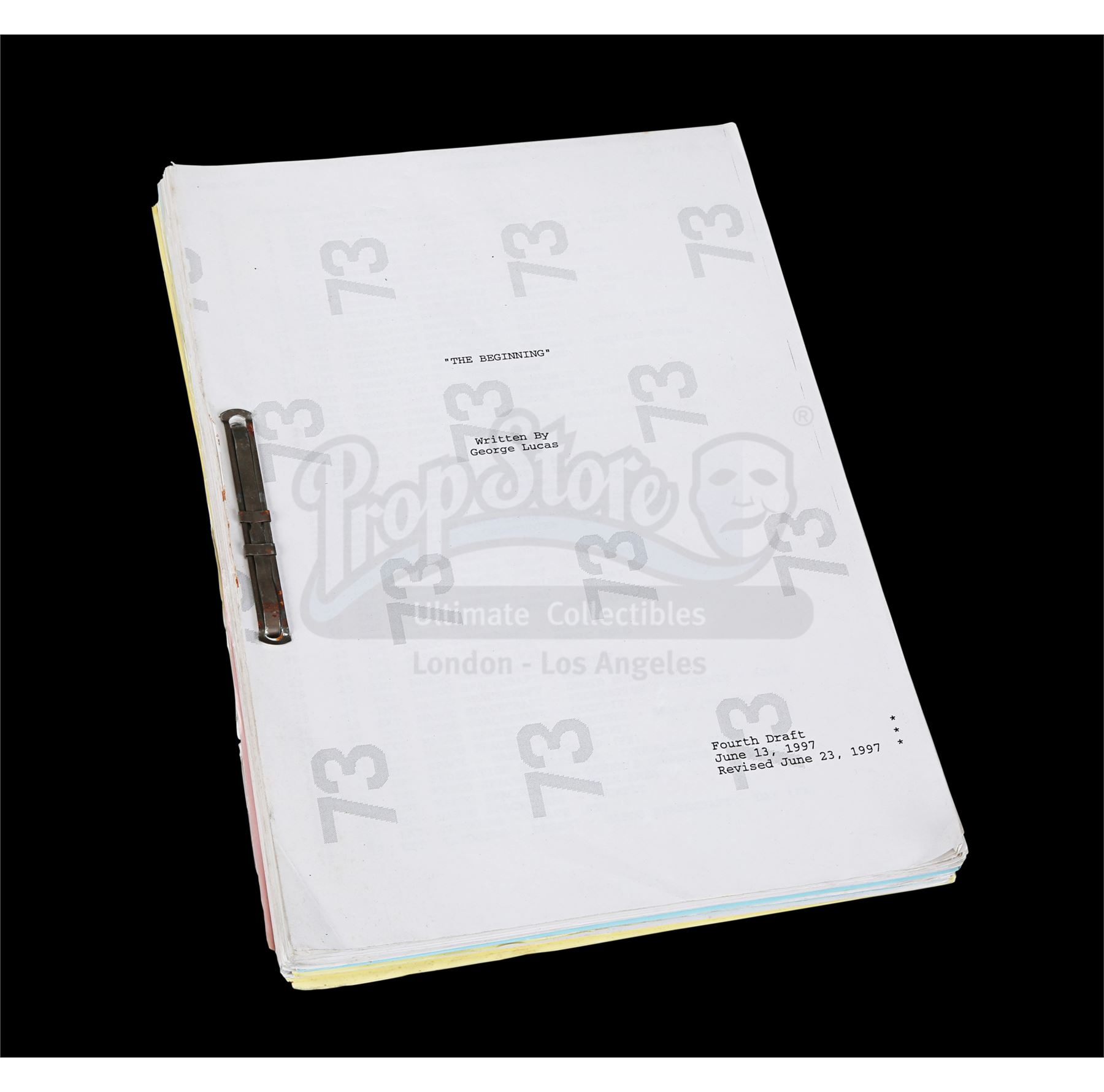 This lot will be auctioned on Thursday, July 1st. The auction will begin at 9:00am PDT and lots are sold sequentially via live auctioneer; tune in to the live streaming broadcast on auction day to follow the pace. Note other lots in the auction may close on June 29th or June 30th. A revised script from the production of George Lucas' Star Wars: The Phantom Menace. This revised fourth draft script is dated June 23, 1997, features the film's working title "The Beginning," and is credited to Lucas. It is held together with a metal clip and consists of 126 unannotated pages, with four additional pages of scene breakdowns located at the front. Every page is marked with the issue number "73." This script remains in good overall condition, with light creasing, marks, and corrosion on the clip. Dimensions: 11.75" x 8.25" x 0.5" (29.5 cm x 21 cm x 1.5 cm) Estimate: $800 - 1,200