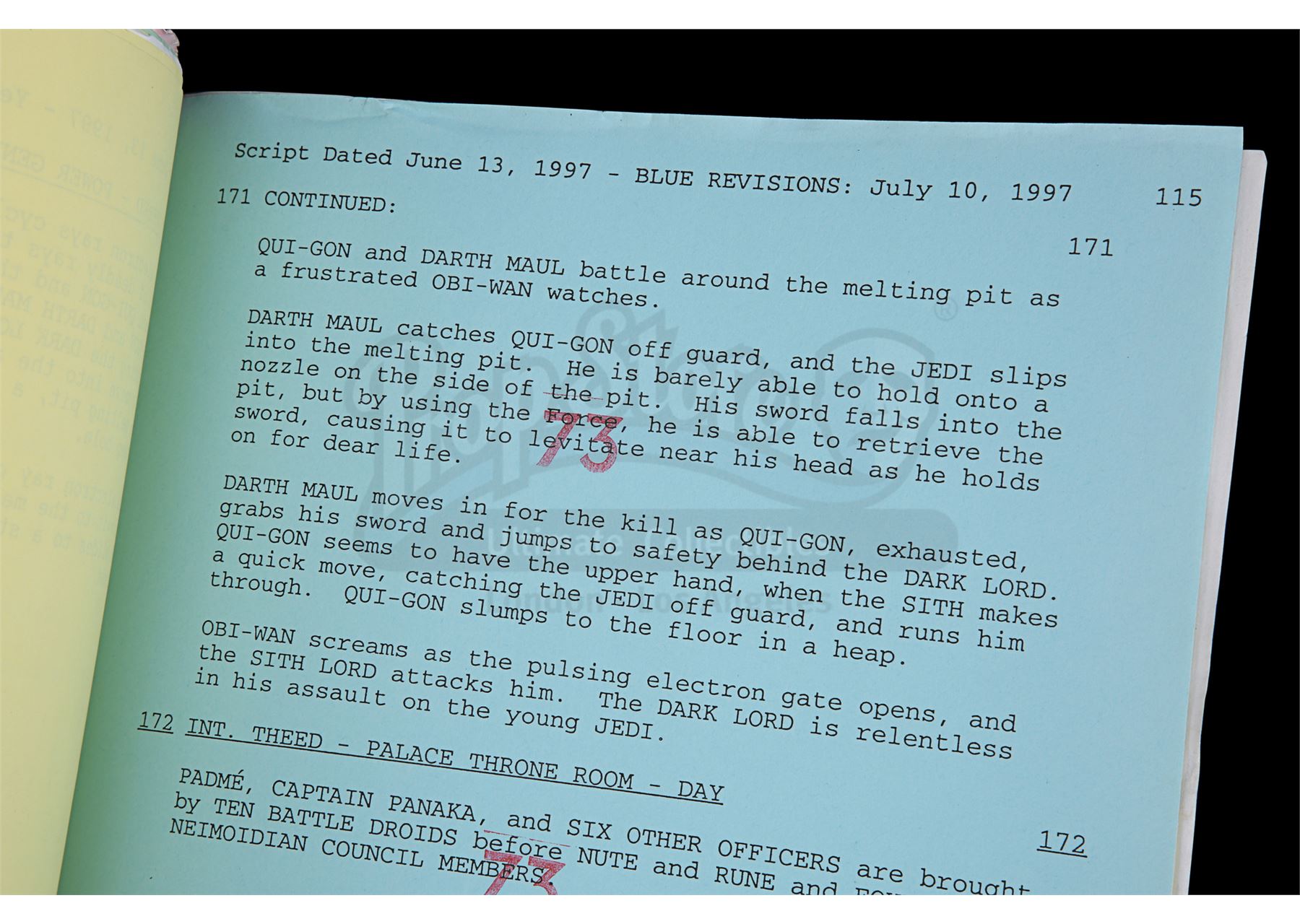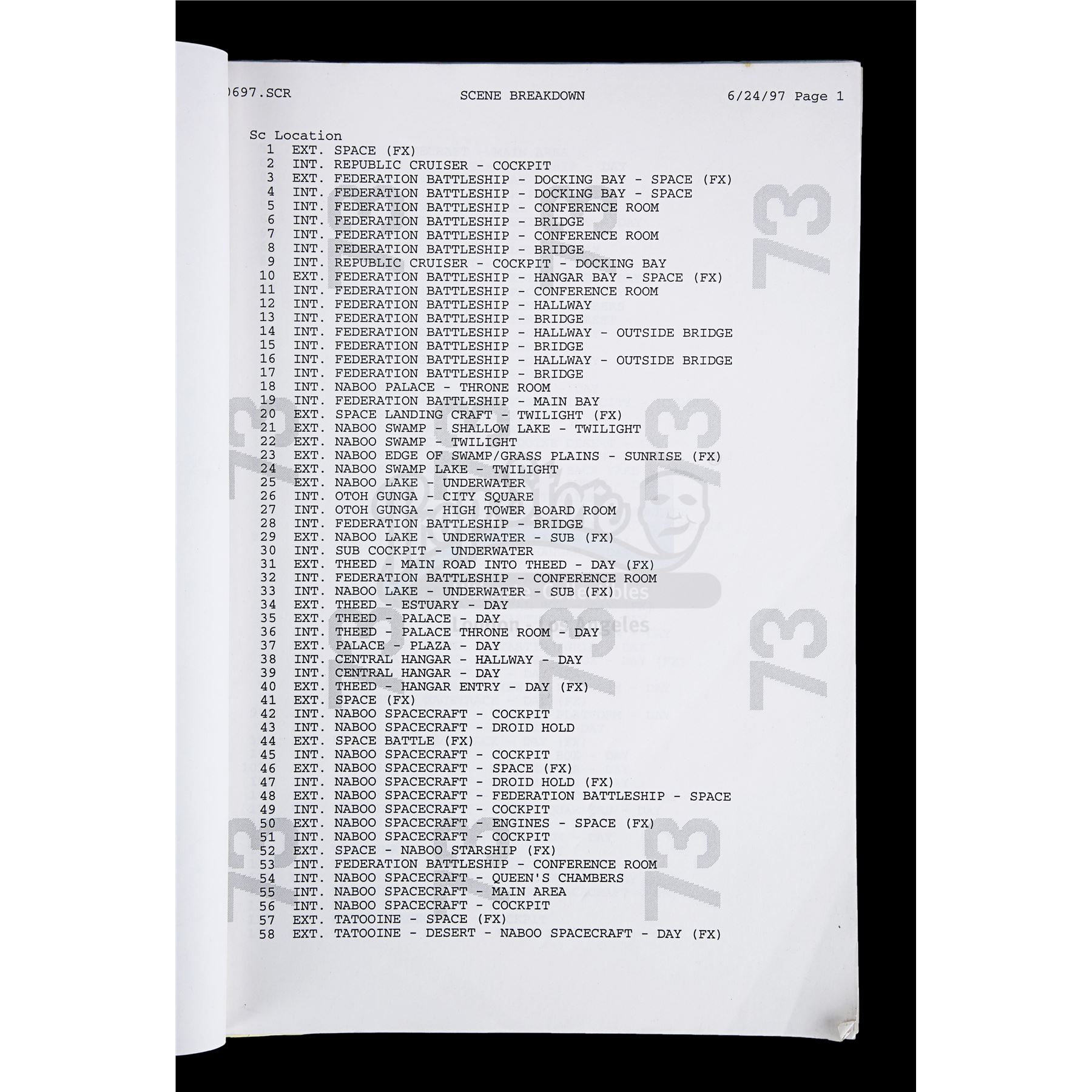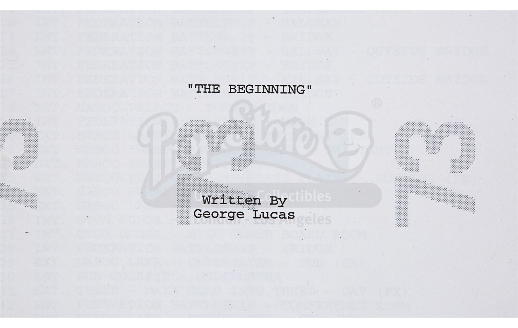 This lot will be auctioned on Thursday, July 1st. The auction will begin at 9:00am PDT and lots are sold sequentially via live auctioneer; tune in to the live streaming broadcast on auction day to follow the pace. Note other lots in the auction may close on June 29th or June 30th. A revised script from the production of George Lucas' Star Wars: The Phantom Menace. This revised fourth draft script is dated June 23, 1997, features the film's working title "The Beginning," and is credited to Lucas. It is held together with a metal clip and consists of 126 unannotated pages, with four additional pages of scene breakdowns located at the front. Every page is marked with the issue number "73." This script remains in good overall condition, with light creasing, marks, and corrosion on the clip. Dimensions: 11.75" x 8.25" x 0.5" (29.5 cm x 21 cm x 1.5 cm) Estimate: $800 - 1,200