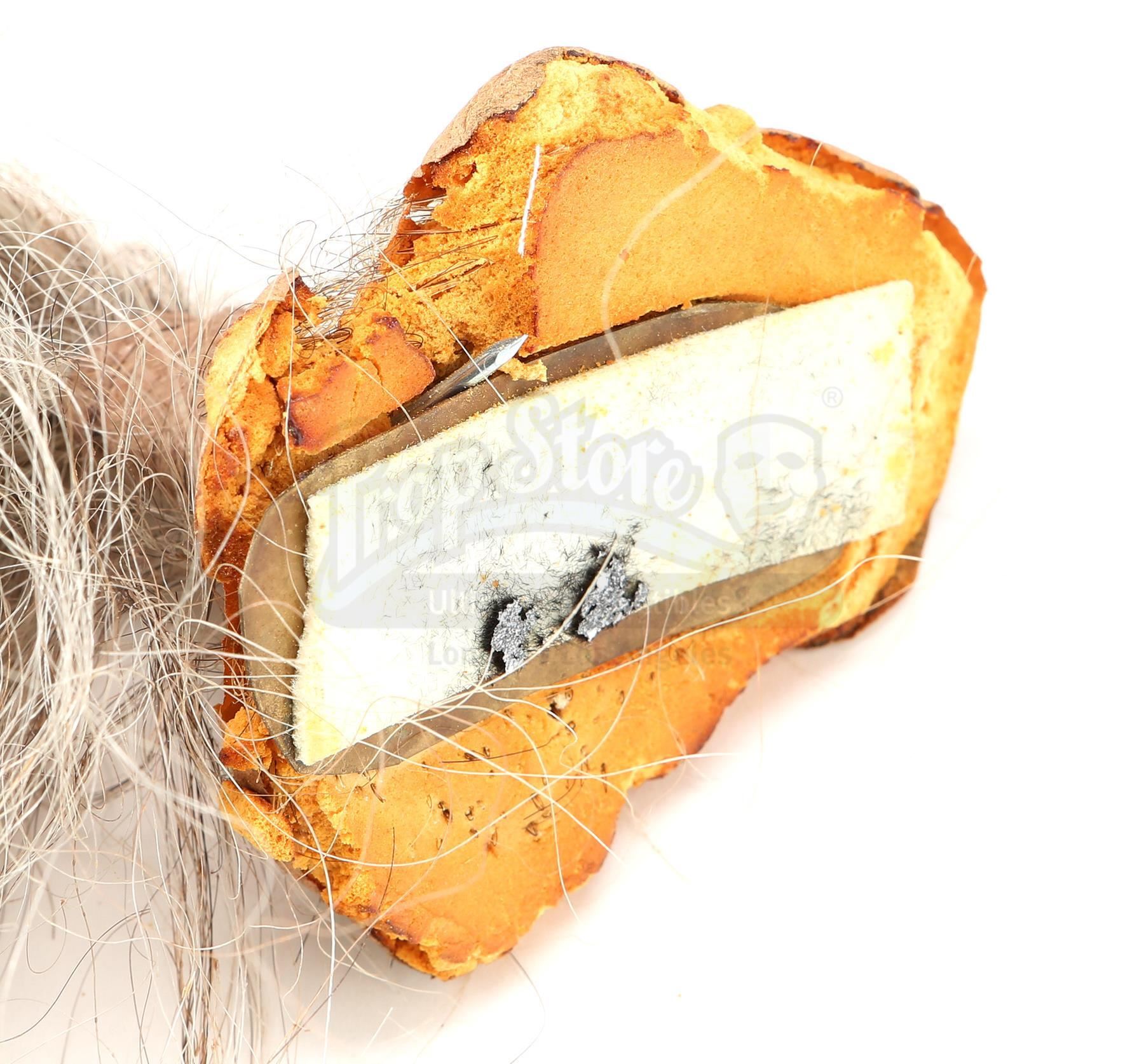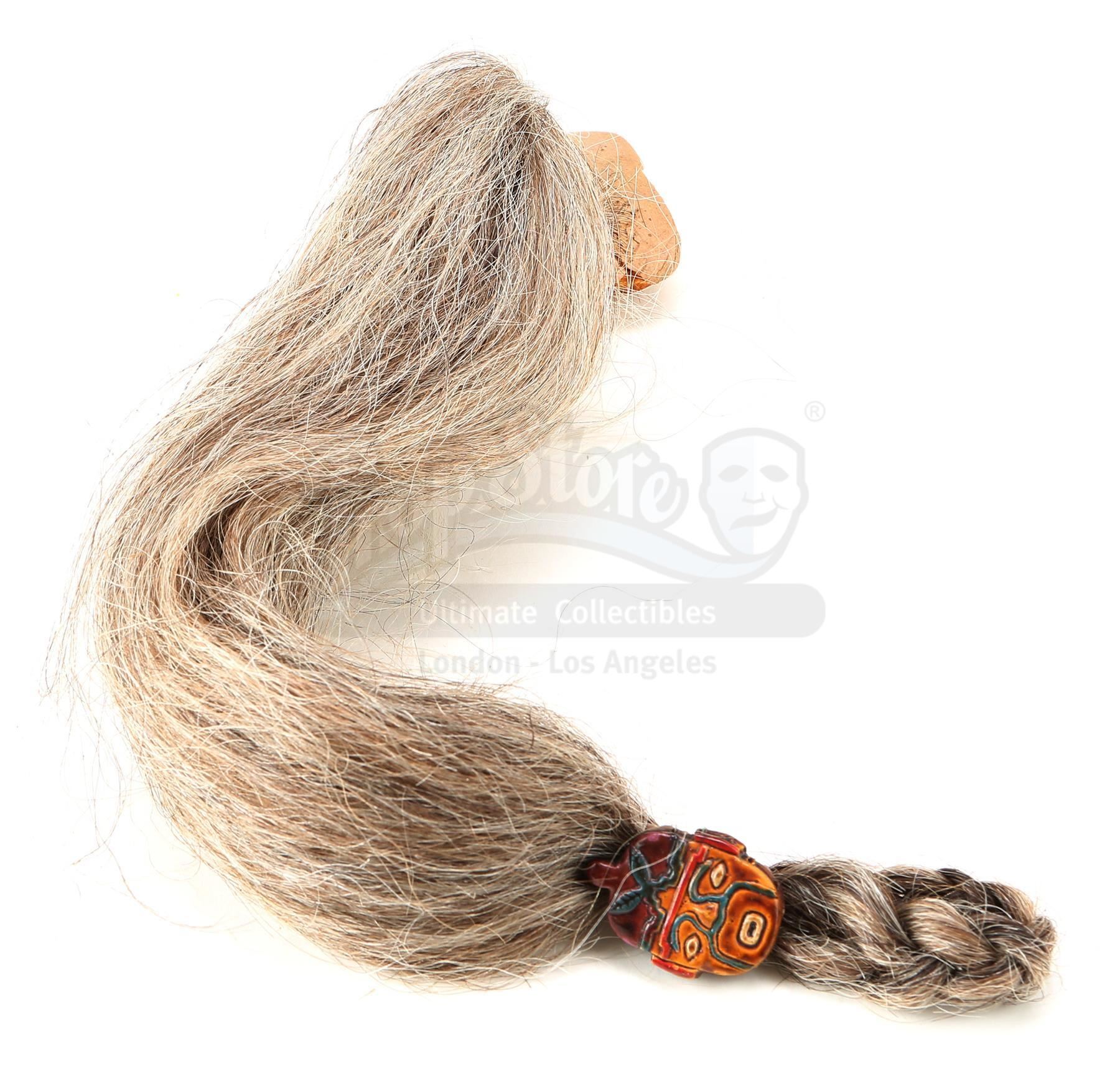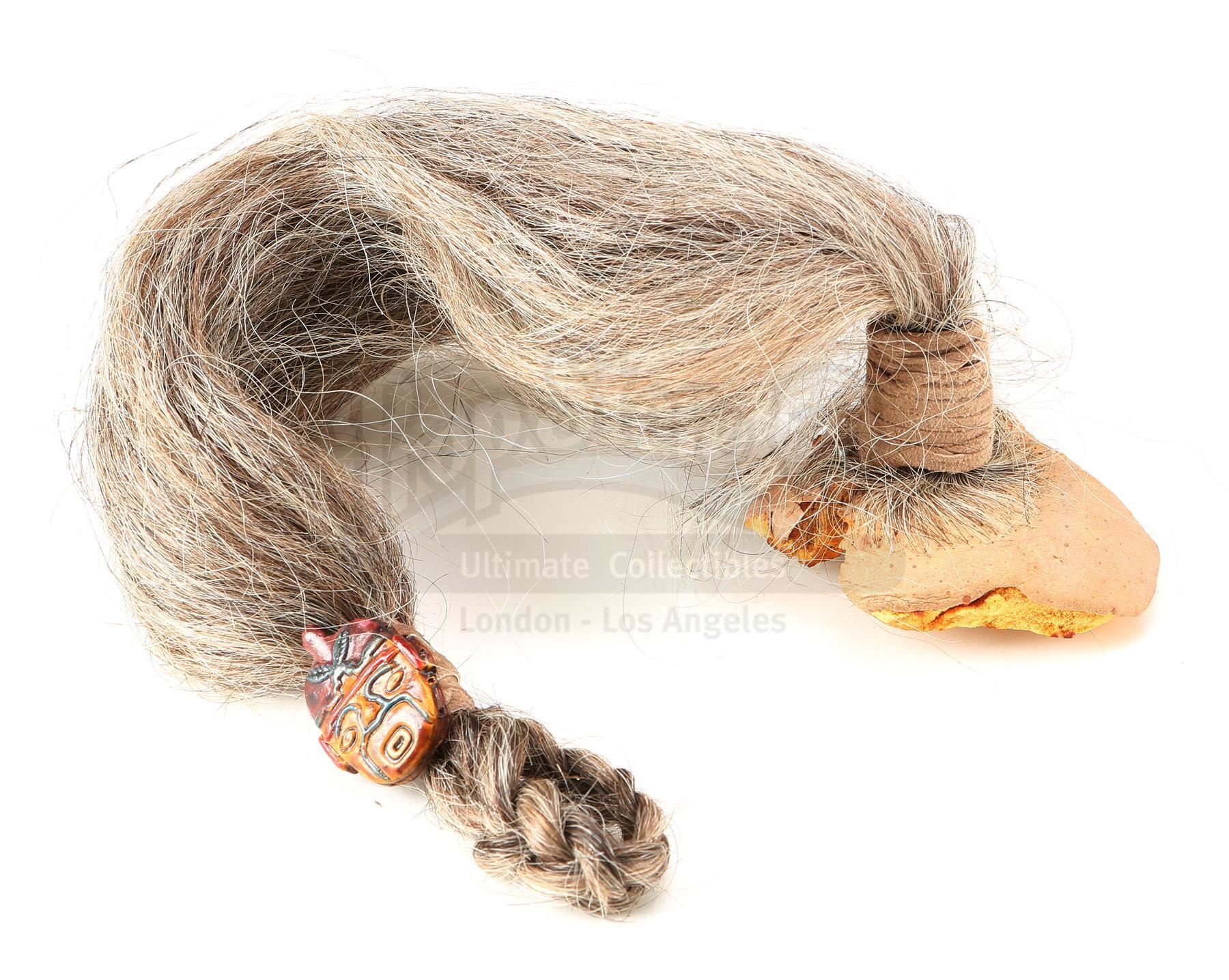 This lot will be auctioned on Thursday, July 1st. The auction will begin at 9:00am PDT and lots are sold sequentially via live auctioneer; tune in to the live streaming broadcast on auction day to follow the pace. Note other lots in the auction may close on June 29th or June 30th. Even Piell's (Michaela Cottrell) hair appliance from George Lucas' Star Wars: The Phantom Menace. Jedi Master Piell wore his signature braid while sitting on the Jedi Council. This appliance consists of a synthetic brown and gray hair braid affixed to a dense foam headpiece and wrapped with two leather bands, one of which features an otherworldly, multicolor resin totem. A metal bar and tape used to affix the headpiece protrude from the bottom. It is in good overall condition with the foam cracking from age and minor signs of production use throughout. Dimensions: 13" x 2" x 2" (33.25 cm x 5.25 cm x 5.25 cm) Estimate: $1,500 - 2,500