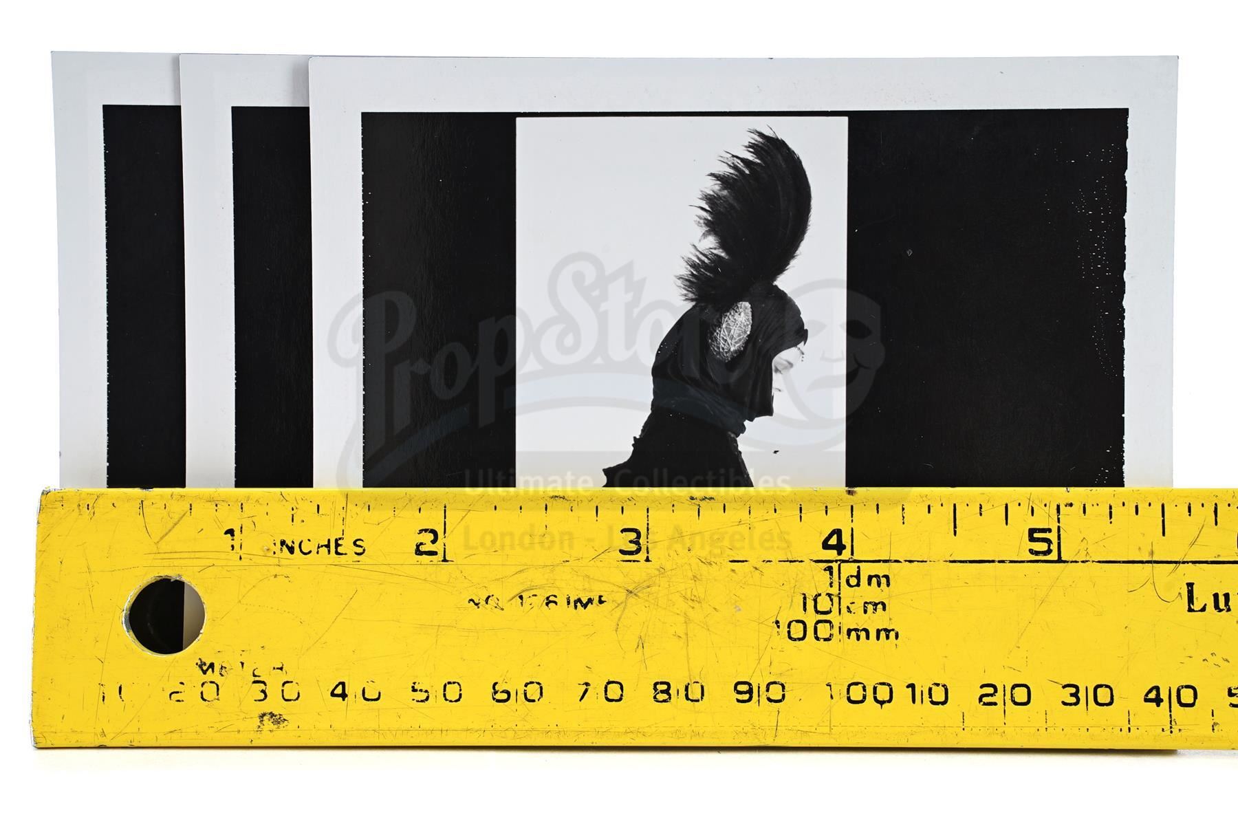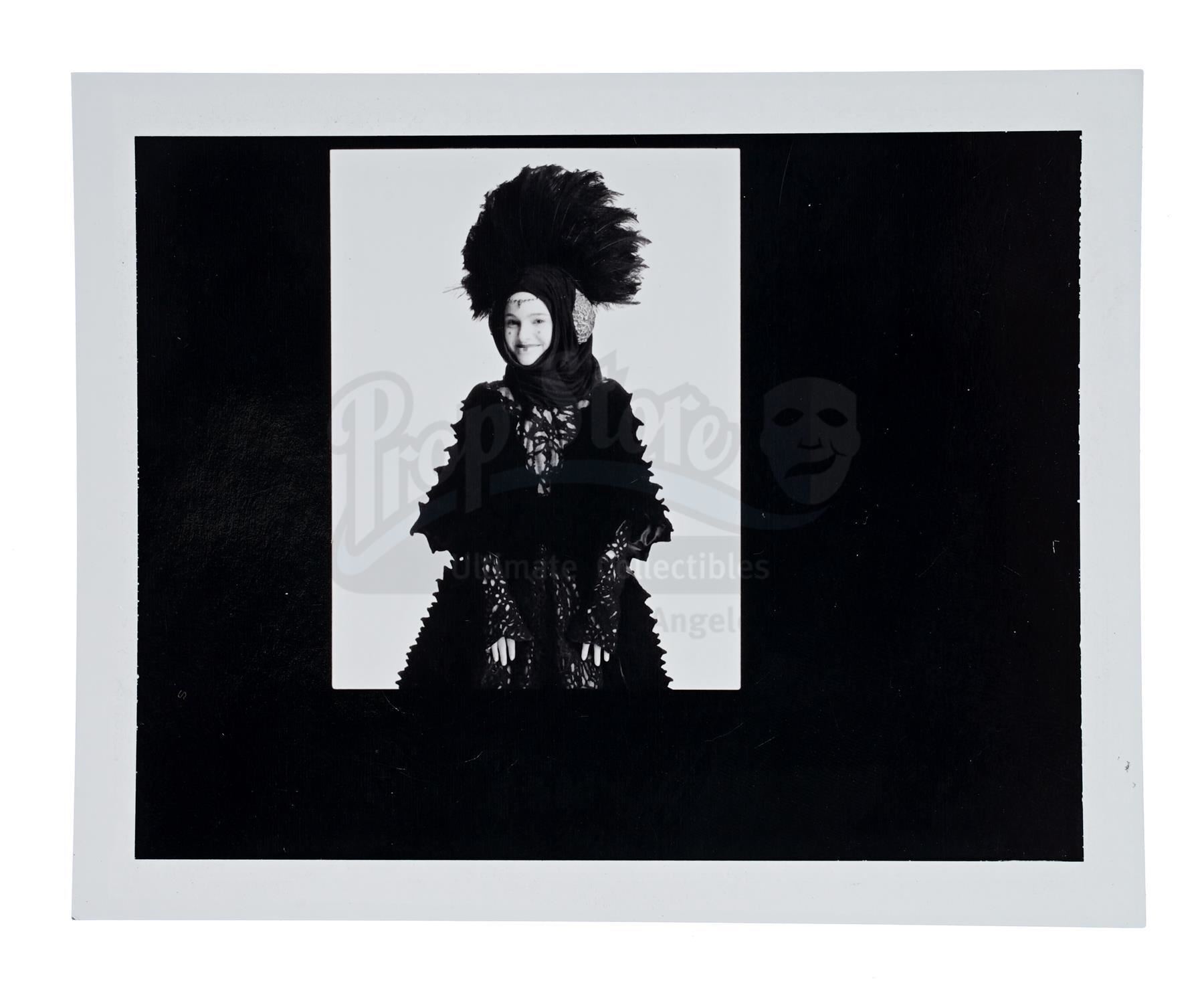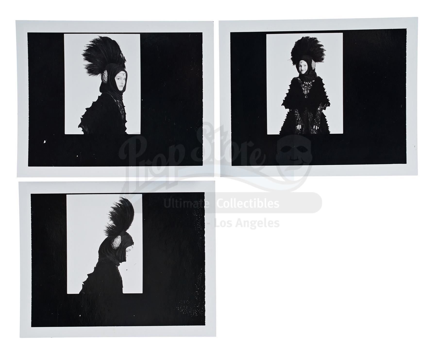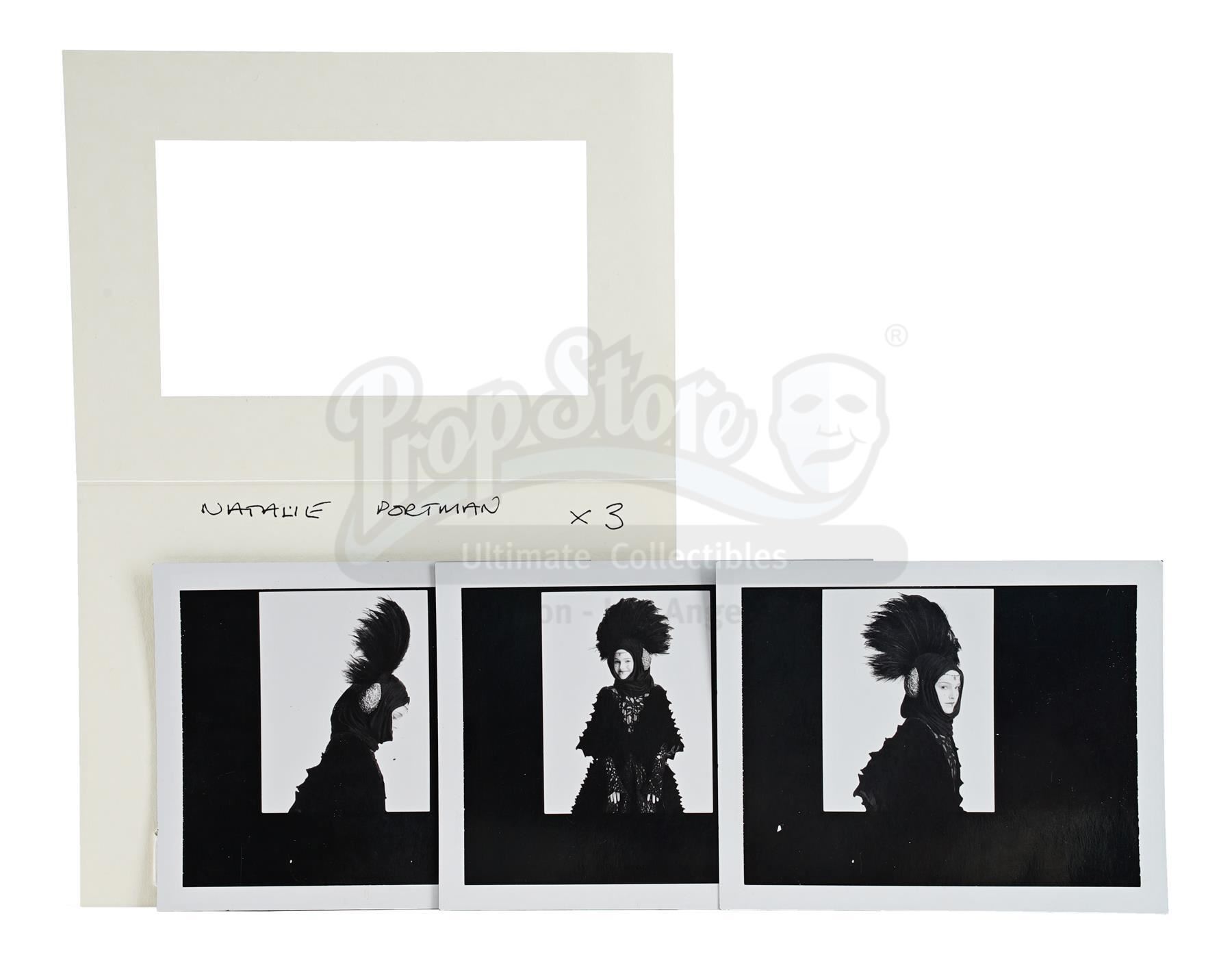 This lot will be auctioned on Thursday, July 1st. The auction will begin at 9:00am PDT and lots are sold sequentially via live auctioneer; tune in to the live streaming broadcast on auction day to follow the pace. Note other lots in the auction may close on June 29th or June 30th. Padme Amidala's (Natalie Portman) travel dress test Polaroid photographs from the production of George Lucas' sci-fi prequel Star Wars: The Phantom Menace. Test photographs were taken during production of Amidala in one of her costumes. This lot consists of three glossy black-and-white photographs with black matting and white borders. They feature Amidala in a variety of poses in her costume. They exhibit signs of use and wear, including creases and slight staining, but remain in good overall condition. Dimensions: 6" x 4.25" x .25" (15.25 cm x 11 cm x .75 cm) Estimate: $400 - 600