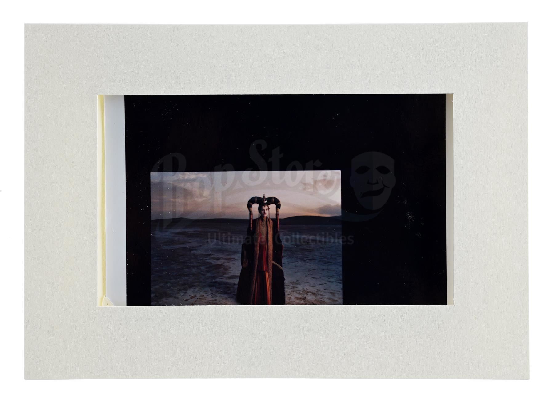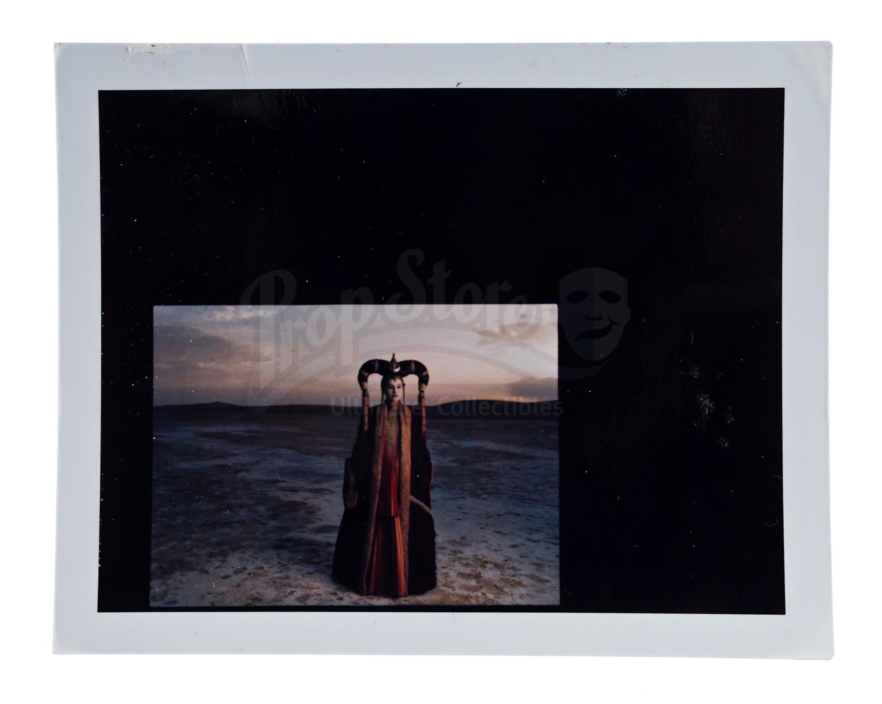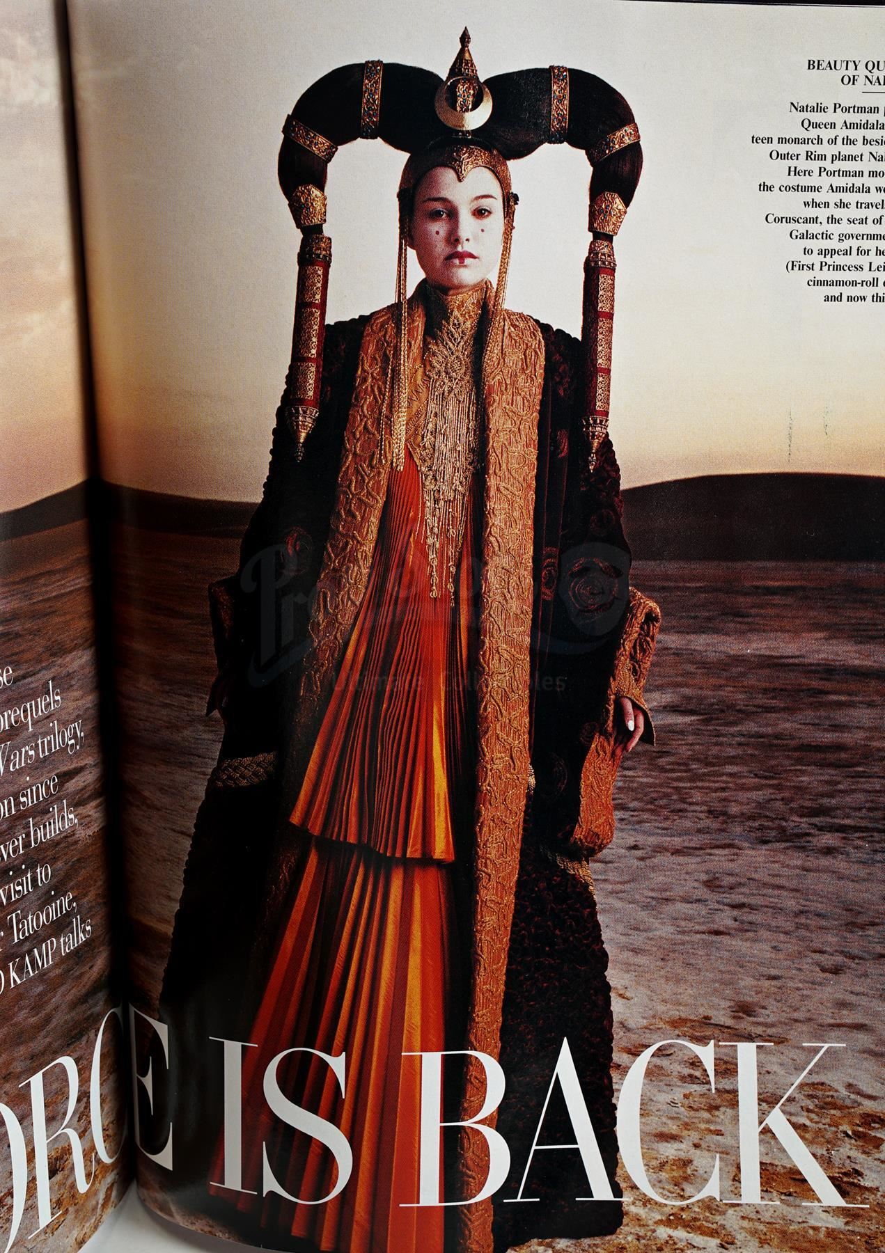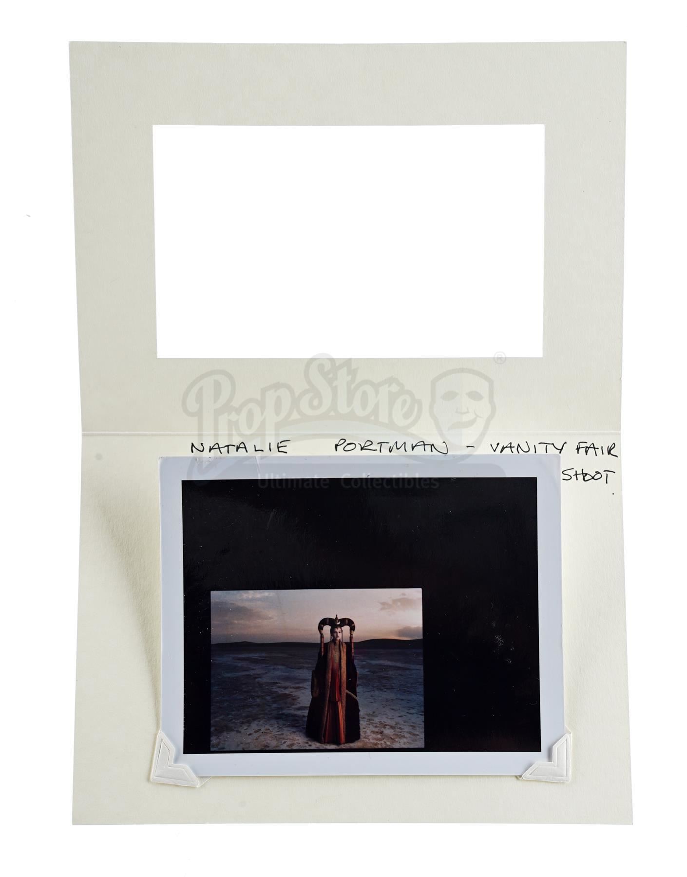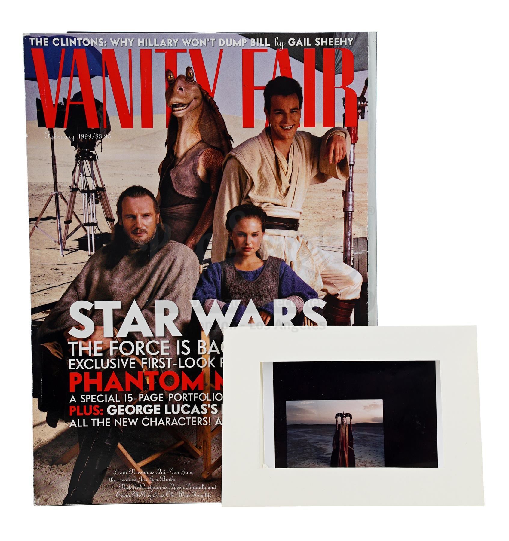 This lot will be auctioned on Thursday, July 1st. The auction will begin at 9:00am PDT and lots are sold sequentially via live auctioneer; tune in to the live streaming broadcast on auction day to follow the pace. Note other lots in the auction may close on June 29th or June 30th. Annie Leibovitz's test shot of Padme Amidala (Natalie Portman) for a February 1999 cover story in Vanity Fair magazine promoting George Lucas' Star Wars: The Phantom Menace. Famed photographer Leibovitz also shot several other cast members for the story. This glossy color test shot features handwritten exposure information on the back and comes in a white cardstock sleeve. Also included is a copy of the published magazine. It exhibits signs of use and wear, including creases and slight staining, but remains in good overall condition. Dimensions: 11" x 8.25" (28 cm x 21 cm) Estimate: $600 - 800