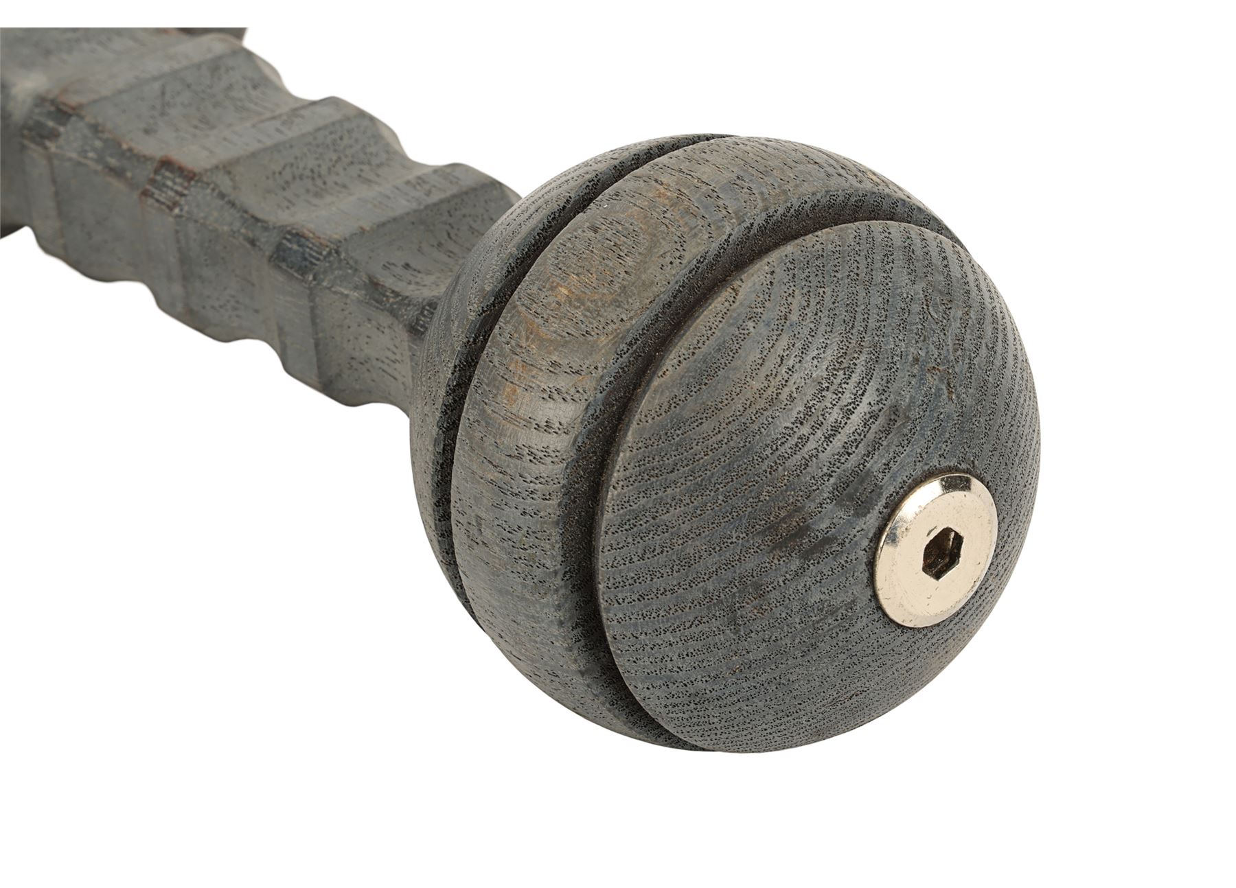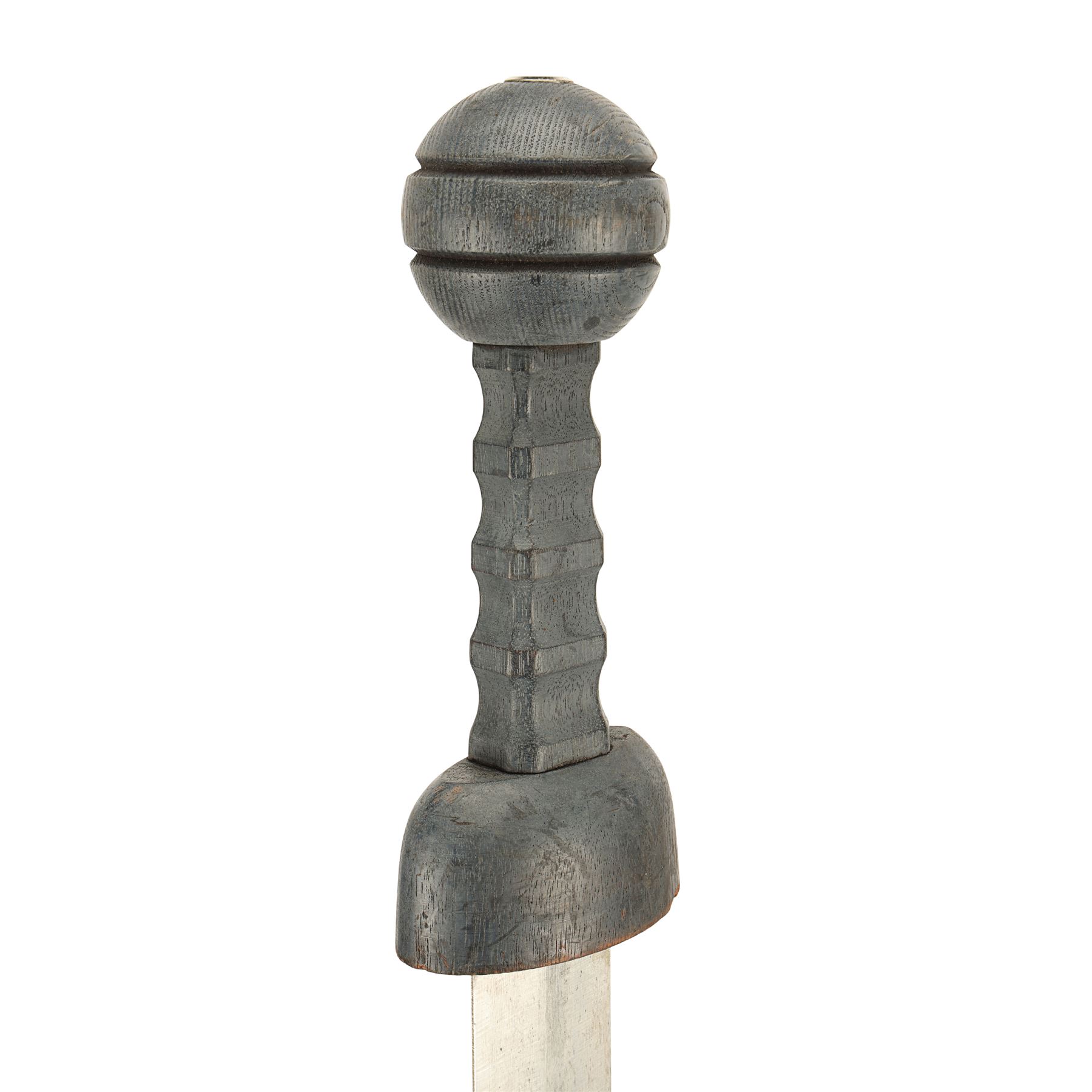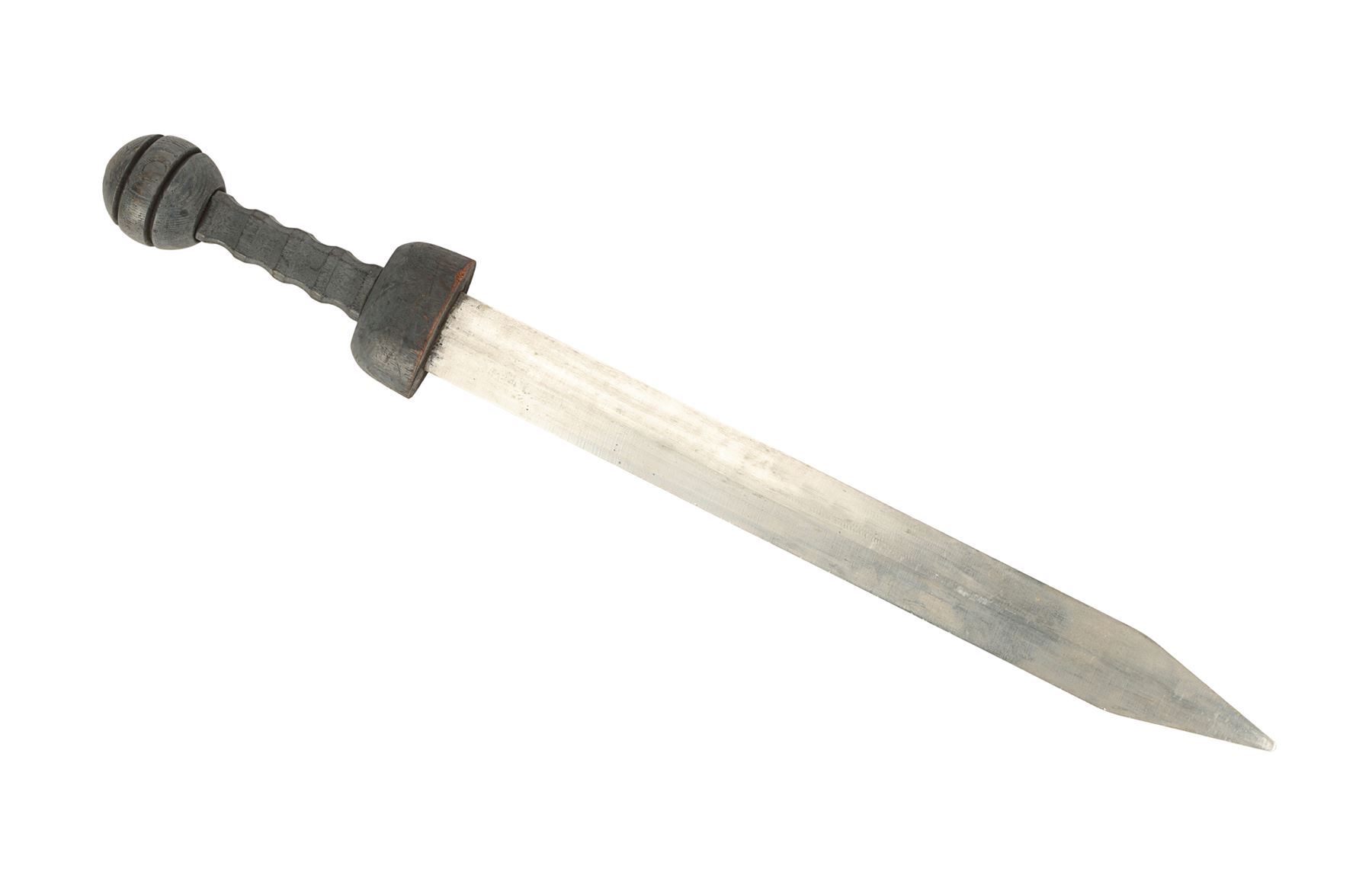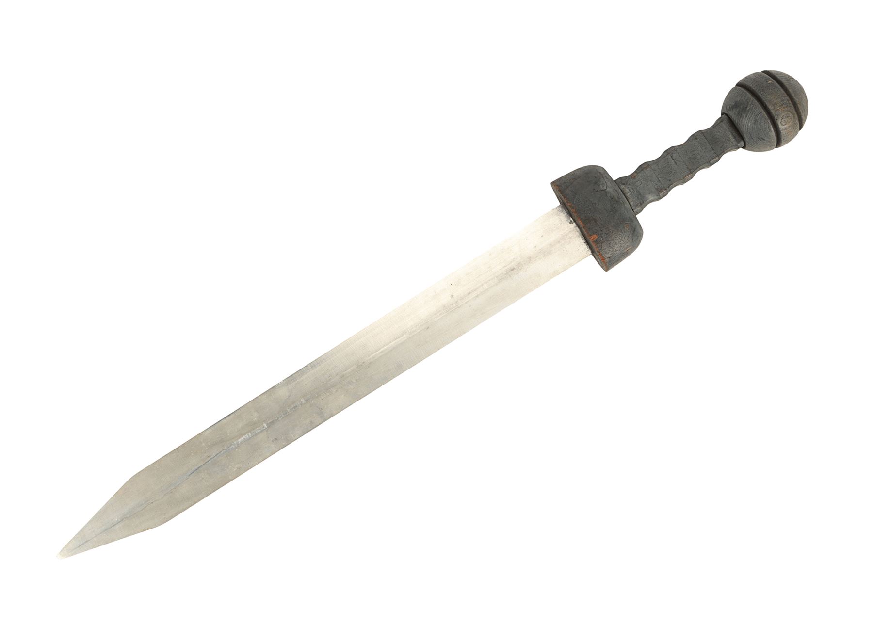 A Roman gladius from Ridley Scott's Academy Award& reg;-winning historical epic Gladiator. Roman soldiers carried their gladii into battle. It features an aluminium blade and wooden hilt. The hilt is stained dark grey. The weapon has some wear from production use, including some chips and paintwear on the hilt. Dimensions: 76 cm x 9 cm x 5 cm (30" x 3 1/2" x 2")