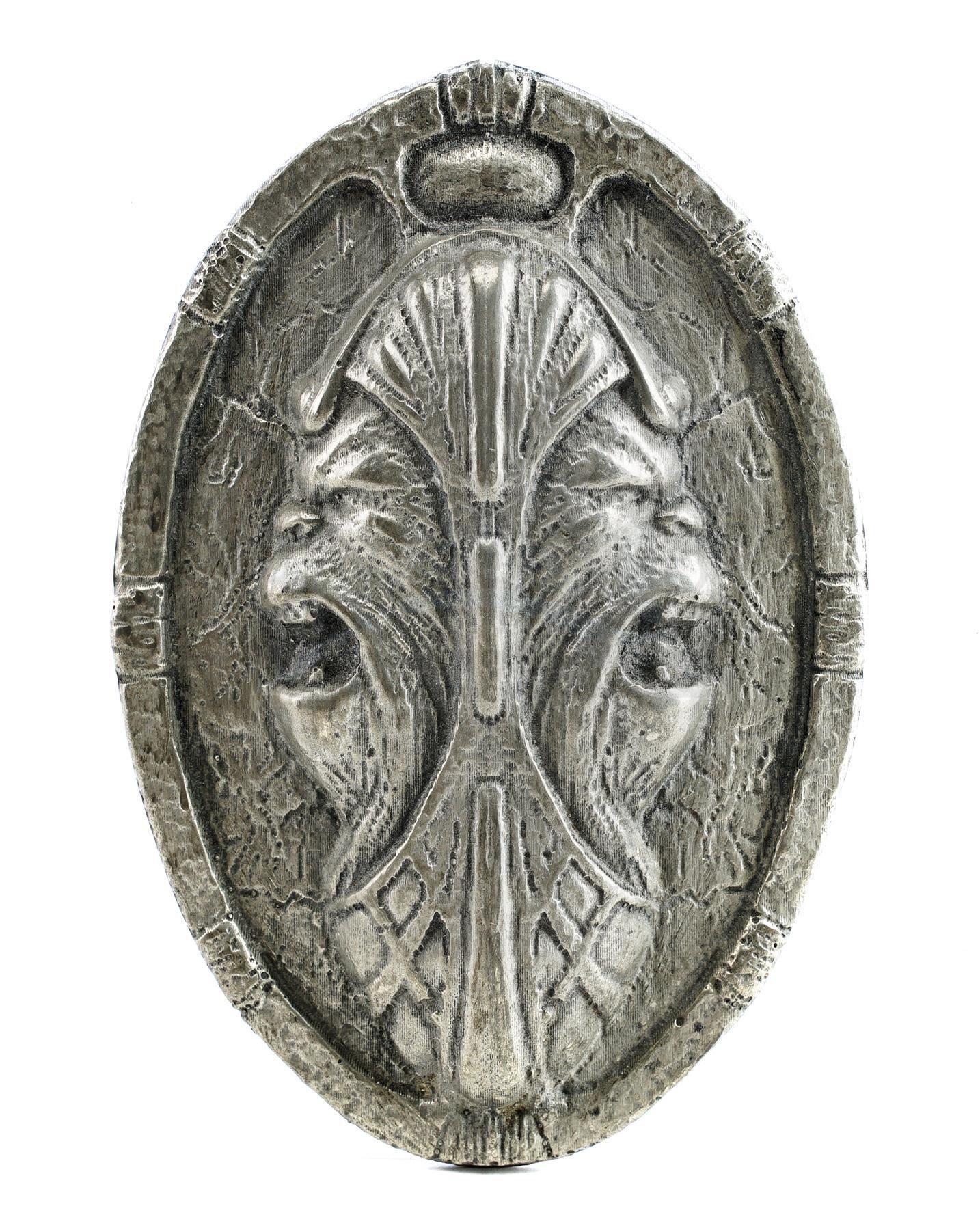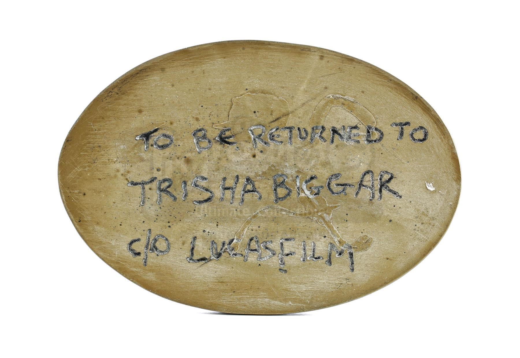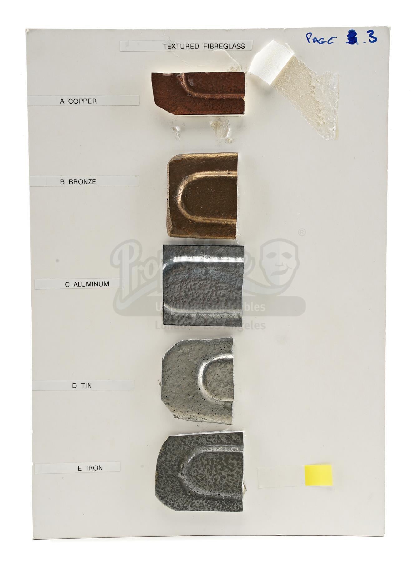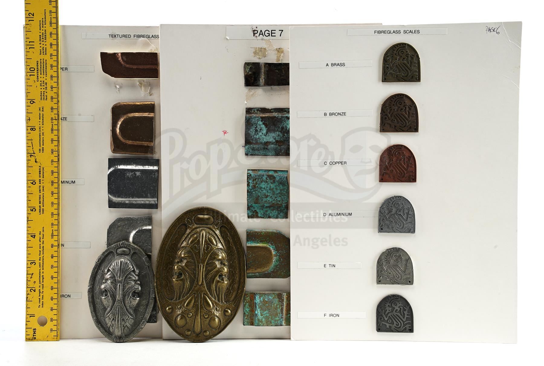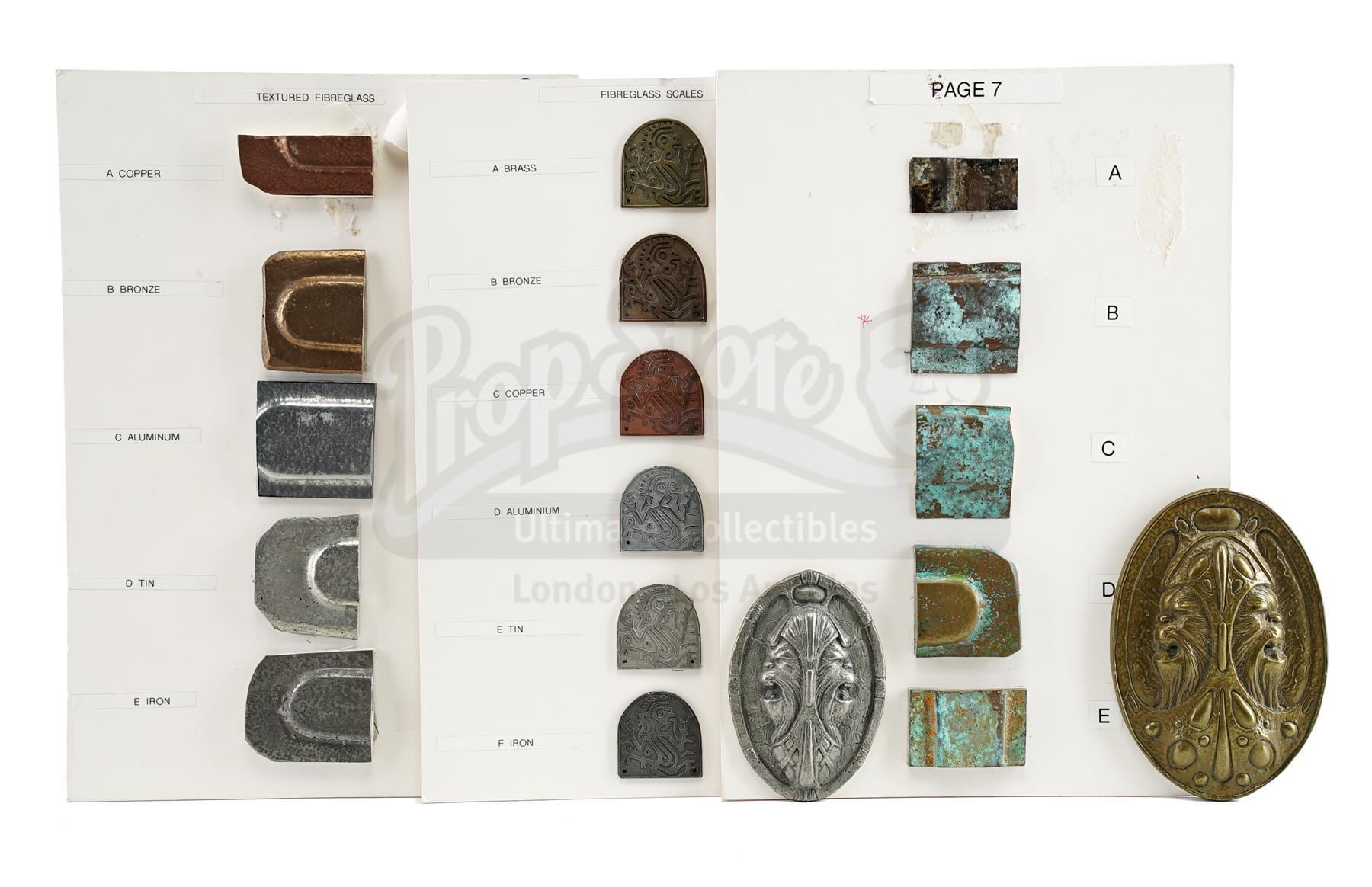 This lot will be auctioned on Thursday, July 1st. The auction will begin at 9:00am PDT and lots are sold sequentially via live auctioneer; tune in to the live streaming broadcast on auction day to follow the pace. Note other lots in the auction may close on June 29th or June 30th. Wookiee belt buckle and helmet scale samples from George Lucas' Star Wars, Episode III: Revenge of the Sith. Wookiee soldiers fought Galactic forces invading their planet, Kashyyyk. This lot consists of three sheets of textured fiberglass design samples hand-painted to resemble various materials and one gold-painted resin scale for the Wookiees' belt buckles and helmets organized and selected by a costume designer. They are in good overall condition with some torn labels and edge wear. Dimensions (largest): 11.75" x 8.25" x 1" (30 cm x 21 cm x 2.5 cm); (smallest): 4" x 2" x 1" (10.25 cm x 5 cm x 2.5 cm) Estimate: $1,200 - 1,800