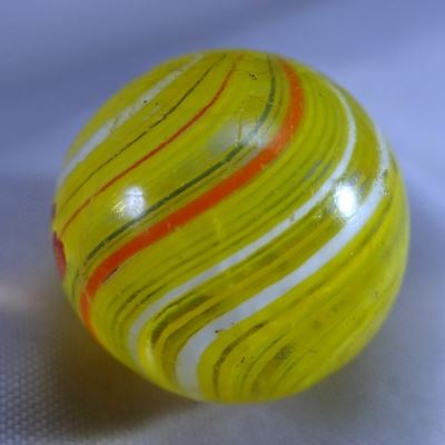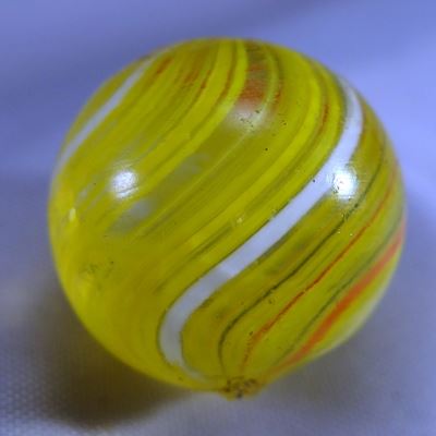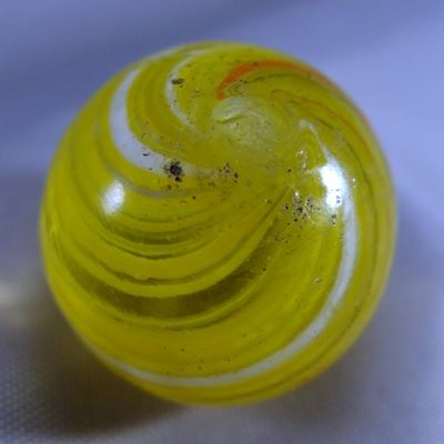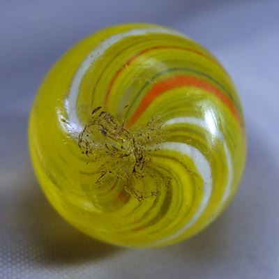 Clear base. Subsurface layer is stretched flecks of bright yellow and some white. A couple of tiny pits and scratches. Germany, circa 1860-1920. 23/32". Mint(-) (9.0).