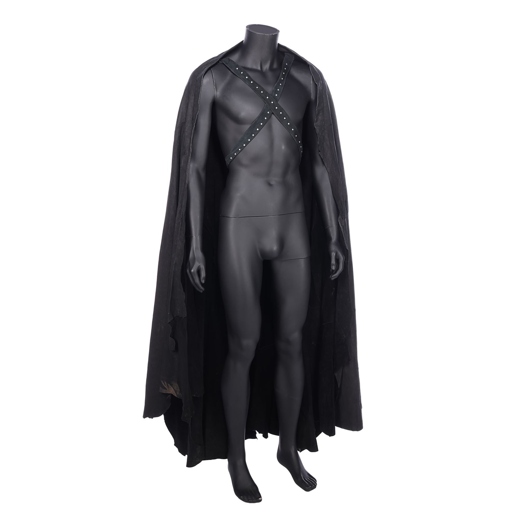 The cloak is made of patchworked black leather and features two studded straps that are worn across the chest and fastened at the back. Custom-made for production by the costumier house Angels, it includes an inventory tag that reads "Alan Rickman, Robin Hood Prince of, Black Leather Cape."