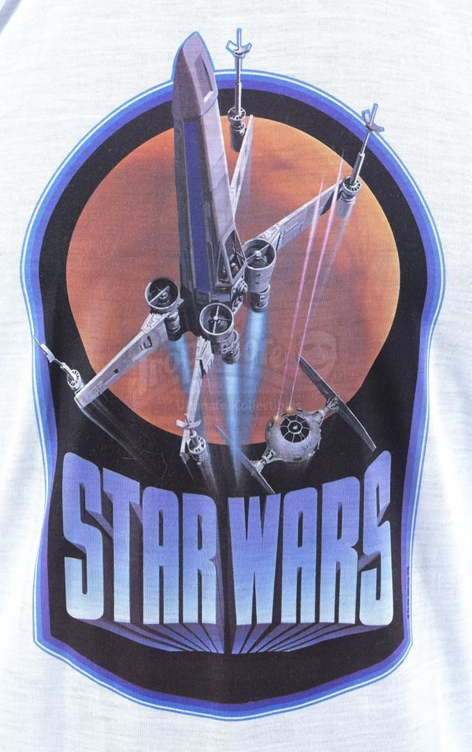 This lot will be auctioned on Thursday, July 1st. The auction will begin at 9:00am PDT and lots are sold sequentially via live auctioneer; tune in to the live streaming broadcast on auction day to follow the pace. Note other lots in the auction may close on June 29th or June 30th. An X-Wing and TIE fighter Star Wars crew t-shirt from the production of George Lucas' Star Wars: A New Hope. These rare crew shirts with artwork by Ralph McQuarrie of a TIE fighter chasing an X-Wing through space were issued to select members of the production staff. This white cotton shirt is emblazoned "Special Effects Paul" in purple and blue crushed velvet on the reverse. Despite its age, it remains in excellent overall condition with only minor signs of previous wear. Estimate: $400 - 600