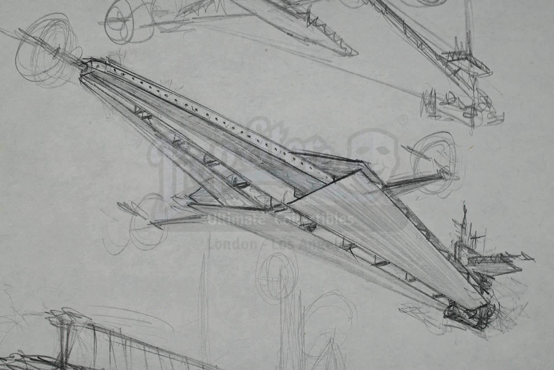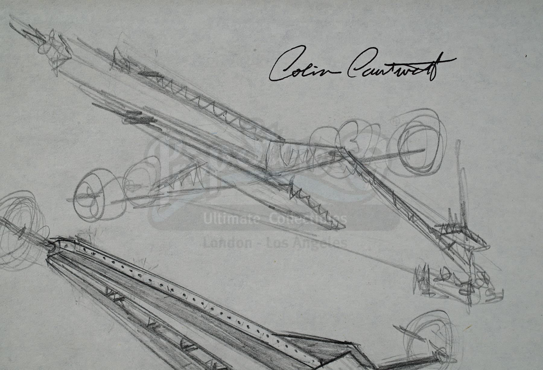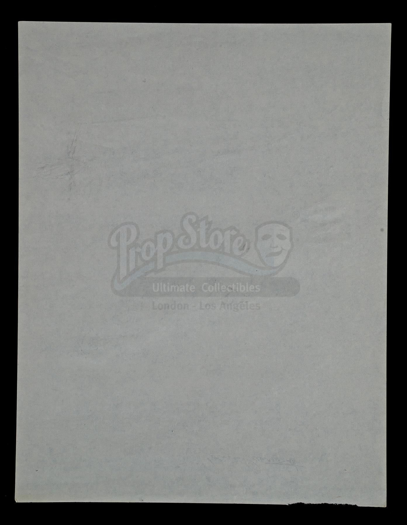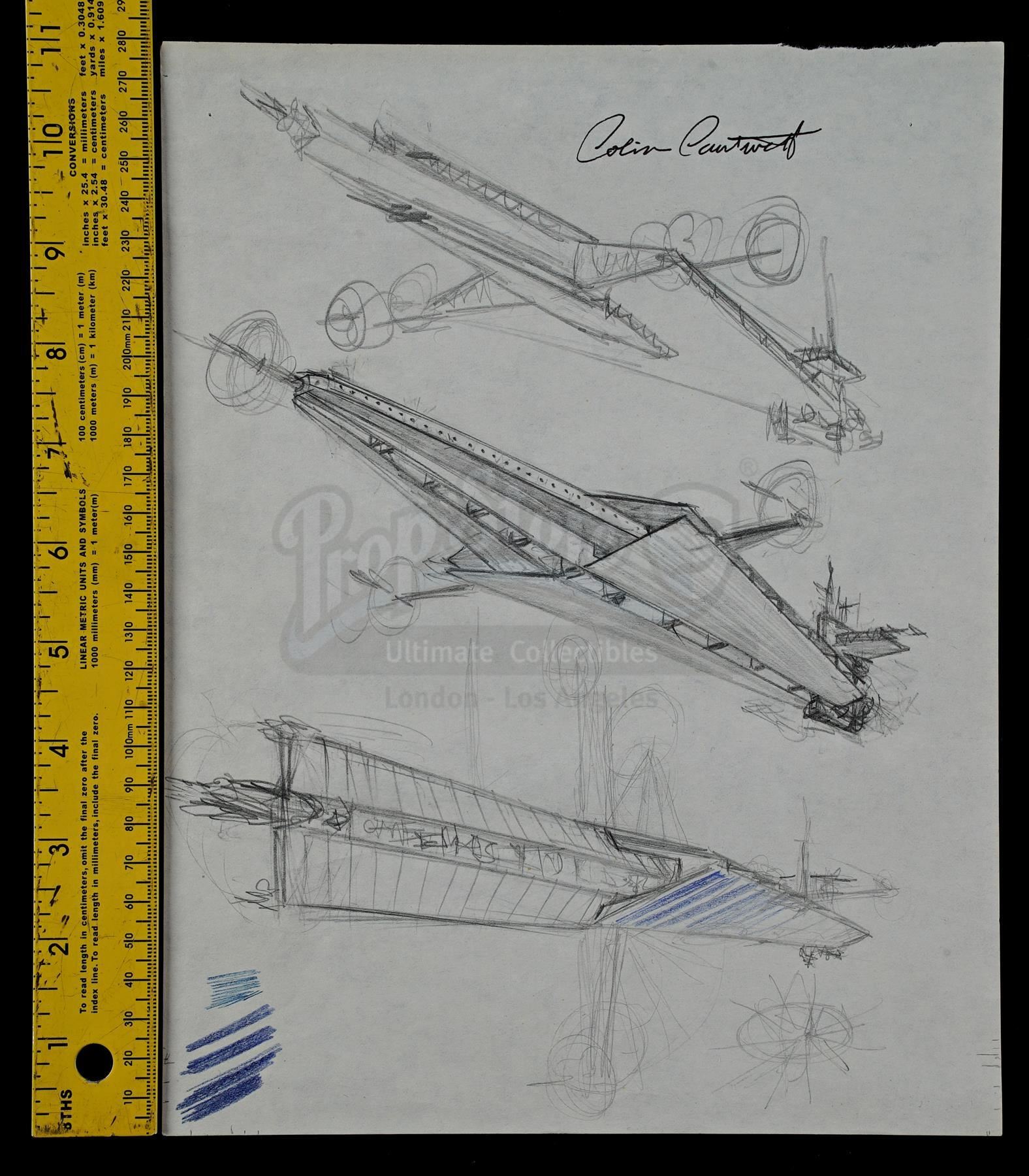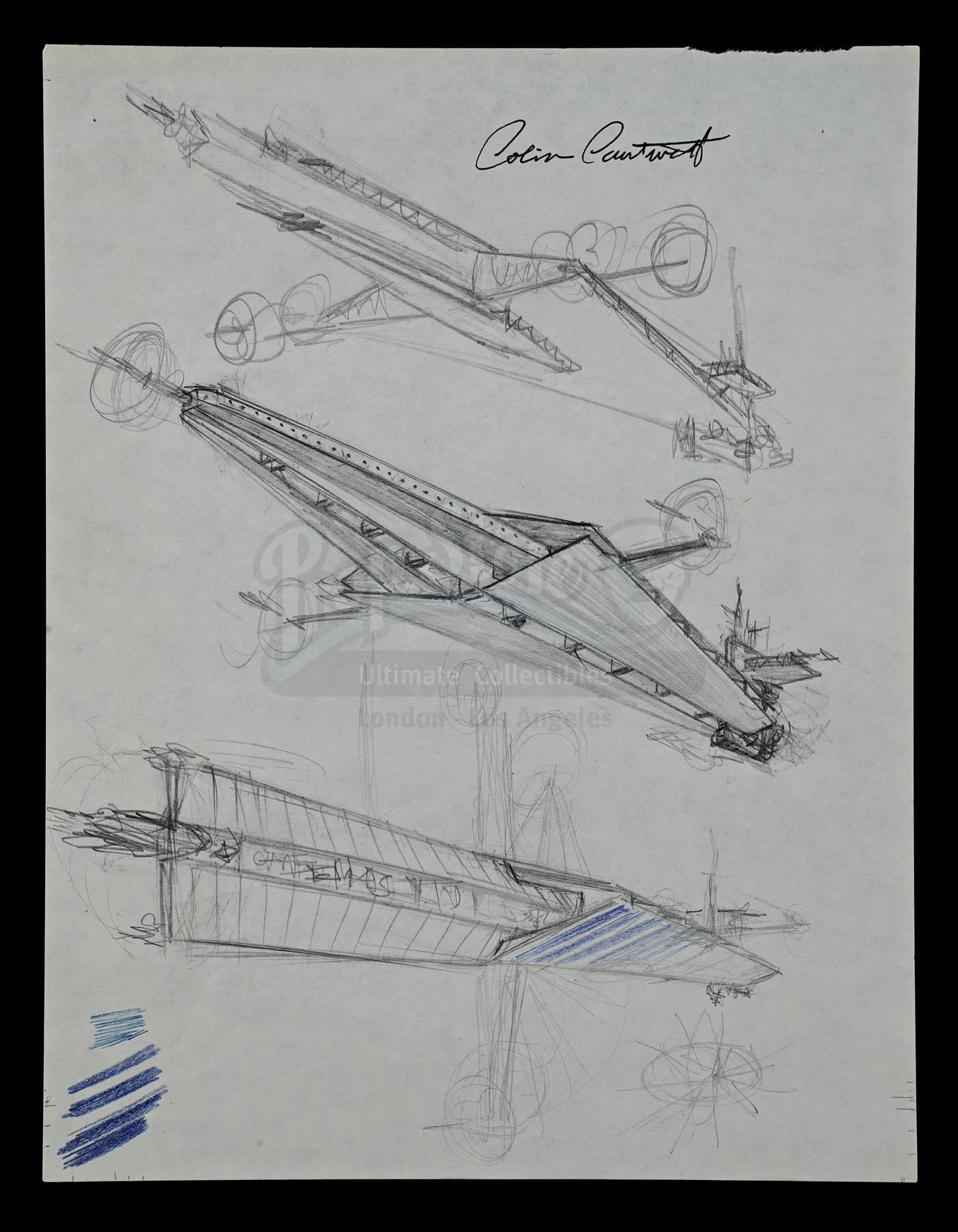 This lot will be auctioned on Thursday, July 1st. The auction will begin at 9:00am PDT and lots are sold sequentially via live auctioneer; tune in to the live streaming broadcast on auction day to follow the pace. Note other lots in the auction may close on June 29th or June 30th. A hand-drawn early star destroyer concept by Colin Cantwell for George Lucas' Star Wars: A New Hope. Star destroyers, originally known as Imperial cruisers, were seen throughout the original Star Wars film. Artist Colin Cantwell, a veteran of 2001: A Space Odyssey and other films, was one of the first artists Lucas hired on the project and did some of the earliest drawings and physical models of spaceships. Cantwell's designs were later refined by Joe Johnston to create the final looks for the film. This sketch, hand-drawn and signed by Cantwell, features multiple views of the craft is rendered in graphite and colored pencil on illustration paper. It is one of the earliest pieces of concept art created for Star Wars: A New Hope. It exhibits minor signs of wear, including light creases from handling. Dimensions: 8.5" x 11" (22 cm x 28 cm) Sold without copyright; see notice in the Buyer's Guide. Estimate: $1,200 - 1,800