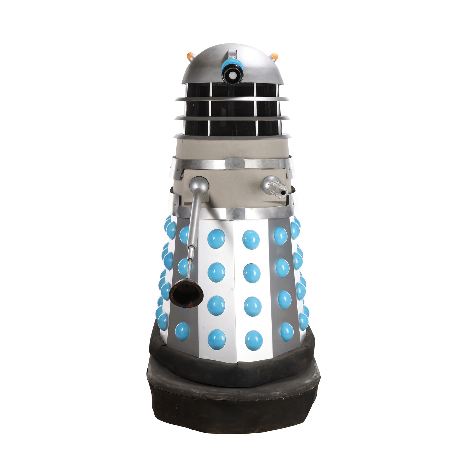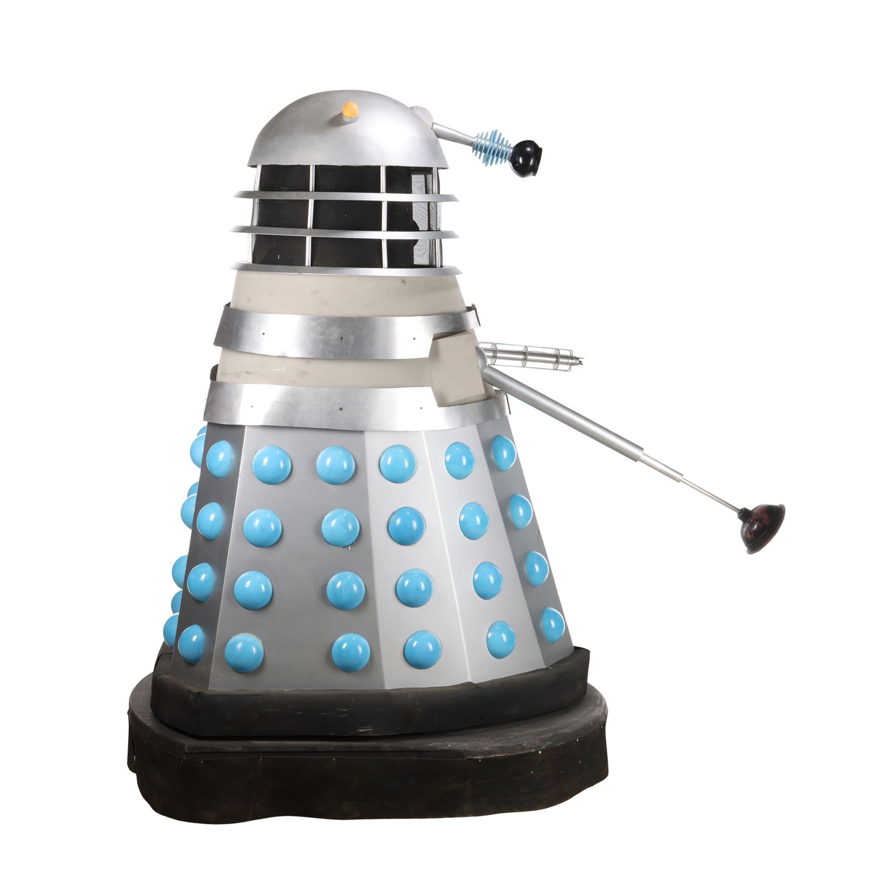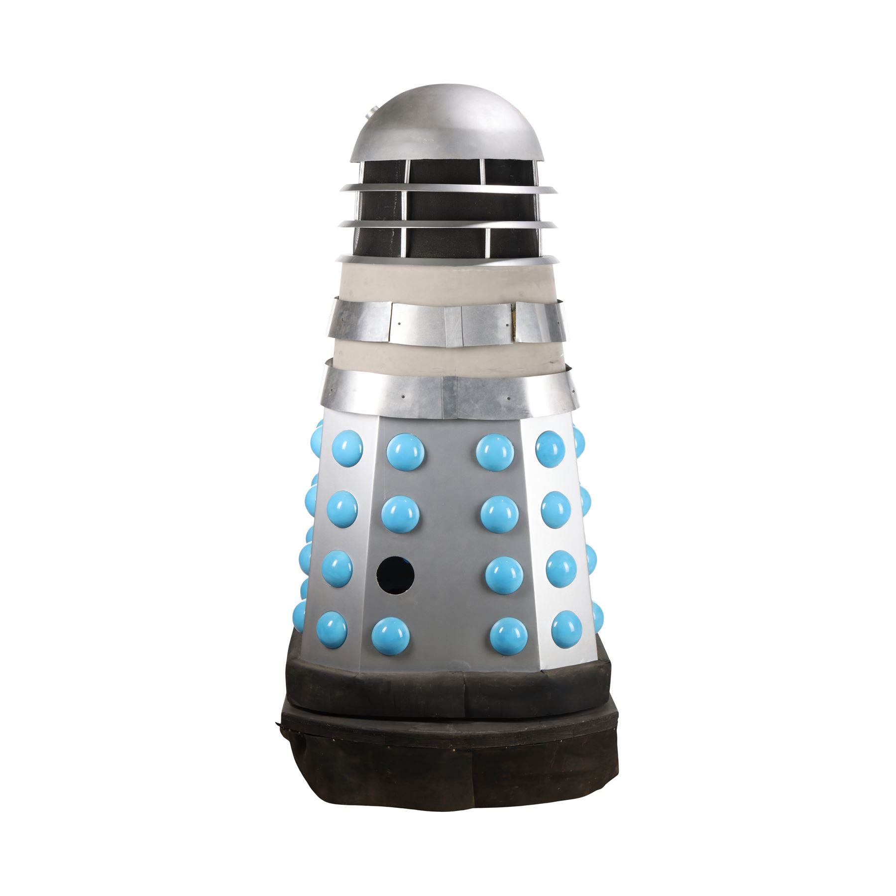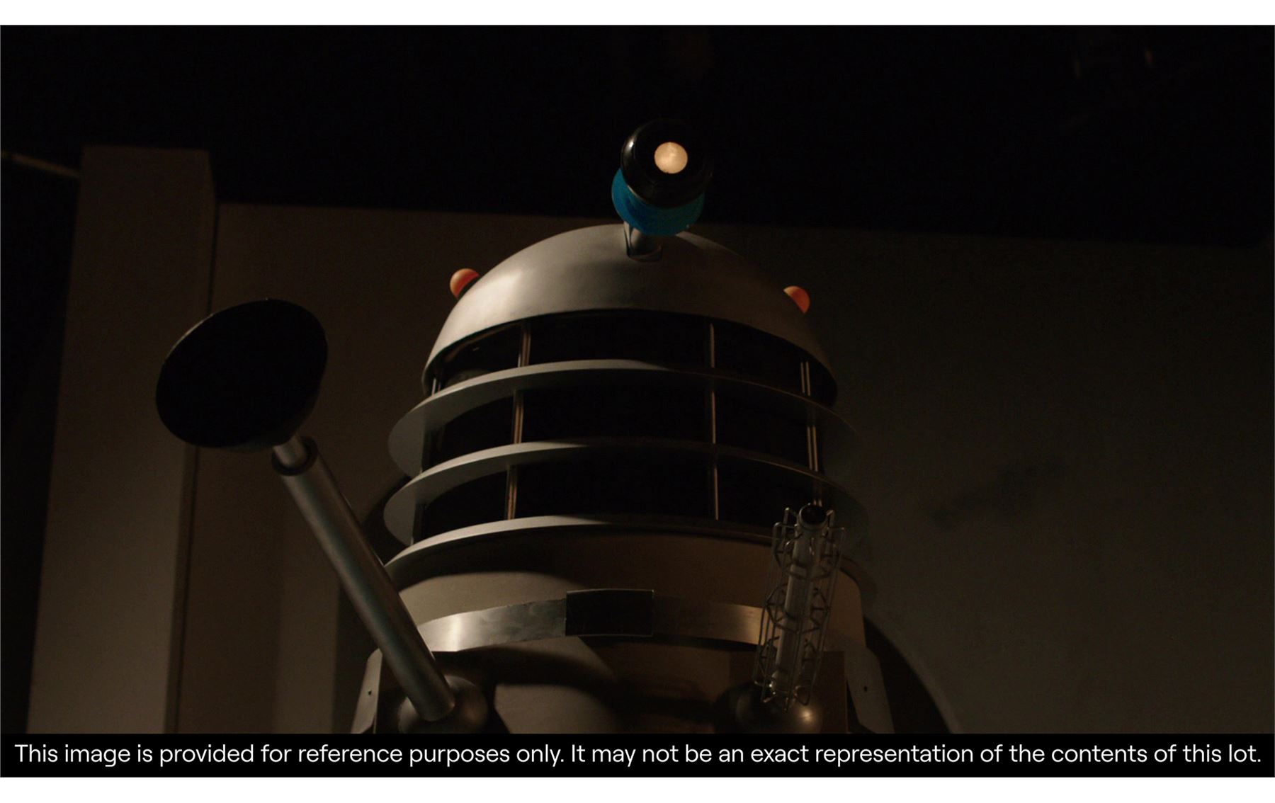 This Dalek was one of four used to recreate the aliens' first-ever appearance and has a hollow interior and seat for the actor operating it. Finished primarily in silver paint, the Dalek comprises a wooden upper body, which features aluminium plating; an operable metal, resin and rubber gun stick; an operable plunger arm; and a fibreglass neck frame lined with black mesh, for the operator to see through. The Dalek also has a swivelling fibreglass dome head featuring an eye stalk that moves up and down, and two orange ping pong balls as communication indicators, which have lights inside powered by a 12v battery. These electronics remain untested.
