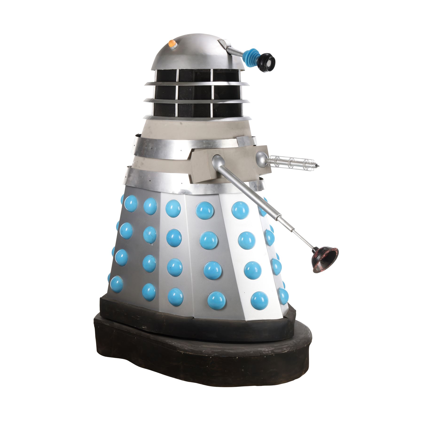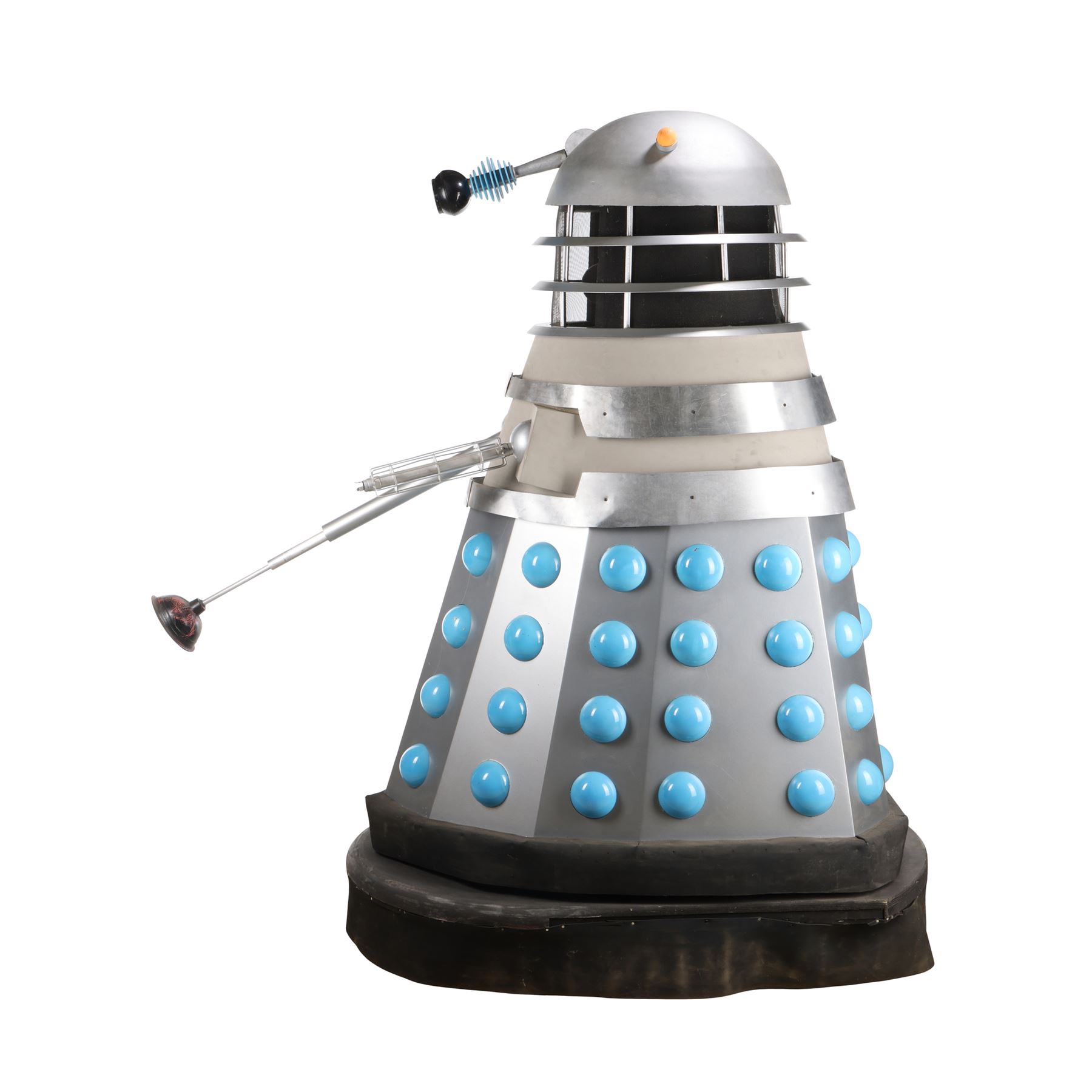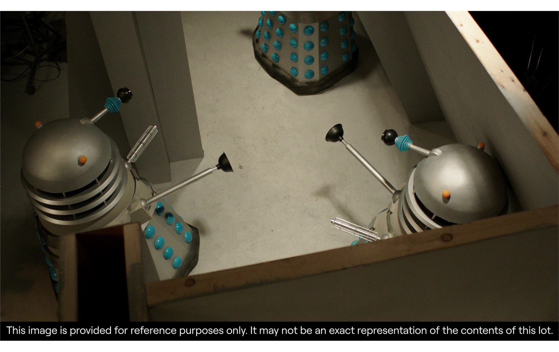 This Dalek was one of four used to recreate the aliens' first-ever appearance and has a hollow interior and seat for the actor operating it. Finished primarily in silver paint, the Dalek comprises a wooden upper body, which features aluminium plating; an operable metal, resin and rubber gun stick; an operable plunger arm; and a fibreglass neck frame lined with black mesh, for the operator to see through. The Dalek also has a swivelling fibreglass dome head featuring an eye stalk that moves up and down, and two orange ping pong balls as communication indicators, which have lights inside powered by a 12v battery. These electronics remain untested.