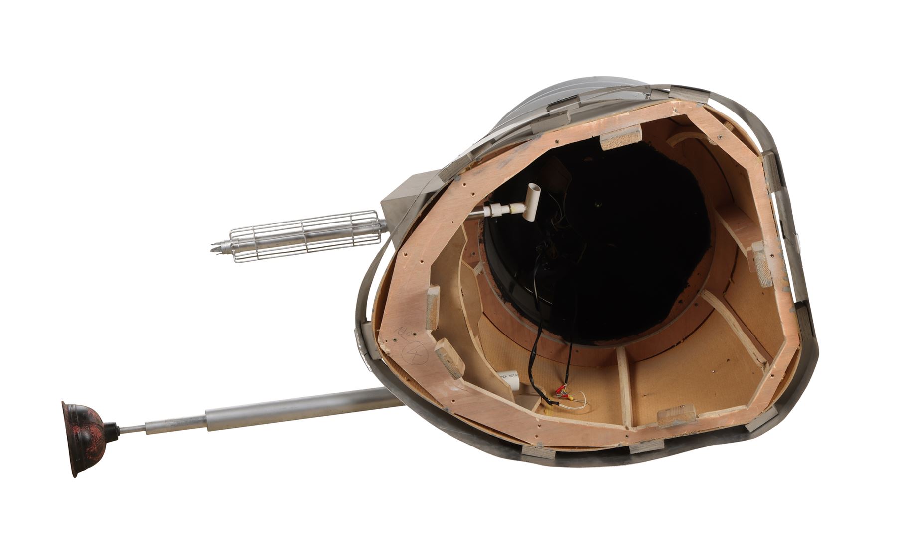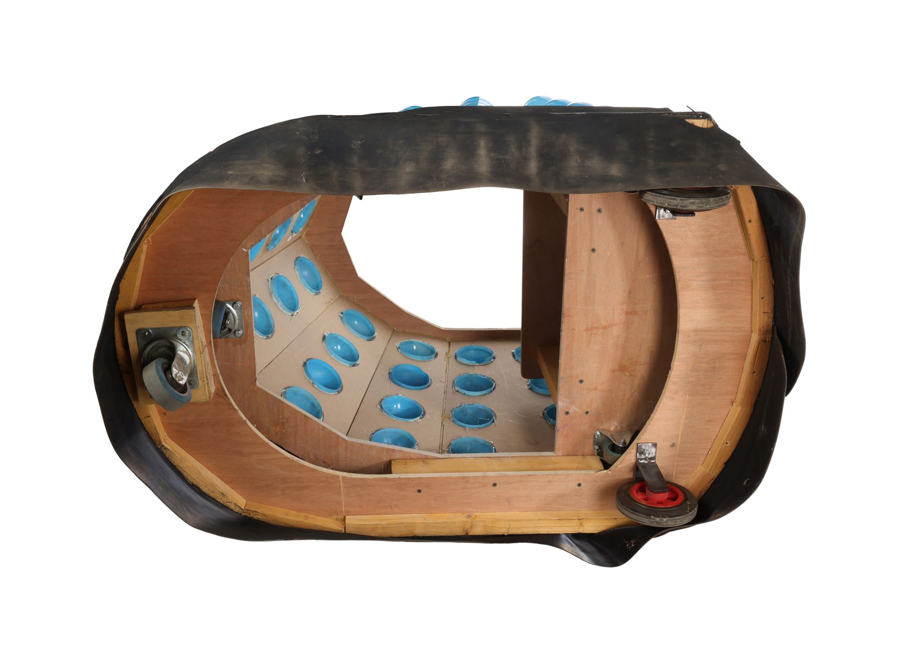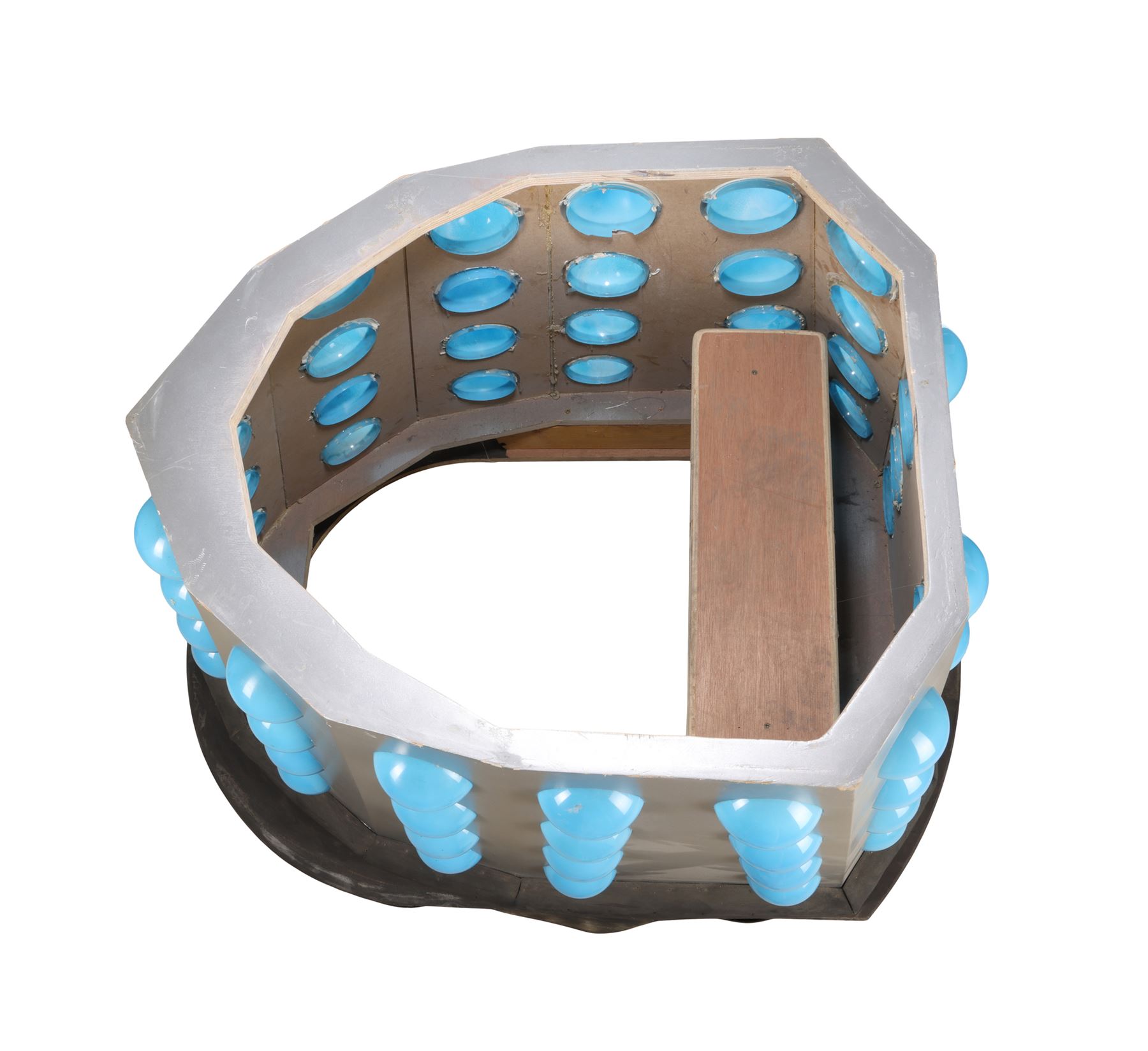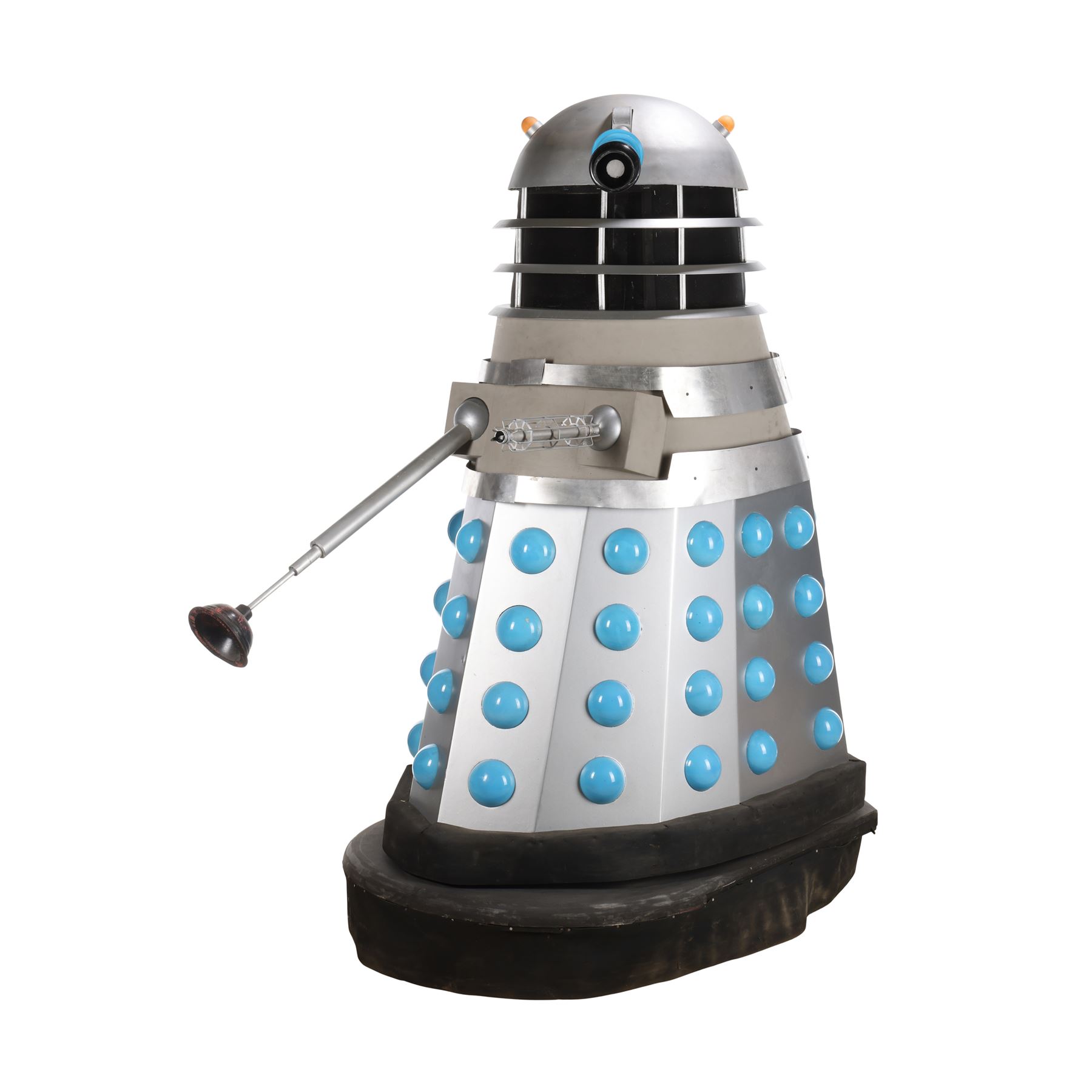 This Dalek was one of four used to recreate the aliens' first-ever appearance and has a hollow interior and seat for the actor operating it. Finished primarily in silver paint, the Dalek comprises a wooden upper body, which features aluminium plating; an operable metal, resin and rubber gun stick; an operable plunger arm; and a fibreglass neck frame lined with black mesh, for the operator to see through. The Dalek also has a swivelling fibreglass dome head featuring an eye stalk that moves up and down, and two orange ping pong balls as communication indicators, which have lights inside powered by a 12v battery. These electronics remain untested.