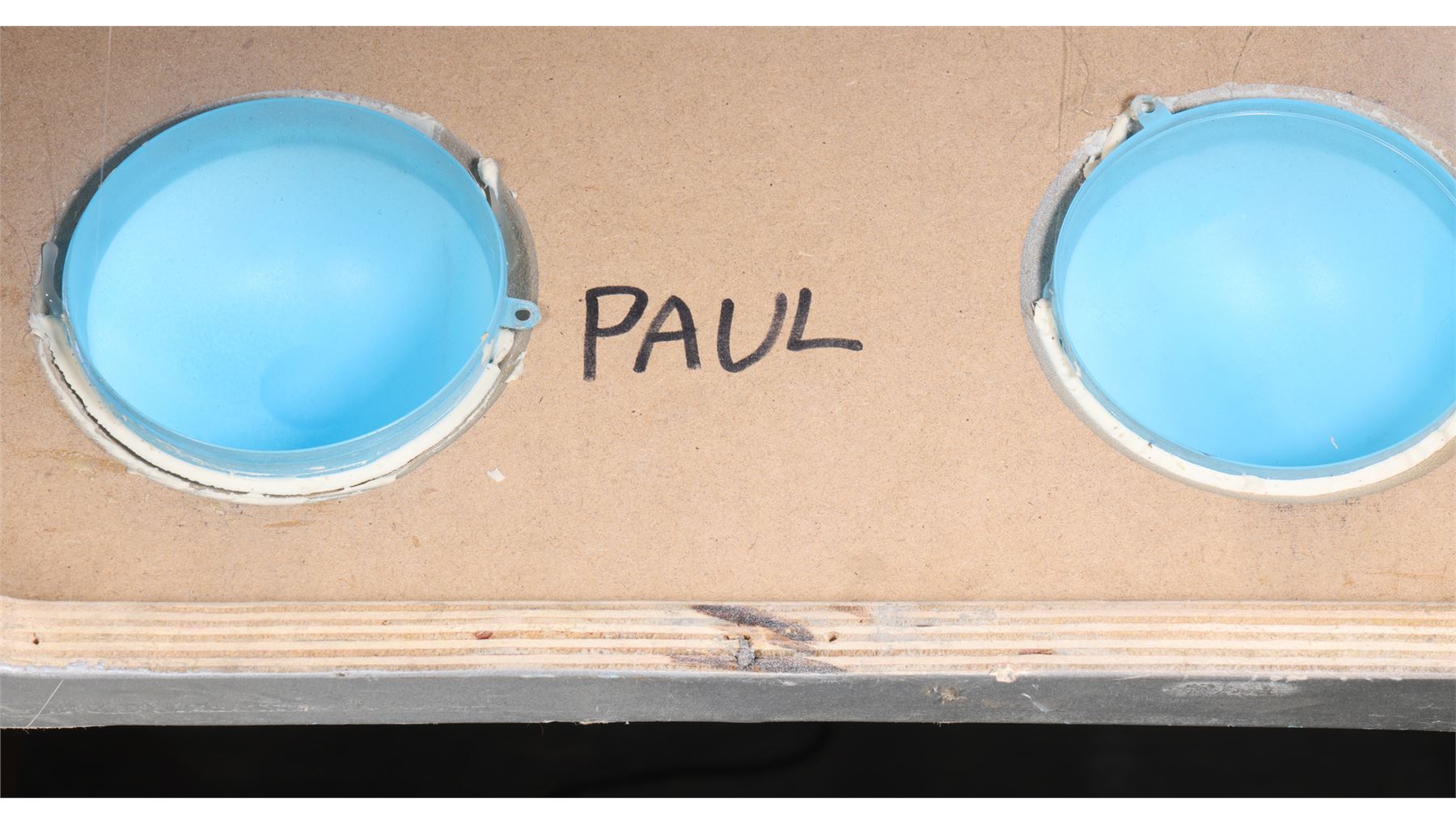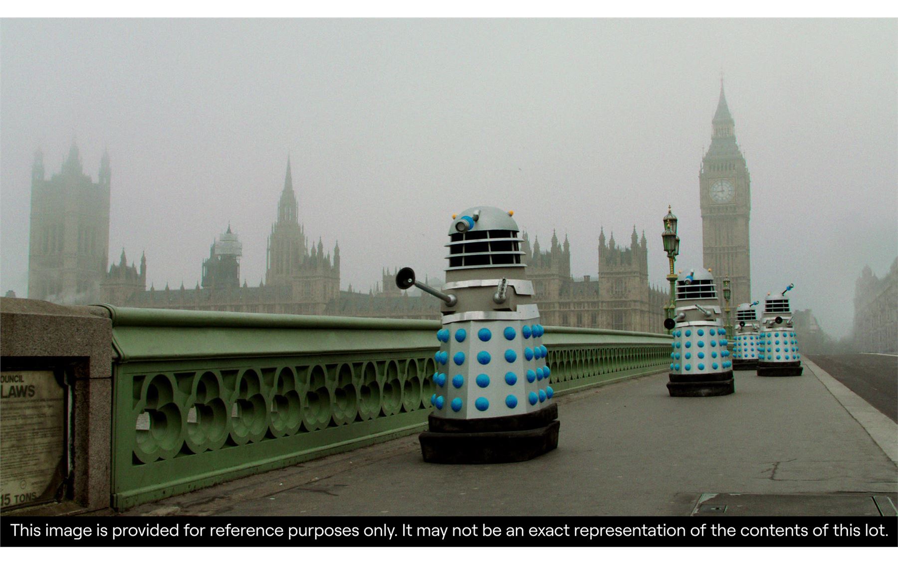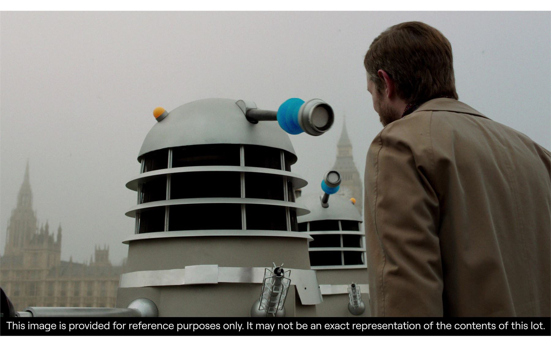 The upper body, which has "No. 4" written on its lower rim, can be separated from the wooden skirt it sits upon. This skirt features the name "Paul" written on its interior and is studded with rows of blue plastic sense domes, with black rubber fenders covering the wheels fixed to its base. A secondary wheeled base frame was added to this Dalek for extra support when filming on Westminster Bridge. The lot exhibits wear from production use and age, including a broken dome, chips, scuffing to the fenders and peeling paint on the plunger. Dimensions: 179 cm x 90 cm x 153 cm (70 1/2" x 35 1/2" x 60 1/4")