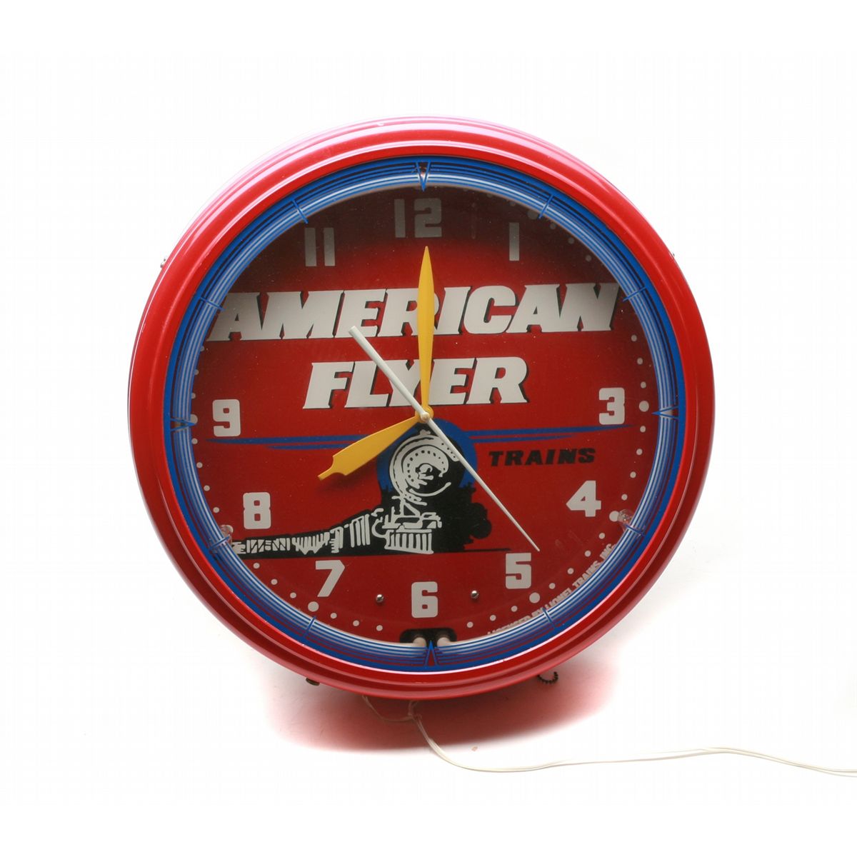 Like new condition American Flyer Trains wall clock by Image Time & Licensed by Lionel Trains Inc - 20" diameter red metal frame with glass front panel - Neon lighted edge - power cord intact - ready to hang - non-ffl - 25VVFKIL103