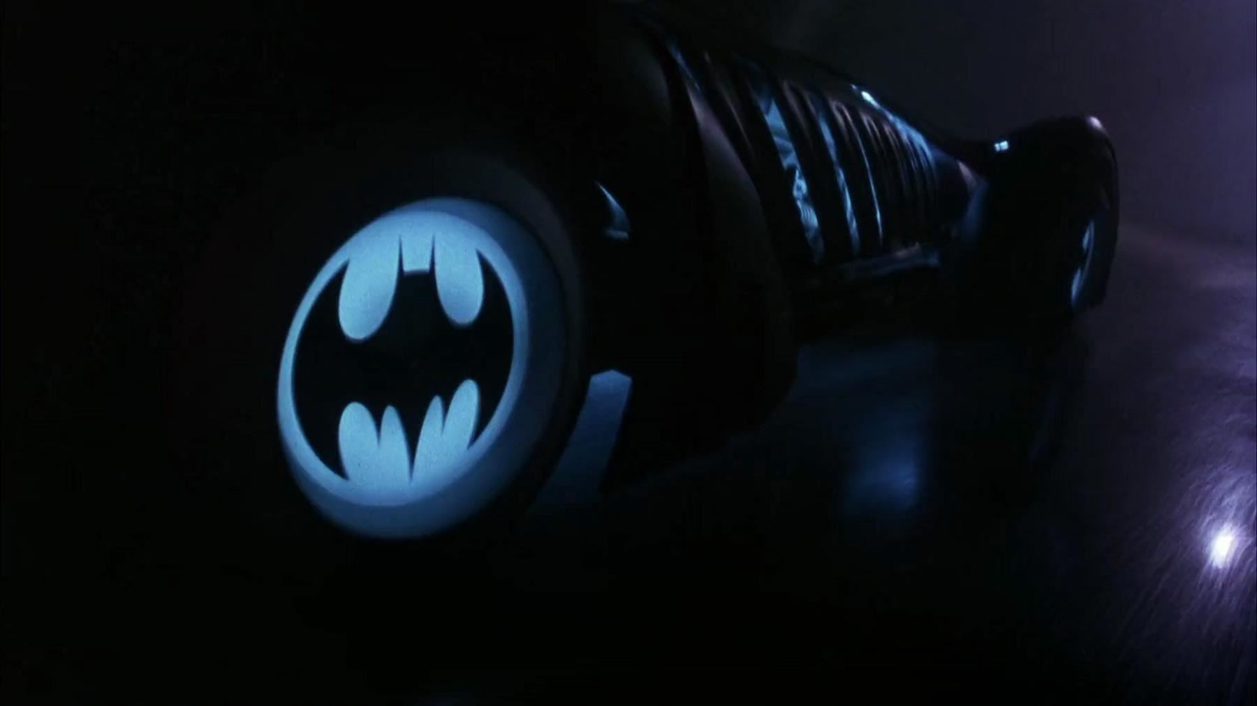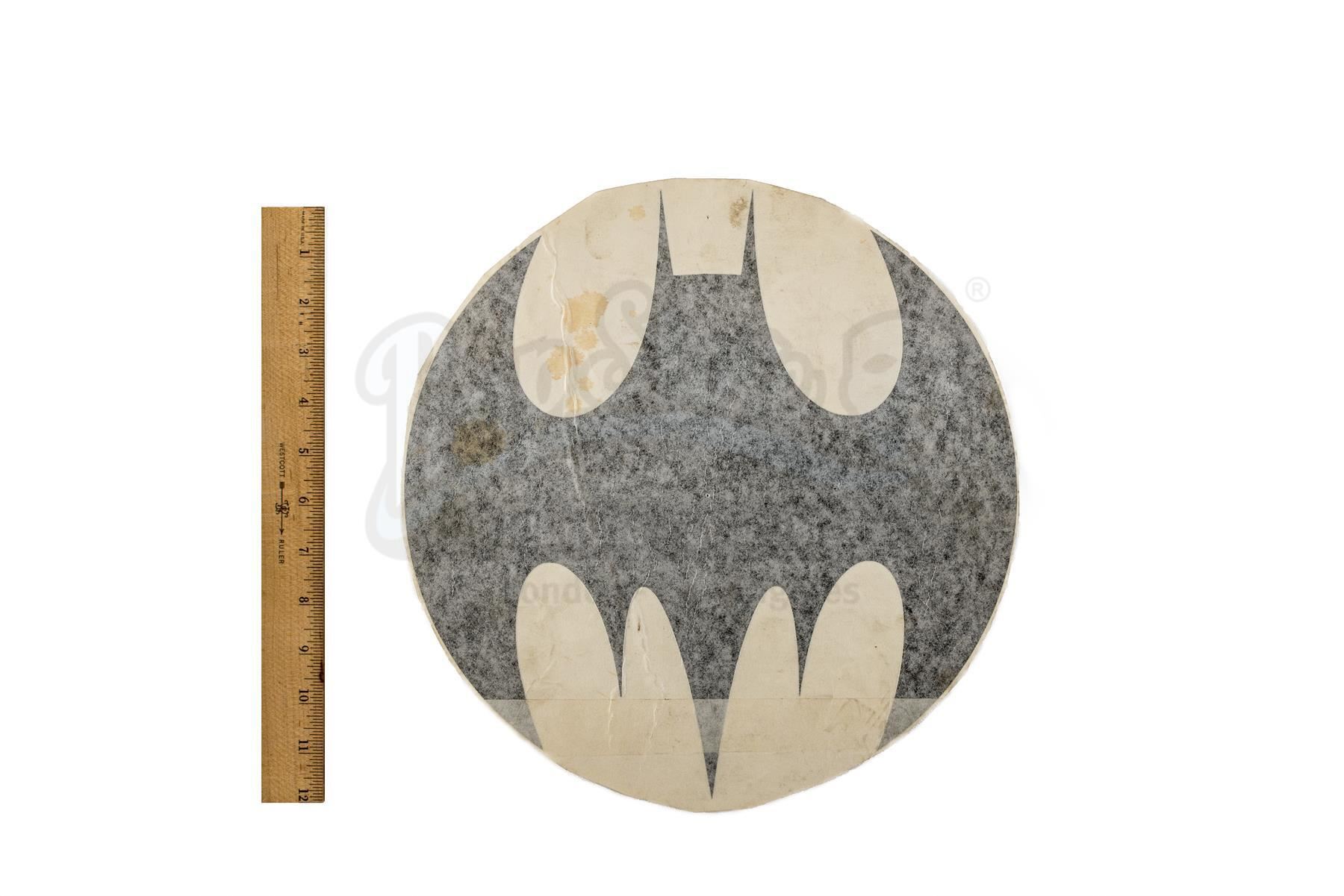 A Batmobile hubcap decal from the production of Joel Schumacher's superhero sequel Batman Forever. Batman's (Val Kilmer) newly-modified Batmobile featured the Bat-symbol on its wheels throughout the film.