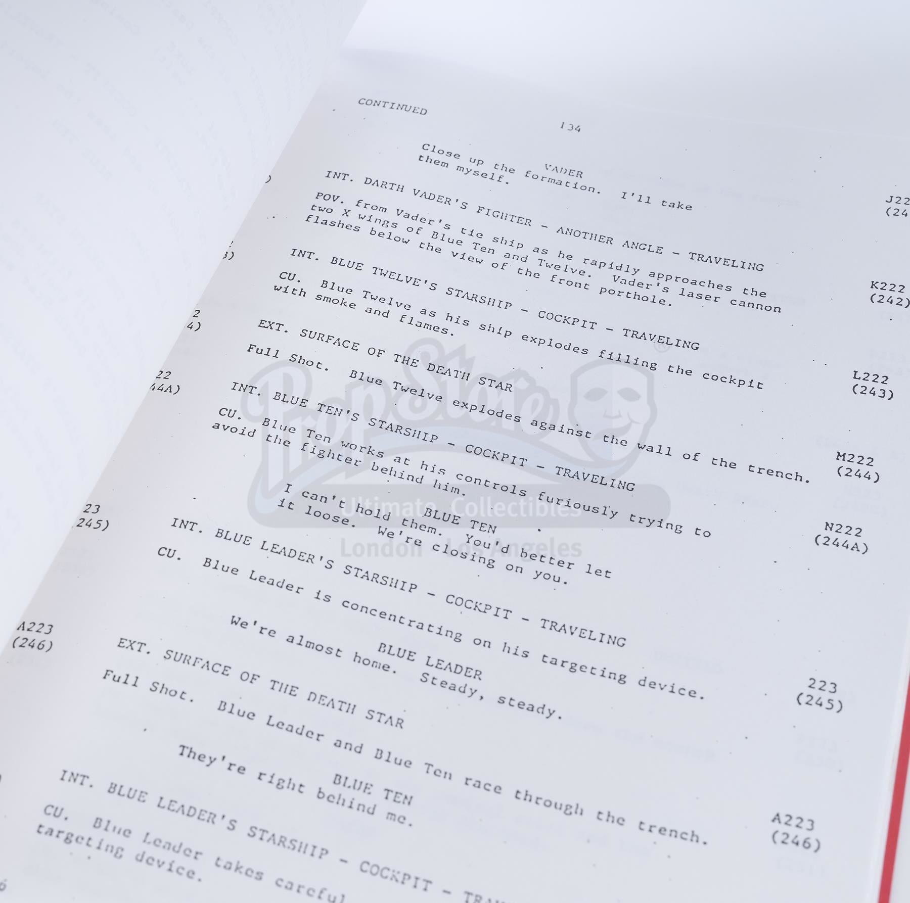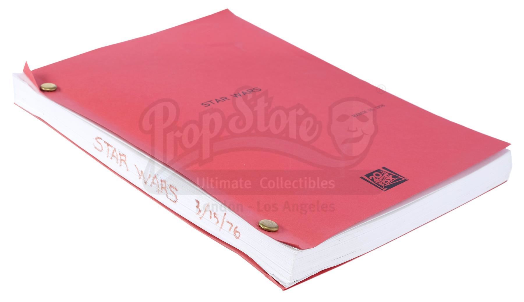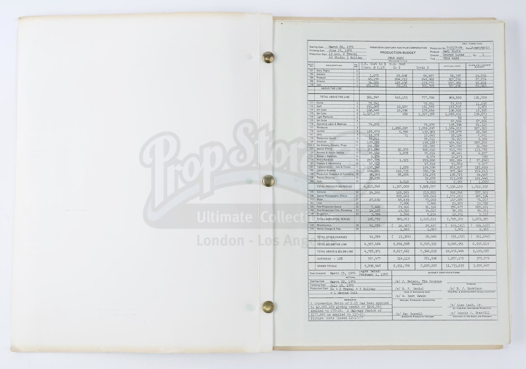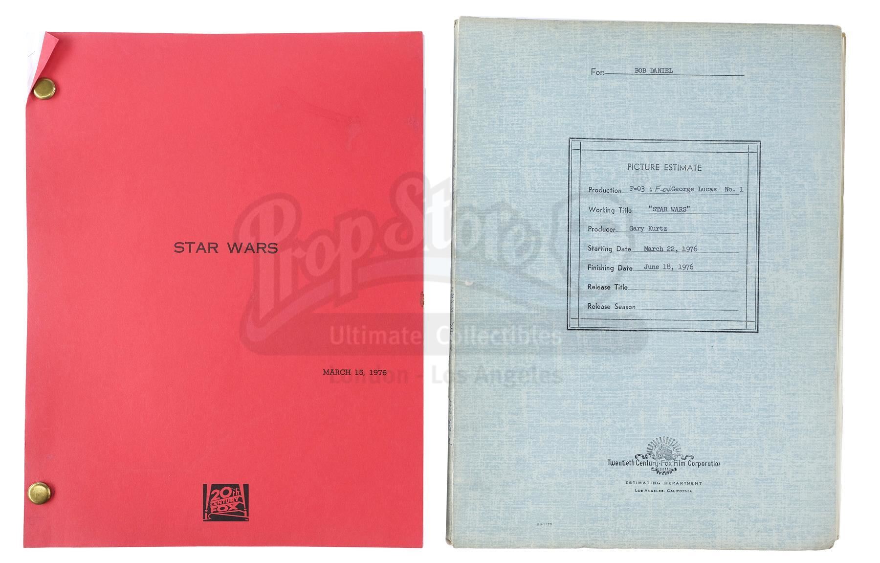 This lot will be auctioned on Thursday, July 1st. The auction will begin at 9:00am PDT and lots are sold sequentially via live auctioneer; tune in to the live streaming broadcast on auction day to follow the pace. Note other lots in the auction may close on June 29th or June 30th. Studio copy script and Fox picture cost estimate folder from the production of George Lucas' sci-fi adventure Star Wars: A New Hope. This lot consists of a light blue binder containing an extensive itemized "picture estimate" production budget for the film on white paper. It features budget details broken down by department. Also included is a 156-page script with a red cover and brass brad fasteners. Noted as the revised fourth draft and dated March 15, 1976, the script is credited to Lucas. It exhibits signs of use and wear, including some creasing on the paper, but remains in good overall condition. Dimensions: 11.5" x 8" x 1.5" (29.25 cm x 21.75 cm x 4 cm) Estimate: $1,500 - 2,500