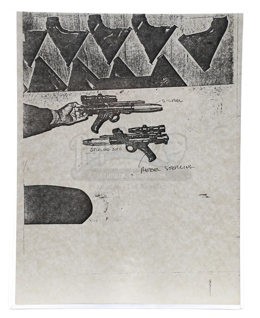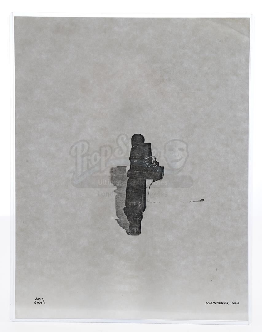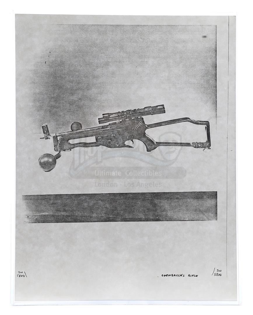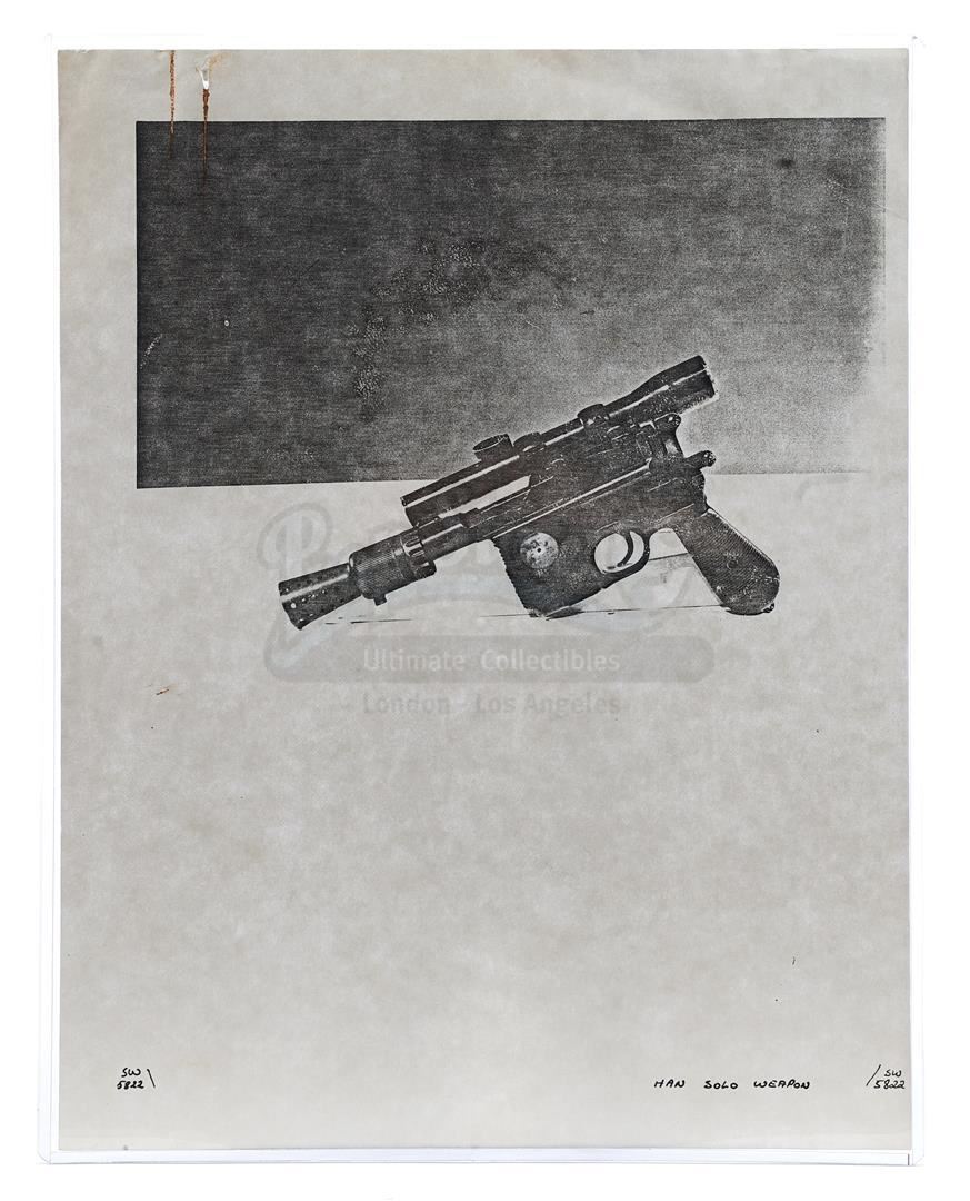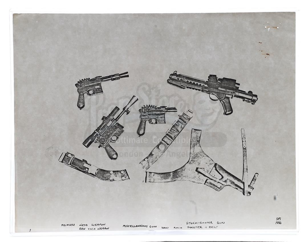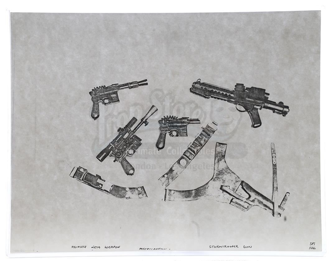 This lot will be auctioned on Thursday, July 1st. The auction will begin at 9:00am PDT and lots are sold sequentially via live auctioneer; tune in to the live streaming broadcast on auction day to follow the pace. Note other lots in the auction may close on June 29th or June 30th. Weapons research images from George Lucas's Star Wars: A New Hope. This set of 62 black-and-white photostats of original photographs was created by Industrial Light & Magic (ILM) art director James L. Schoppe to document the original weapon designs seen in the film. Among the weapons featured are Han Solo's (Harrison Ford) blaster, Princess Leia's (Carrie Fisher) blaster and belt, Chewbacca's (Peter Mayhew) bowcaster, Stormtrooper blaster rifles, and Obi-Wan Kenobi (Alec Guinness) and Darth Vader's (James Earl Jones) lightsabers. The archive exhibits creasing, slight tears, and storage wear, but remains in good overall condition. Dimensions (each): 8" x 11.5" (3.14 cm x 4.5 cm) Estimate: $800 - 1,200