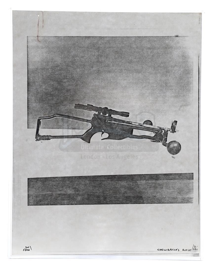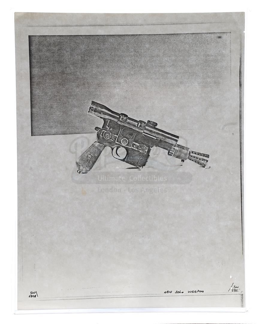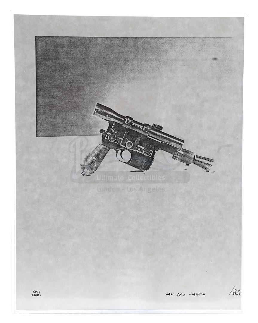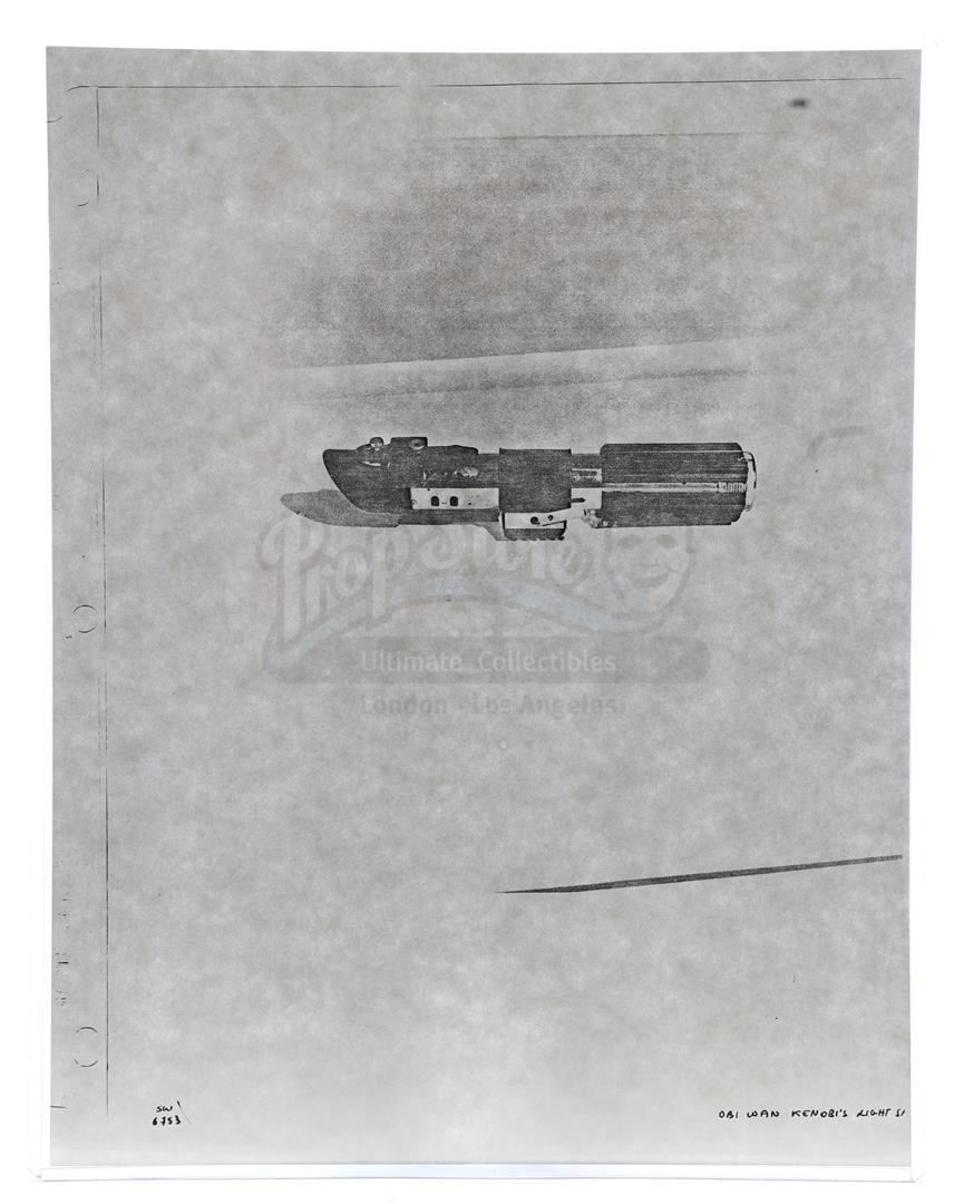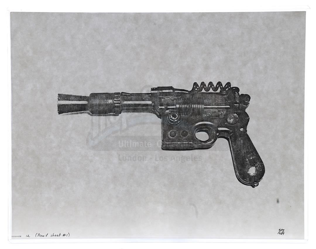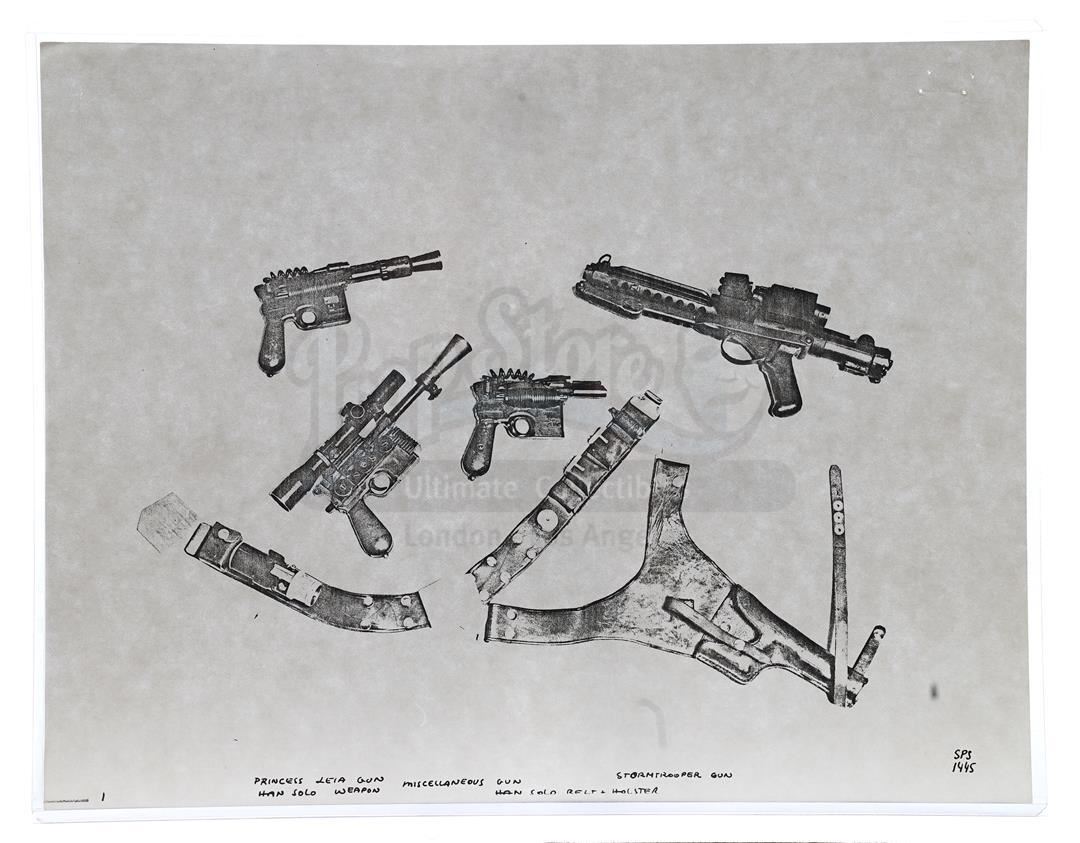 This lot will be auctioned on Thursday, July 1st. The auction will begin at 9:00am PDT and lots are sold sequentially via live auctioneer; tune in to the live streaming broadcast on auction day to follow the pace. Note other lots in the auction may close on June 29th or June 30th. Weapons research images from George Lucas's Star Wars: A New Hope. This set of 62 black-and-white photostats of original photographs was created by Industrial Light & Magic (ILM) art director James L. Schoppe to document the original weapon designs seen in the film. Among the weapons featured are Han Solo's (Harrison Ford) blaster, Princess Leia's (Carrie Fisher) blaster and belt, Chewbacca's (Peter Mayhew) bowcaster, Stormtrooper blaster rifles, and Obi-Wan Kenobi (Alec Guinness) and Darth Vader's (James Earl Jones) lightsabers. The archive exhibits creasing, slight tears, and storage wear, but remains in good overall condition. Dimensions (each): 8" x 11.5" (3.14 cm x 4.5 cm) Estimate: $800 - 1,200