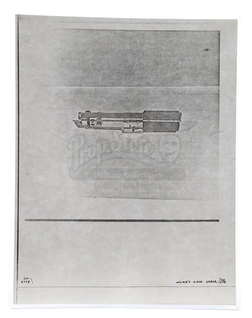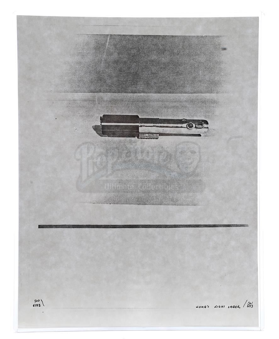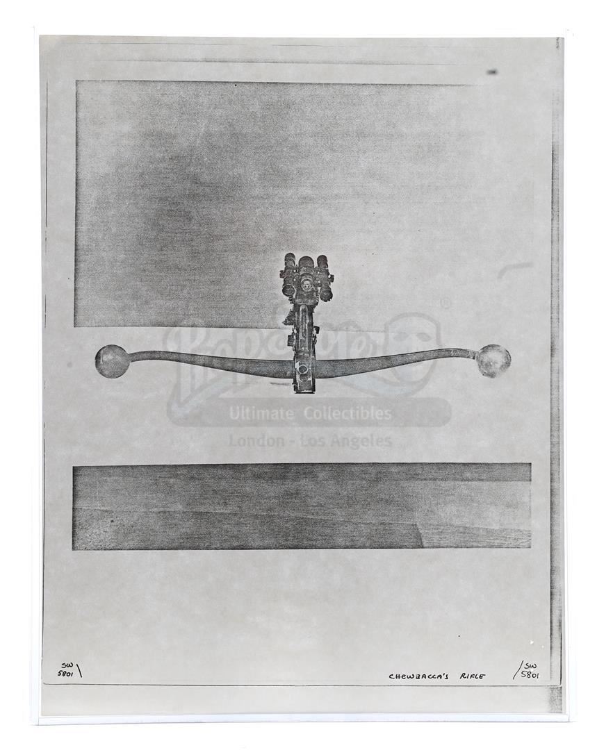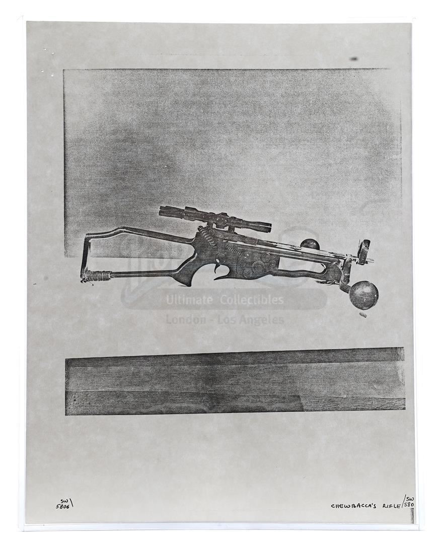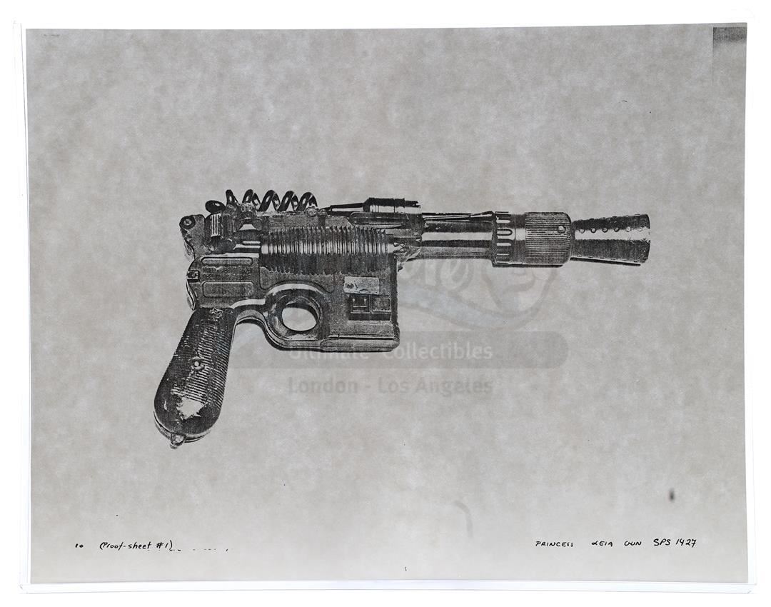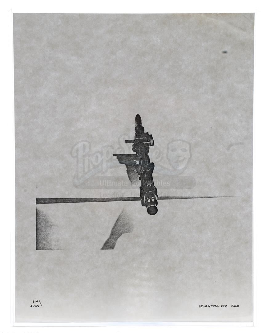 This lot will be auctioned on Thursday, July 1st. The auction will begin at 9:00am PDT and lots are sold sequentially via live auctioneer; tune in to the live streaming broadcast on auction day to follow the pace. Note other lots in the auction may close on June 29th or June 30th. Weapons research images from George Lucas's Star Wars: A New Hope. This set of 62 black-and-white photostats of original photographs was created by Industrial Light & Magic (ILM) art director James L. Schoppe to document the original weapon designs seen in the film. Among the weapons featured are Han Solo's (Harrison Ford) blaster, Princess Leia's (Carrie Fisher) blaster and belt, Chewbacca's (Peter Mayhew) bowcaster, Stormtrooper blaster rifles, and Obi-Wan Kenobi (Alec Guinness) and Darth Vader's (James Earl Jones) lightsabers. The archive exhibits creasing, slight tears, and storage wear, but remains in good overall condition. Dimensions (each): 8" x 11.5" (3.14 cm x 4.5 cm) Estimate: $800 - 1,200