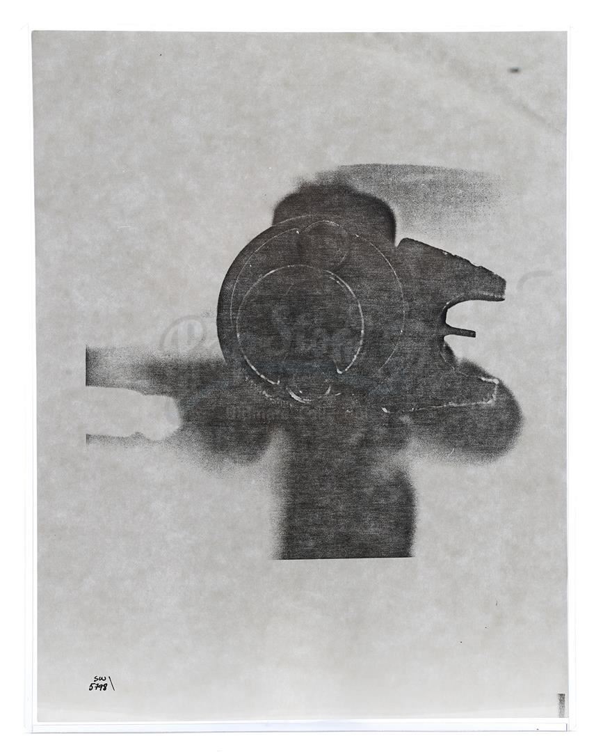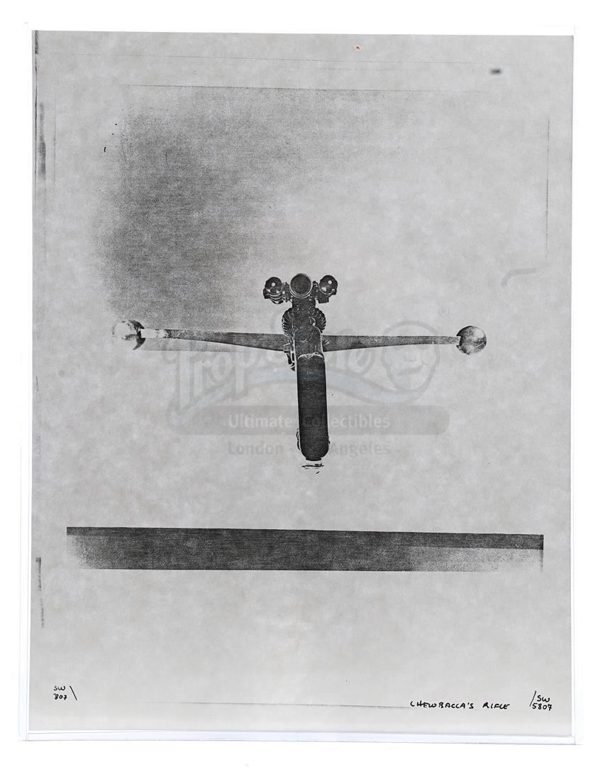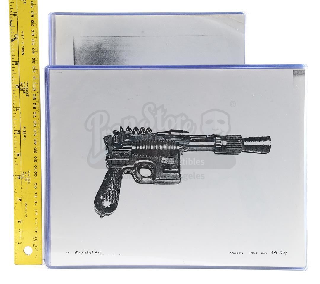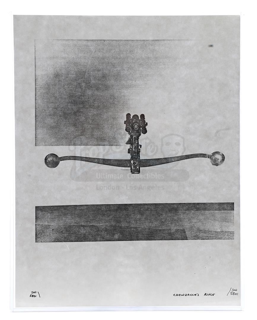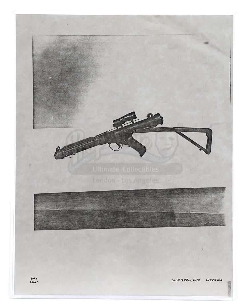 This lot will be auctioned on Thursday, July 1st. The auction will begin at 9:00am PDT and lots are sold sequentially via live auctioneer; tune in to the live streaming broadcast on auction day to follow the pace. Note other lots in the auction may close on June 29th or June 30th. Weapons research images from George Lucas's Star Wars: A New Hope. This set of 62 black-and-white photostats of original photographs was created by Industrial Light & Magic (ILM) art director James L. Schoppe to document the original weapon designs seen in the film. Among the weapons featured are Han Solo's (Harrison Ford) blaster, Princess Leia's (Carrie Fisher) blaster and belt, Chewbacca's (Peter Mayhew) bowcaster, Stormtrooper blaster rifles, and Obi-Wan Kenobi (Alec Guinness) and Darth Vader's (James Earl Jones) lightsabers. The archive exhibits creasing, slight tears, and storage wear, but remains in good overall condition. Dimensions (each): 8" x 11.5" (3.14 cm x 4.5 cm) Estimate: $800 - 1,200