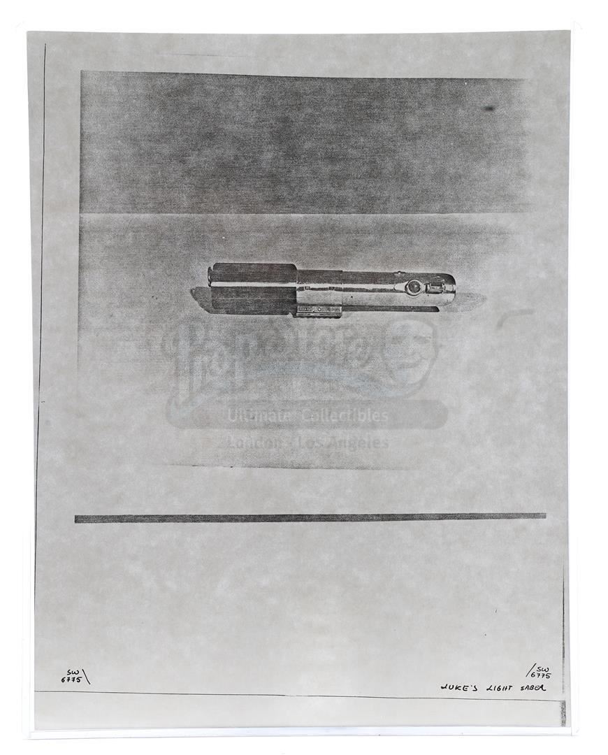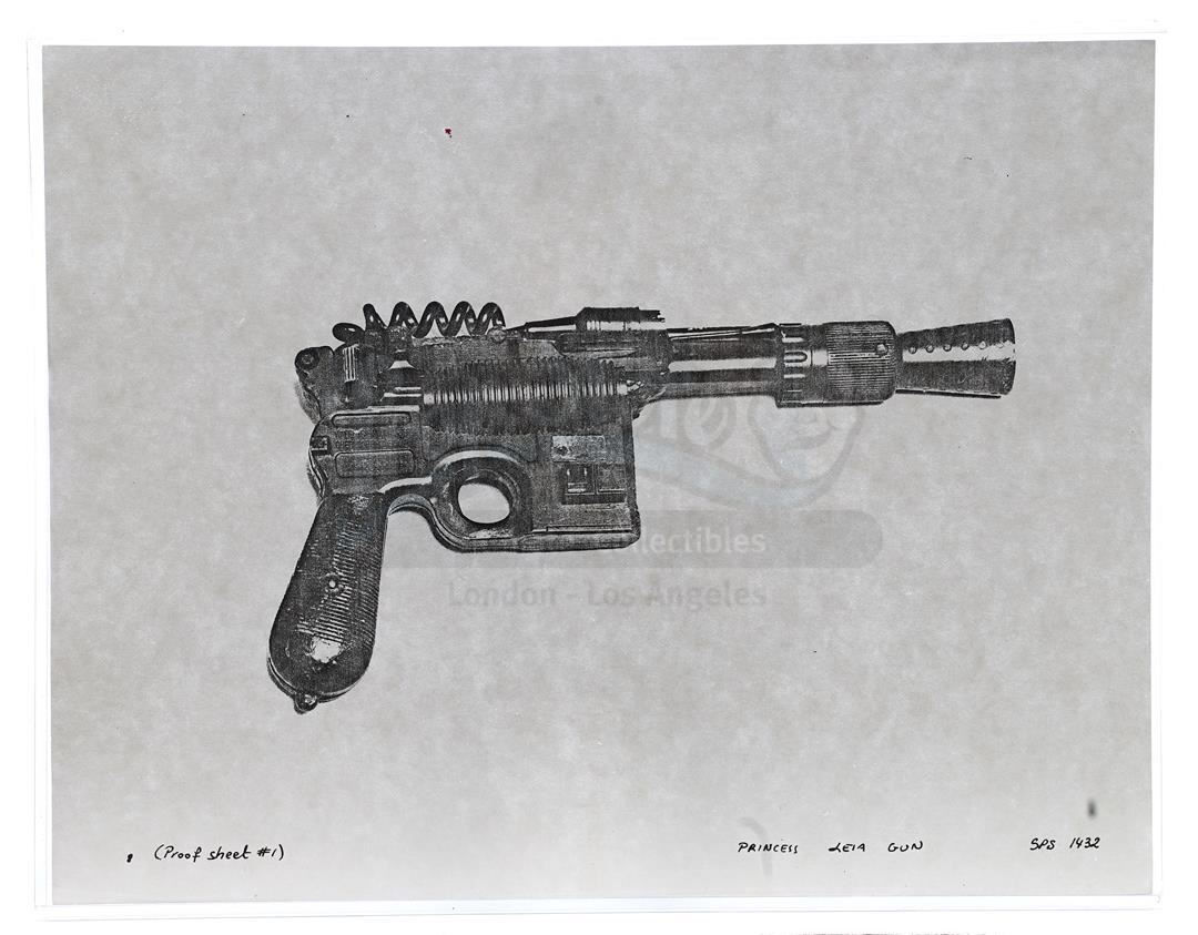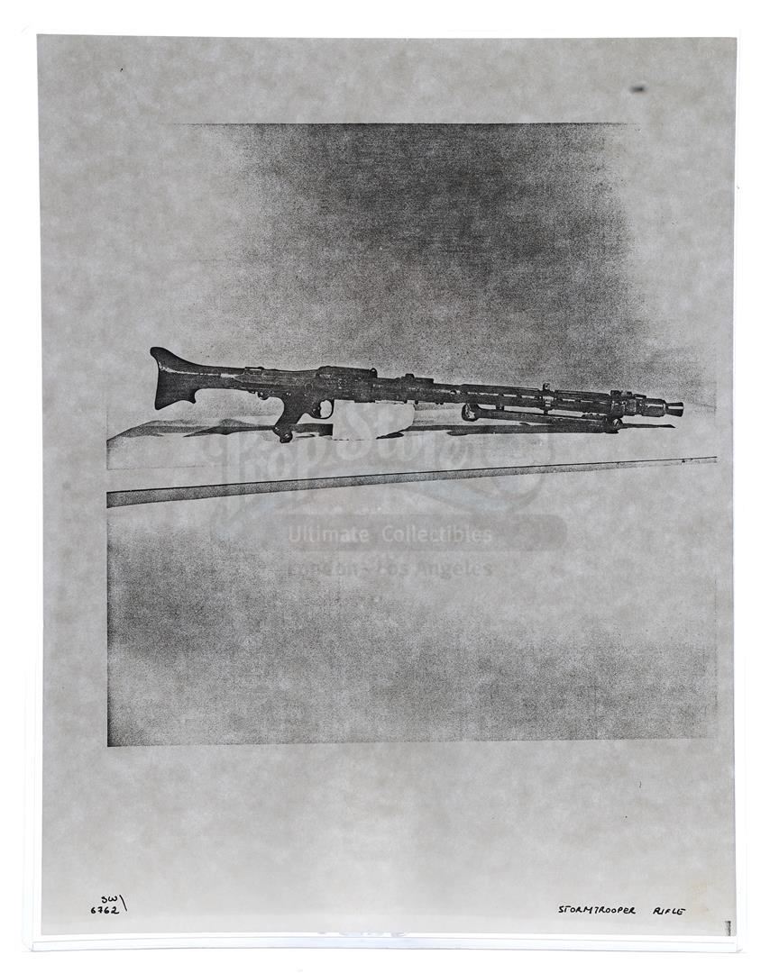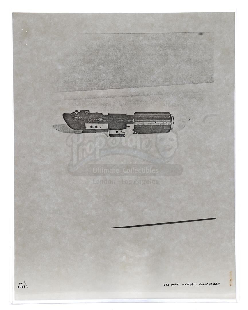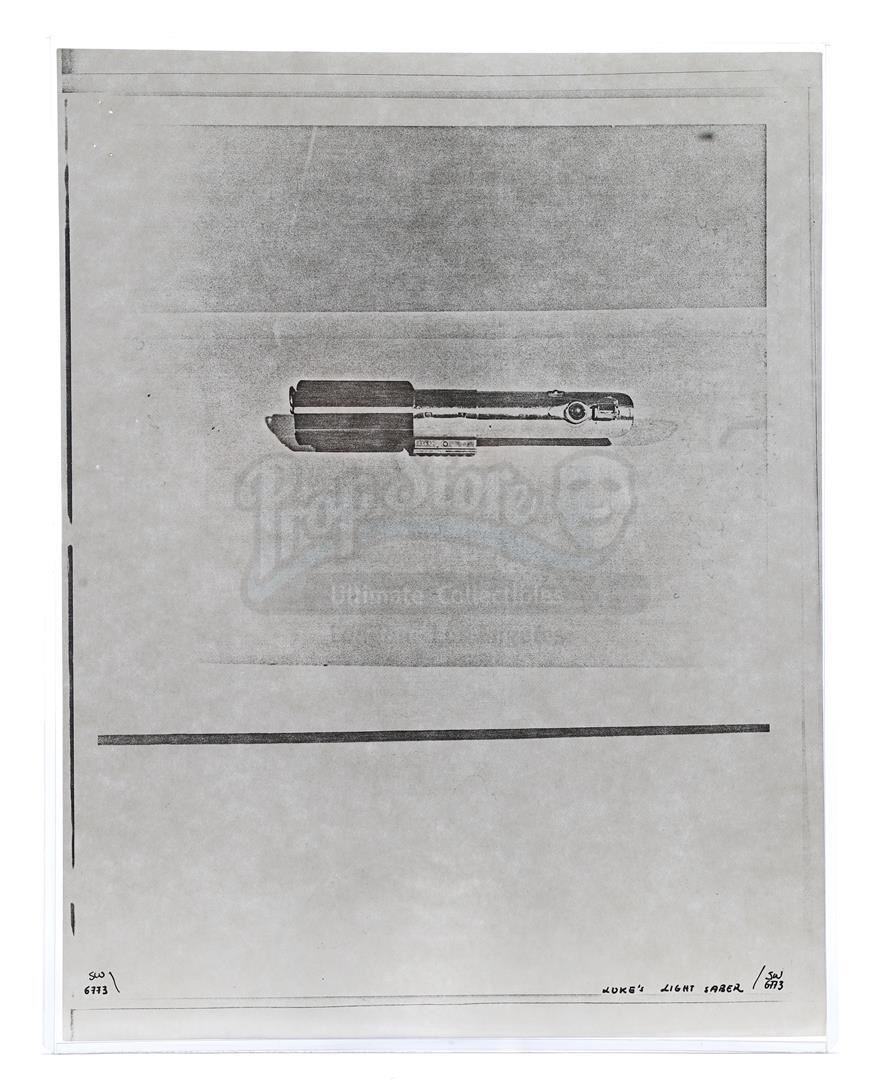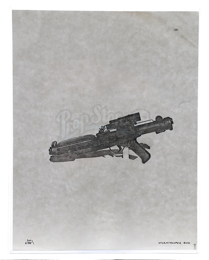 This lot will be auctioned on Thursday, July 1st. The auction will begin at 9:00am PDT and lots are sold sequentially via live auctioneer; tune in to the live streaming broadcast on auction day to follow the pace. Note other lots in the auction may close on June 29th or June 30th. Weapons research images from George Lucas's Star Wars: A New Hope. This set of 62 black-and-white photostats of original photographs was created by Industrial Light & Magic (ILM) art director James L. Schoppe to document the original weapon designs seen in the film. Among the weapons featured are Han Solo's (Harrison Ford) blaster, Princess Leia's (Carrie Fisher) blaster and belt, Chewbacca's (Peter Mayhew) bowcaster, Stormtrooper blaster rifles, and Obi-Wan Kenobi (Alec Guinness) and Darth Vader's (James Earl Jones) lightsabers. The archive exhibits creasing, slight tears, and storage wear, but remains in good overall condition. Dimensions (each): 8" x 11.5" (3.14 cm x 4.5 cm) Estimate: $800 - 1,200
