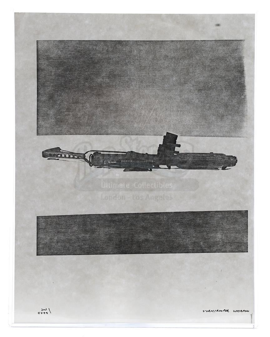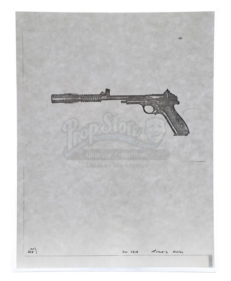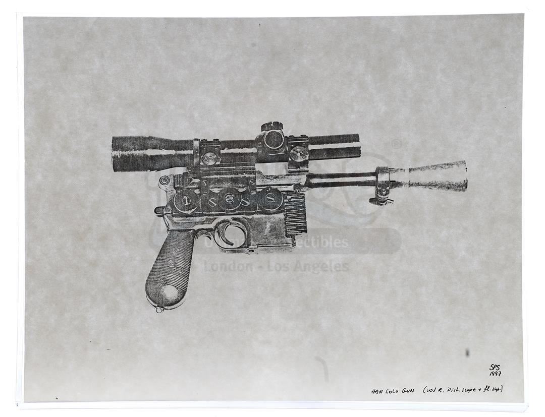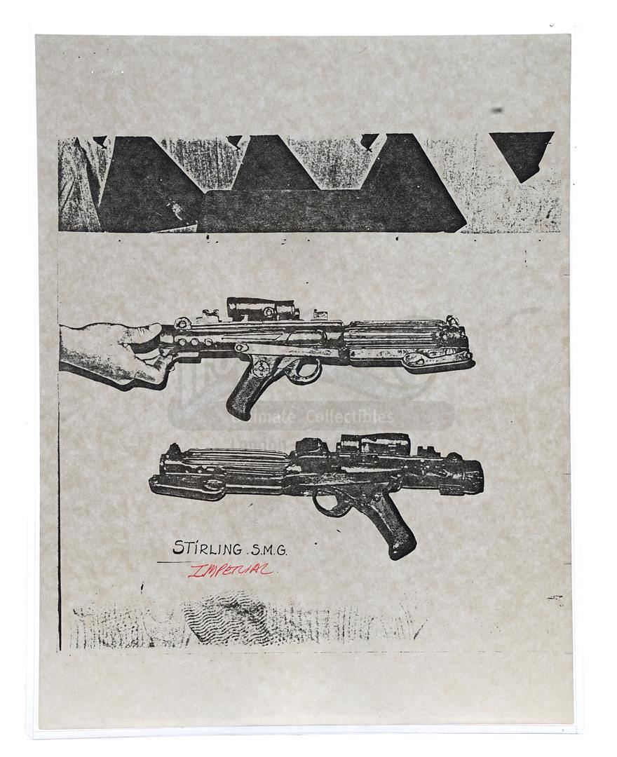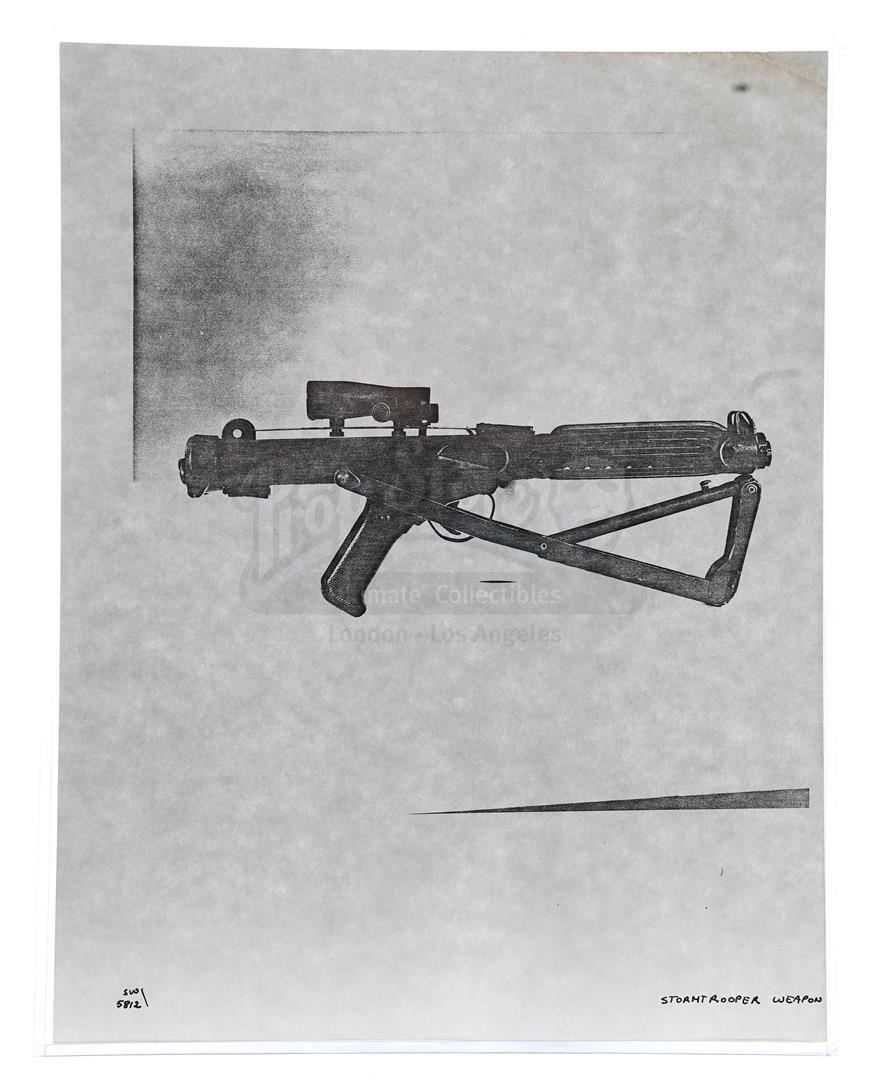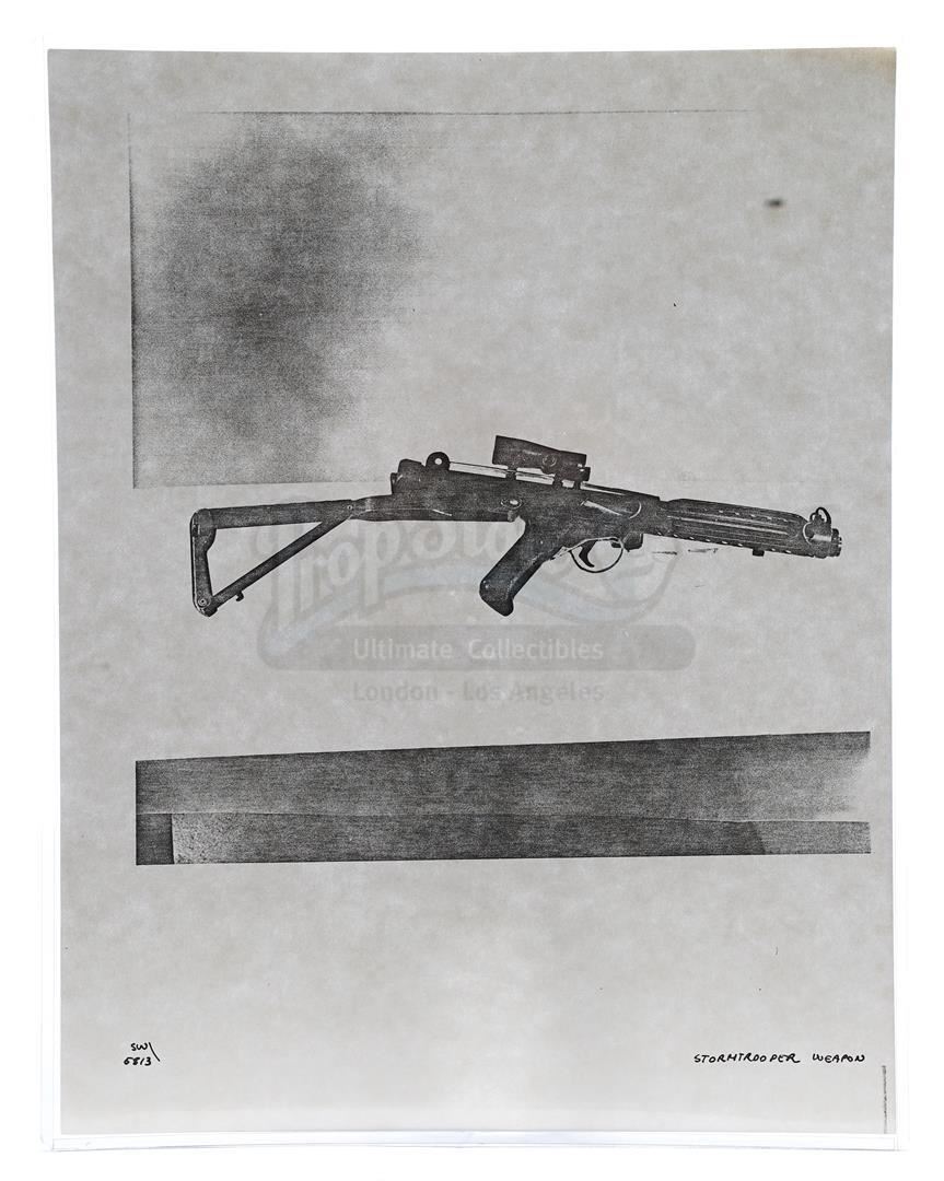This lot will be auctioned on Thursday, July 1st. The auction will begin at 9:00am PDT and lots are sold sequentially via live auctioneer; tune in to the live streaming broadcast on auction day to follow the pace. Note other lots in the auction may close on June 29th or June 30th. Weapons research images from George Lucas's Star Wars: A New Hope. This set of 62 black-and-white photostats of original photographs was created by Industrial Light & Magic (ILM) art director James L. Schoppe to document the original weapon designs seen in the film. Among the weapons featured are Han Solo's (Harrison Ford) blaster, Princess Leia's (Carrie Fisher) blaster and belt, Chewbacca's (Peter Mayhew) bowcaster, Stormtrooper blaster rifles, and Obi-Wan Kenobi (Alec Guinness) and Darth Vader's (James Earl Jones) lightsabers. The archive exhibits creasing, slight tears, and storage wear, but remains in good overall condition. Dimensions (each): 8" x 11.5" (3.14 cm x 4.5 cm) Estimate: $800 - 1,200