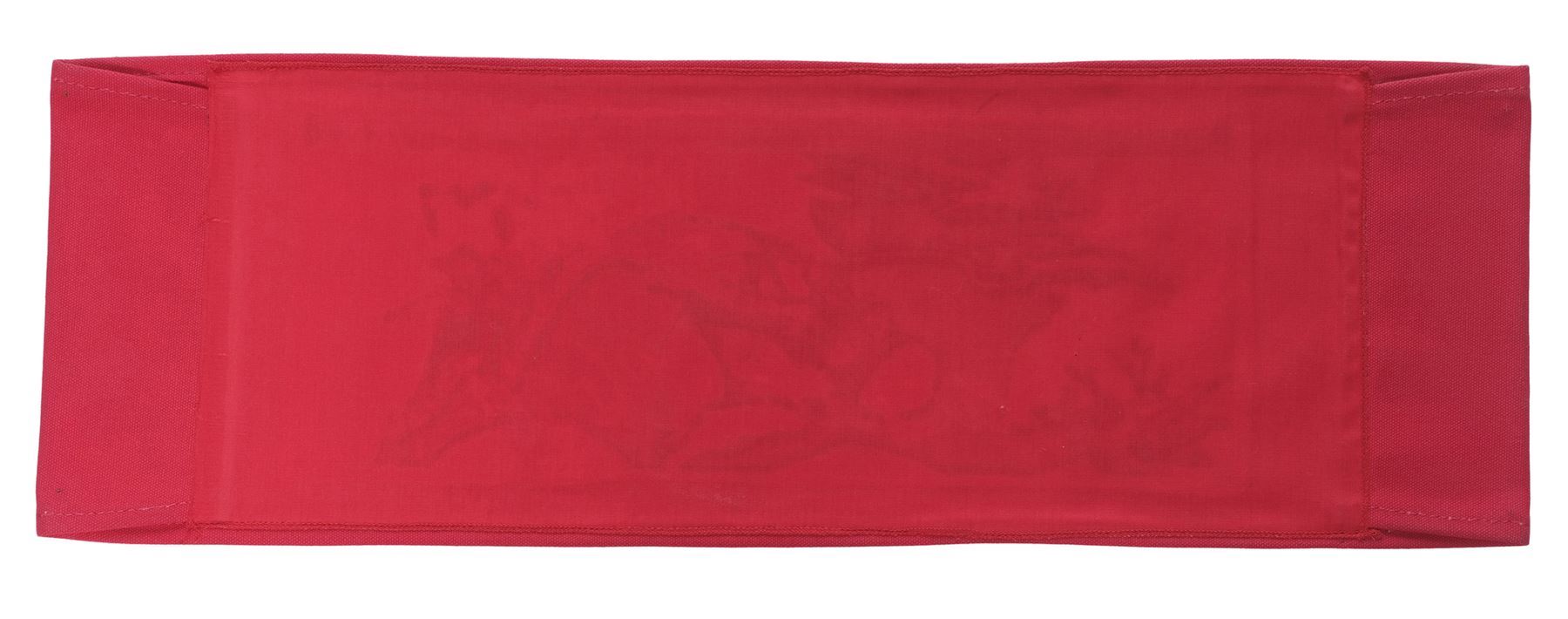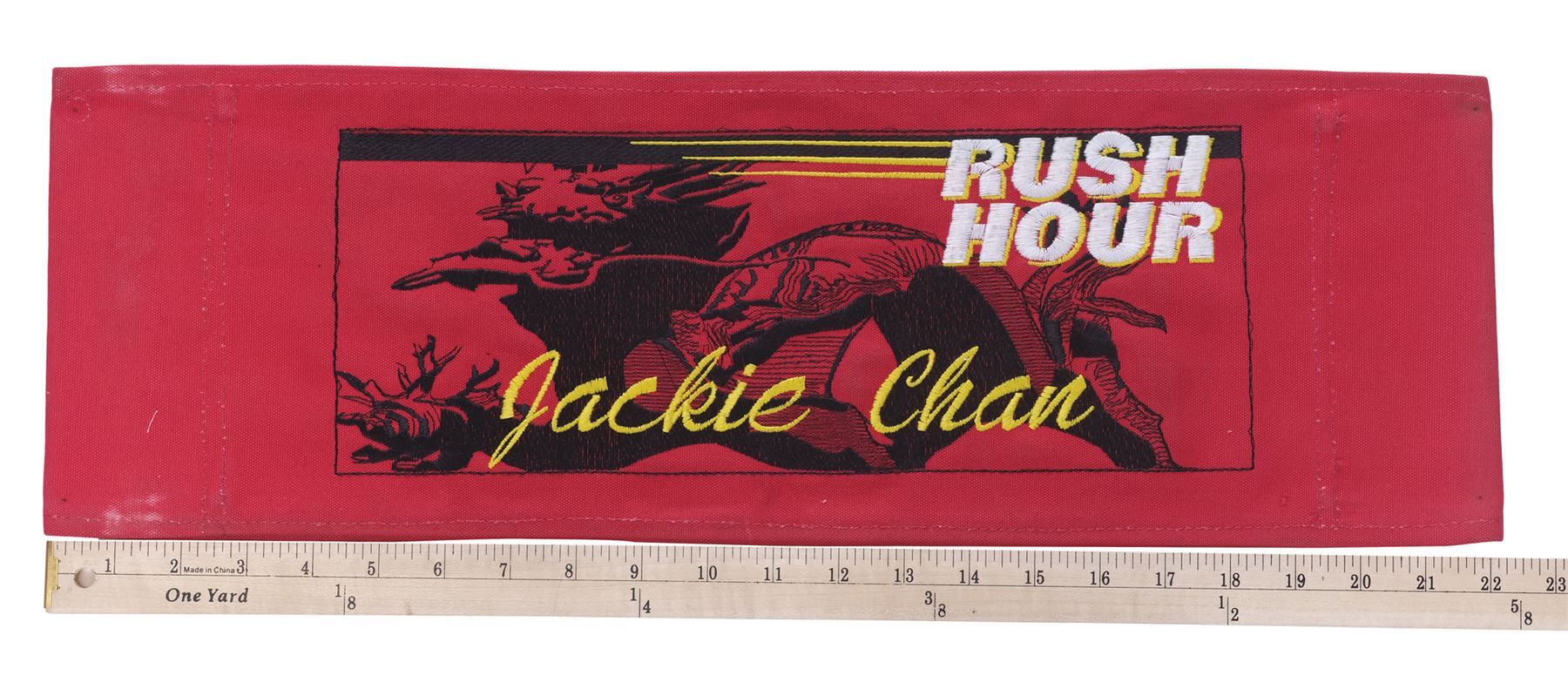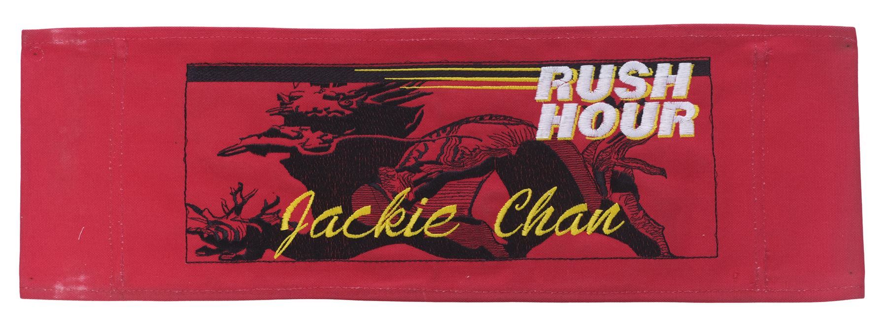 RUSH HOUR (1998) - Jackie Chan's Chairback - Jackie Chan's chairback from Brett Ratner's action film Rush Hour. This red canvas hairback is embroidered "Rush Hour" in white thread and "Jackie Chan" in gold-color thread over the production's dragon logo, which is printed in black on front. It exhibits white stains on the top and bottom edges from being affixed to a director's chair during production. Dimensions: 8" x 21.5" x 0.25" (20.5 cm x 54.75 cm x 0.75 cm)
