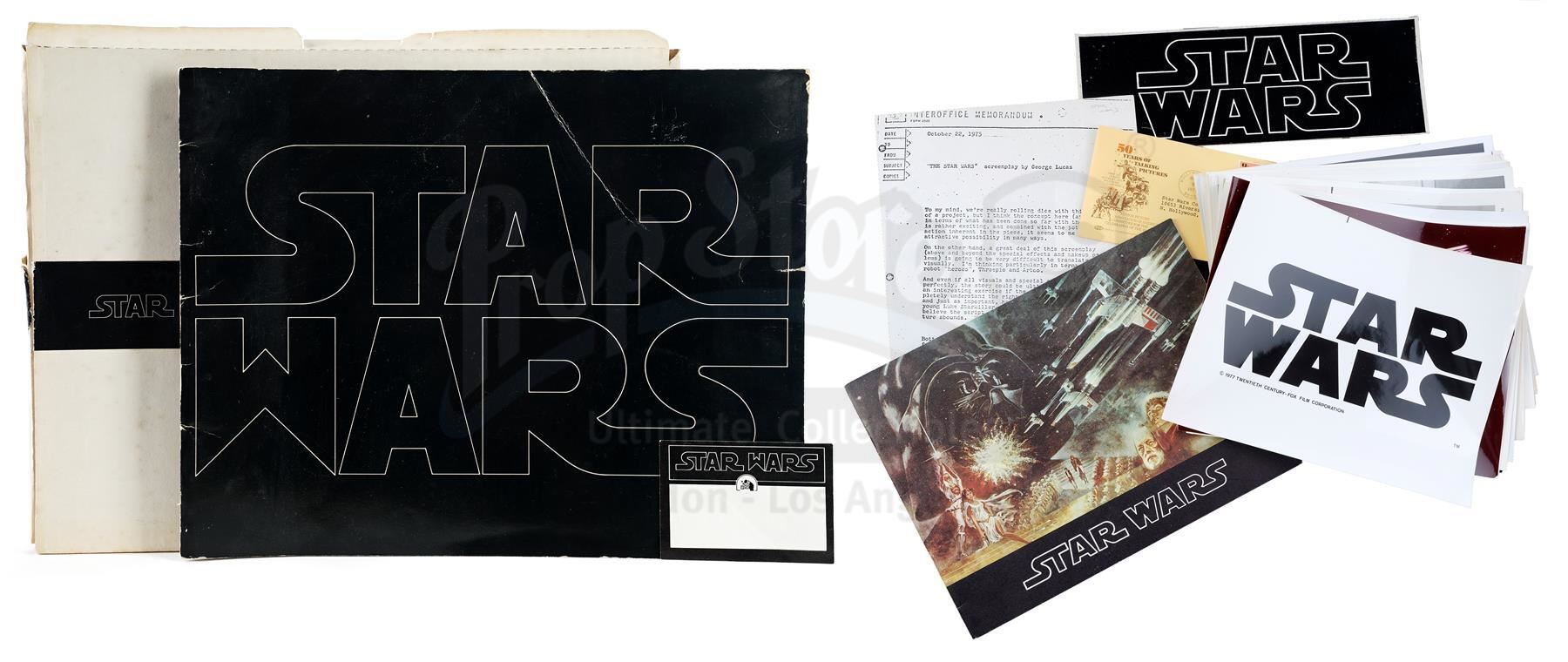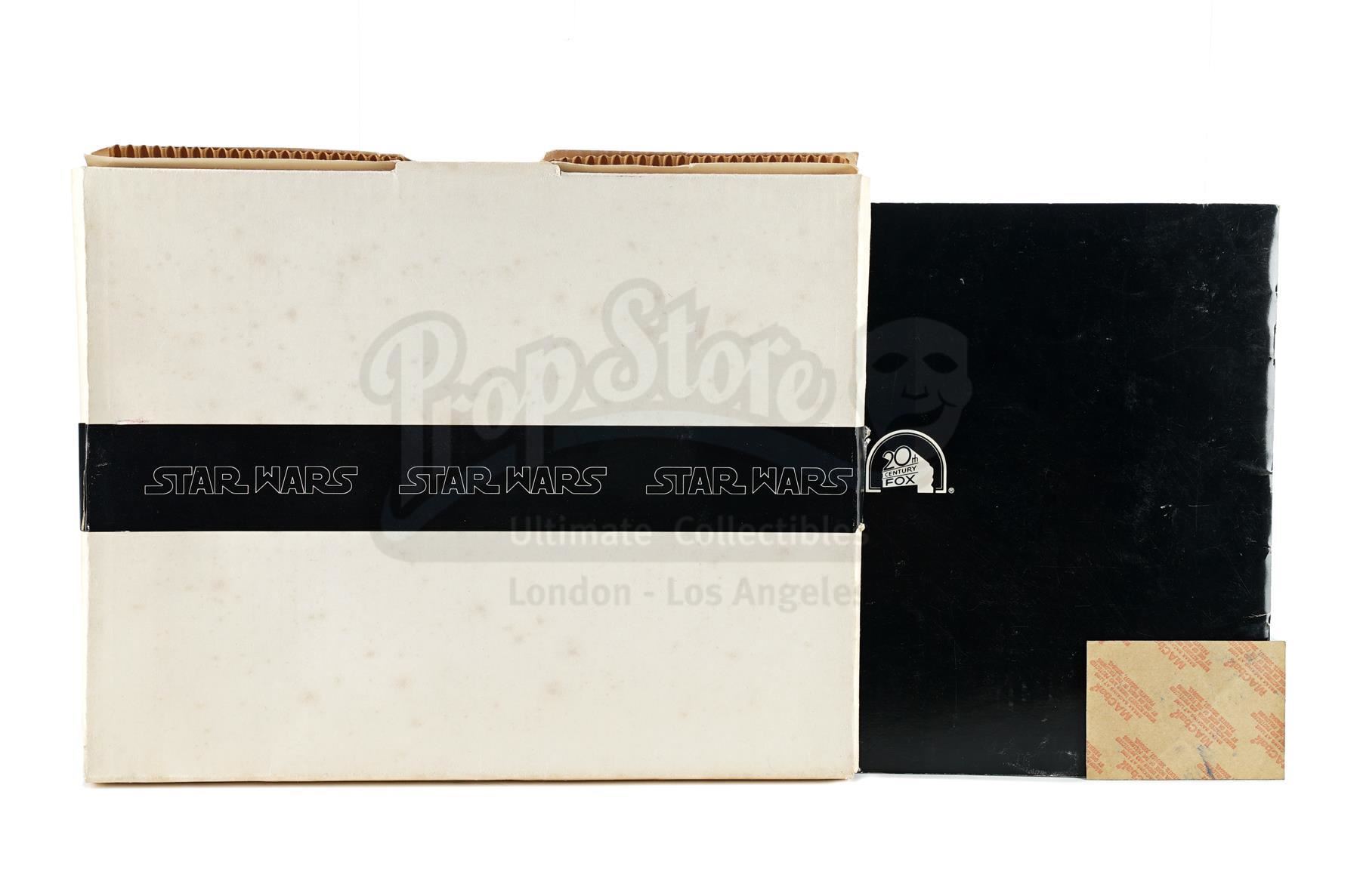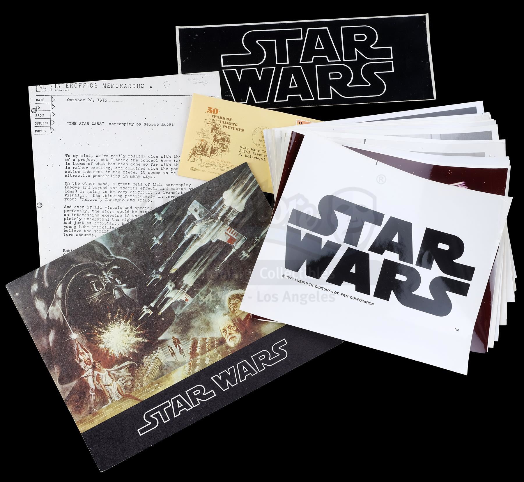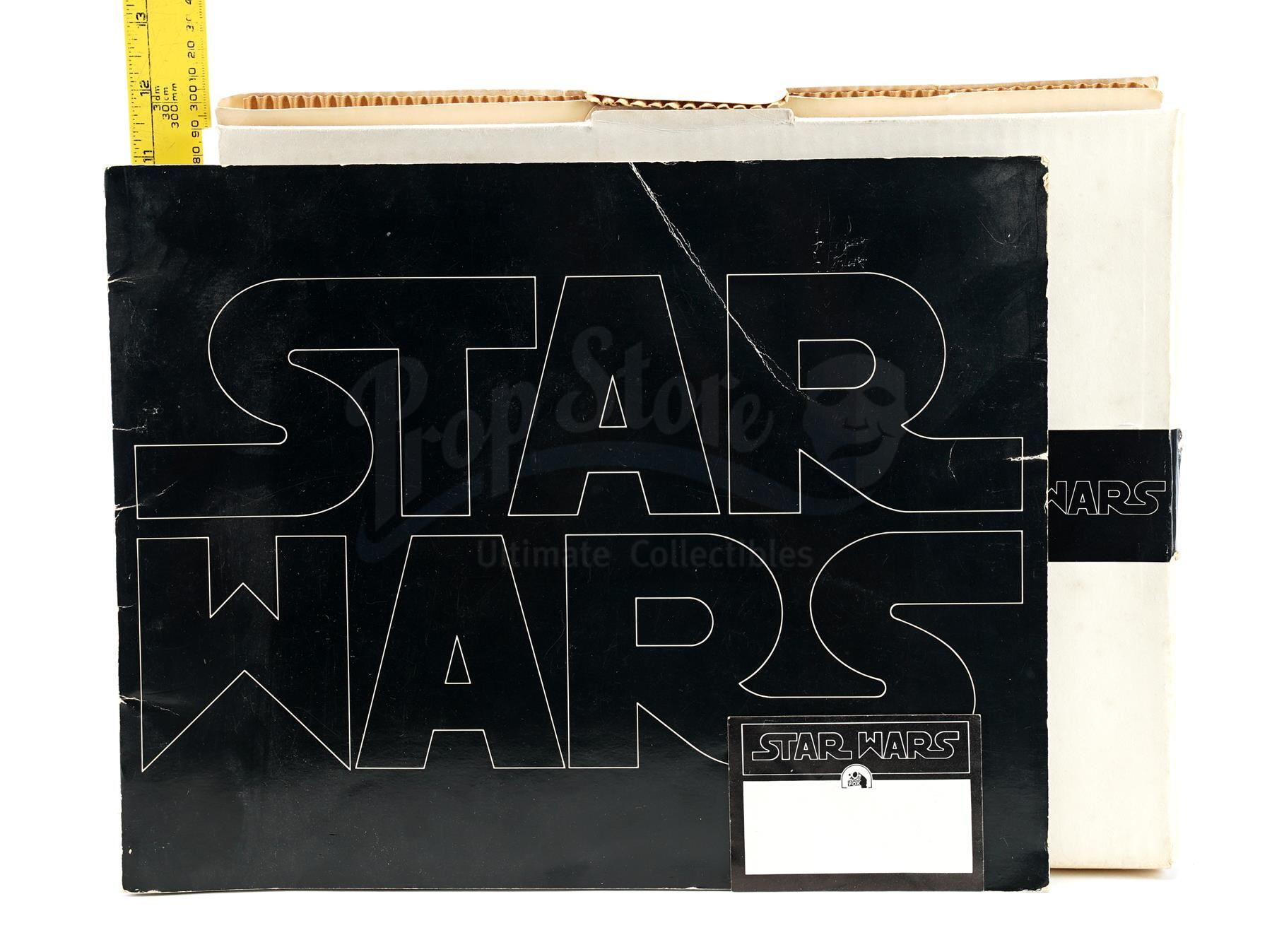 This lot will be auctioned on Thursday, July 1st. The auction will begin at 9:00am PDT and lots are sold sequentially via live auctioneer; tune in to the live streaming broadcast on auction day to follow the pace. Note other lots in the auction may close on June 29th or June 30th. A booklet, box, and stills from the promotion of George Lucas' Star Wars: A New Hope with Star Wars Corporation (SWC) paperwork. Lucas founded SWC in 1973 to maintain control of the franchise. This lot consists of a paper promo booklet featuring an early version of the film's logo; an unused shipping label with the same logo; the booklet's cardboard shipping box; 17 black-and-white promotional stills; a color still; an interoffice memorandum dated "October 22, 1975;" and an envelope addressed to "Star Wars Corporation." It is in good overall condition with minor creasing, tearing, and opening throughout. Dimensions (boxed): 17.5" x 13" x 3.5" (44.5 cm x 33 cm x 9 cm) Estimate: $500 - 700