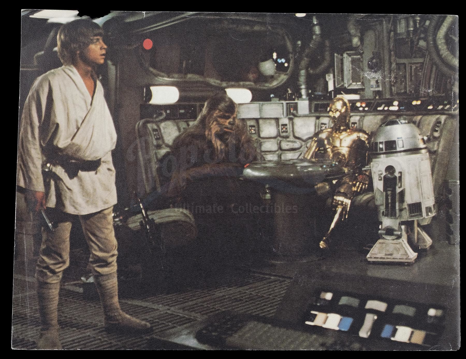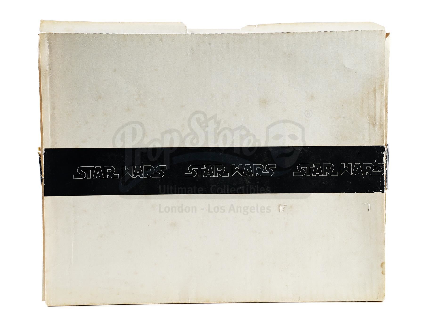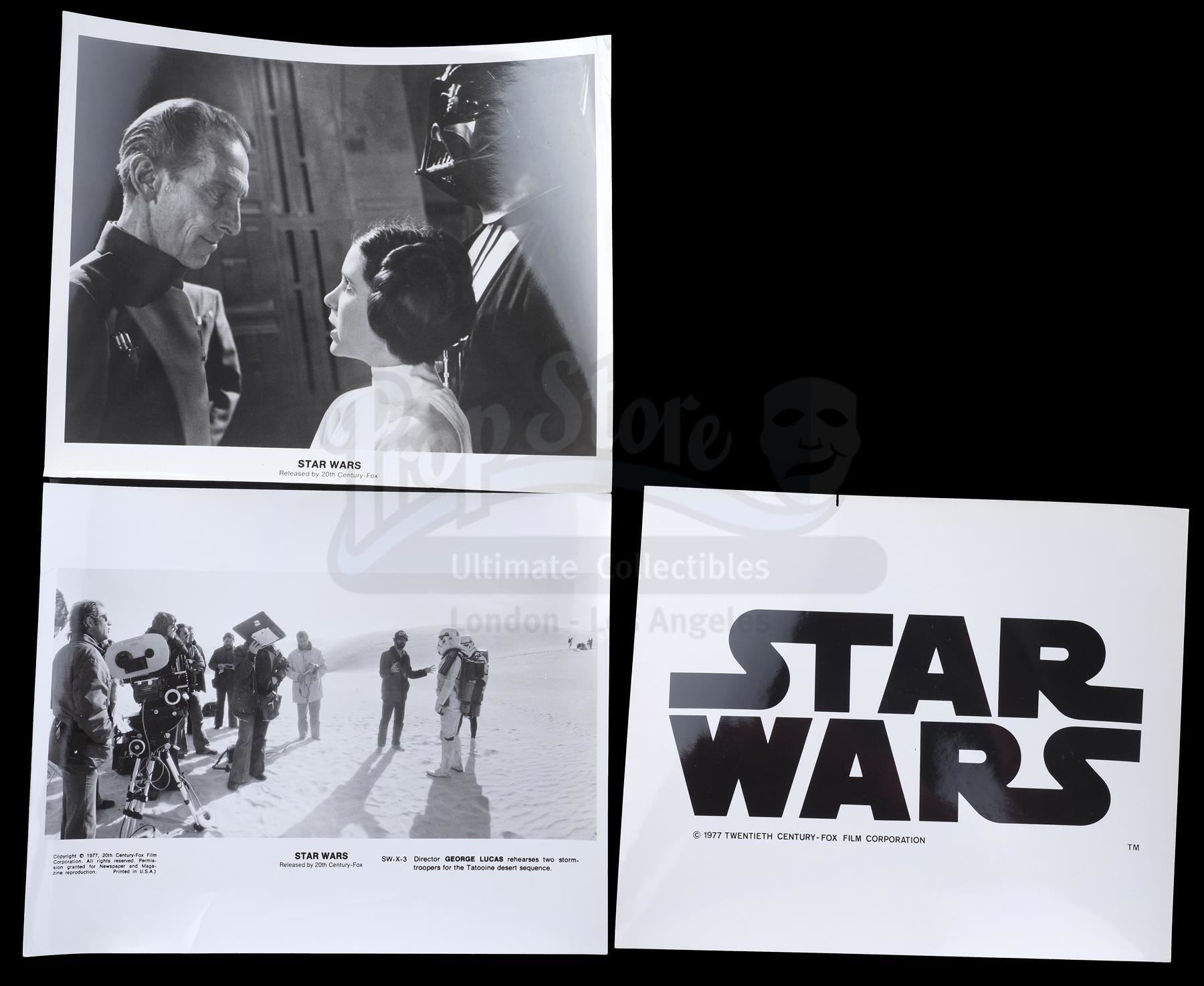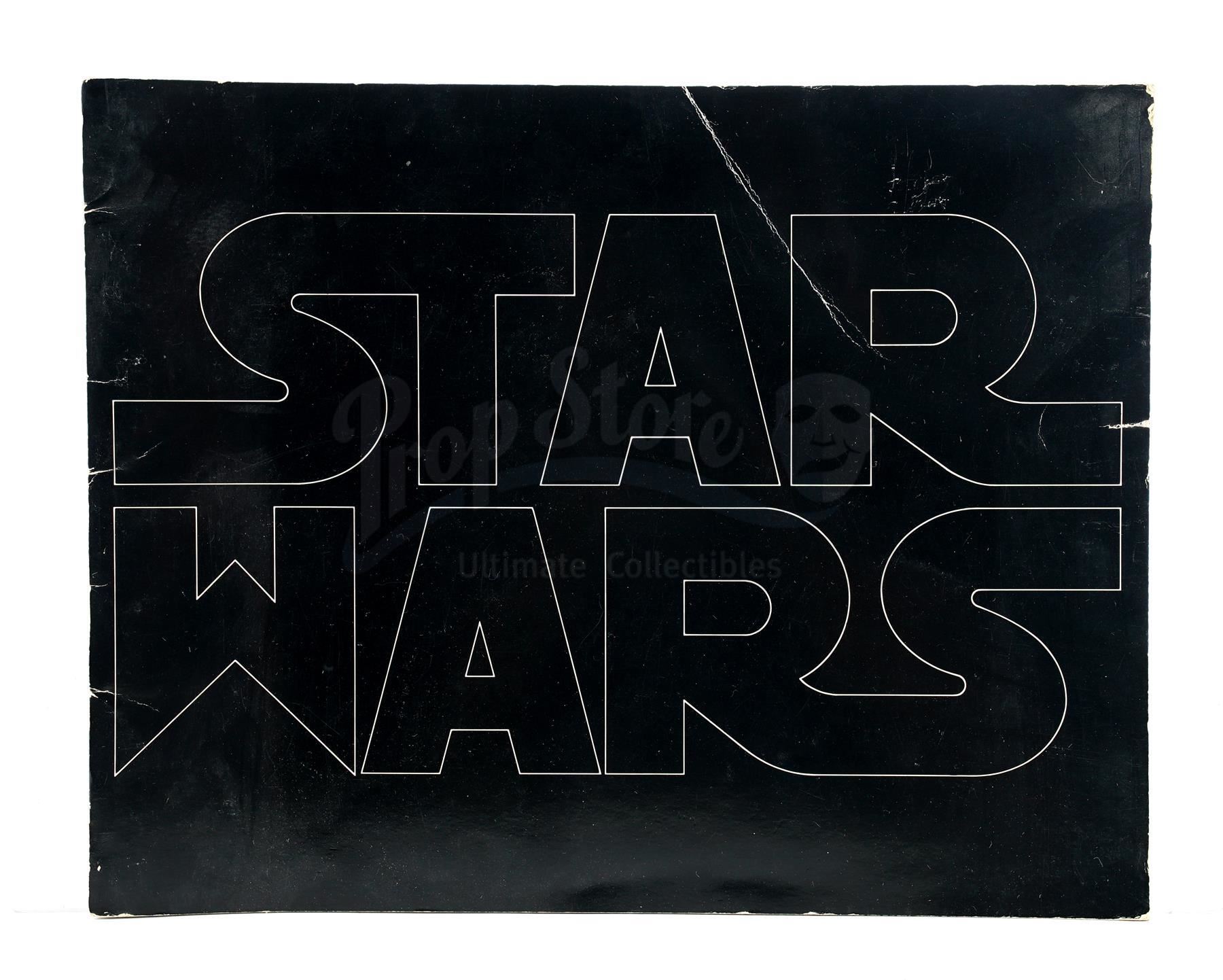 This lot will be auctioned on Thursday, July 1st. The auction will begin at 9:00am PDT and lots are sold sequentially via live auctioneer; tune in to the live streaming broadcast on auction day to follow the pace. Note other lots in the auction may close on June 29th or June 30th. A booklet, box, and stills from the promotion of George Lucas' Star Wars: A New Hope with Star Wars Corporation (SWC) paperwork. Lucas founded SWC in 1973 to maintain control of the franchise. This lot consists of a paper promo booklet featuring an early version of the film's logo; an unused shipping label with the same logo; the booklet's cardboard shipping box; 17 black-and-white promotional stills; a color still; an interoffice memorandum dated "October 22, 1975;" and an envelope addressed to "Star Wars Corporation." It is in good overall condition with minor creasing, tearing, and opening throughout. Dimensions (boxed): 17.5" x 13" x 3.5" (44.5 cm x 33 cm x 9 cm) Estimate: $500 - 700