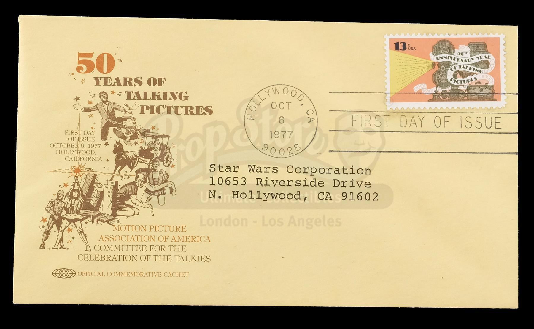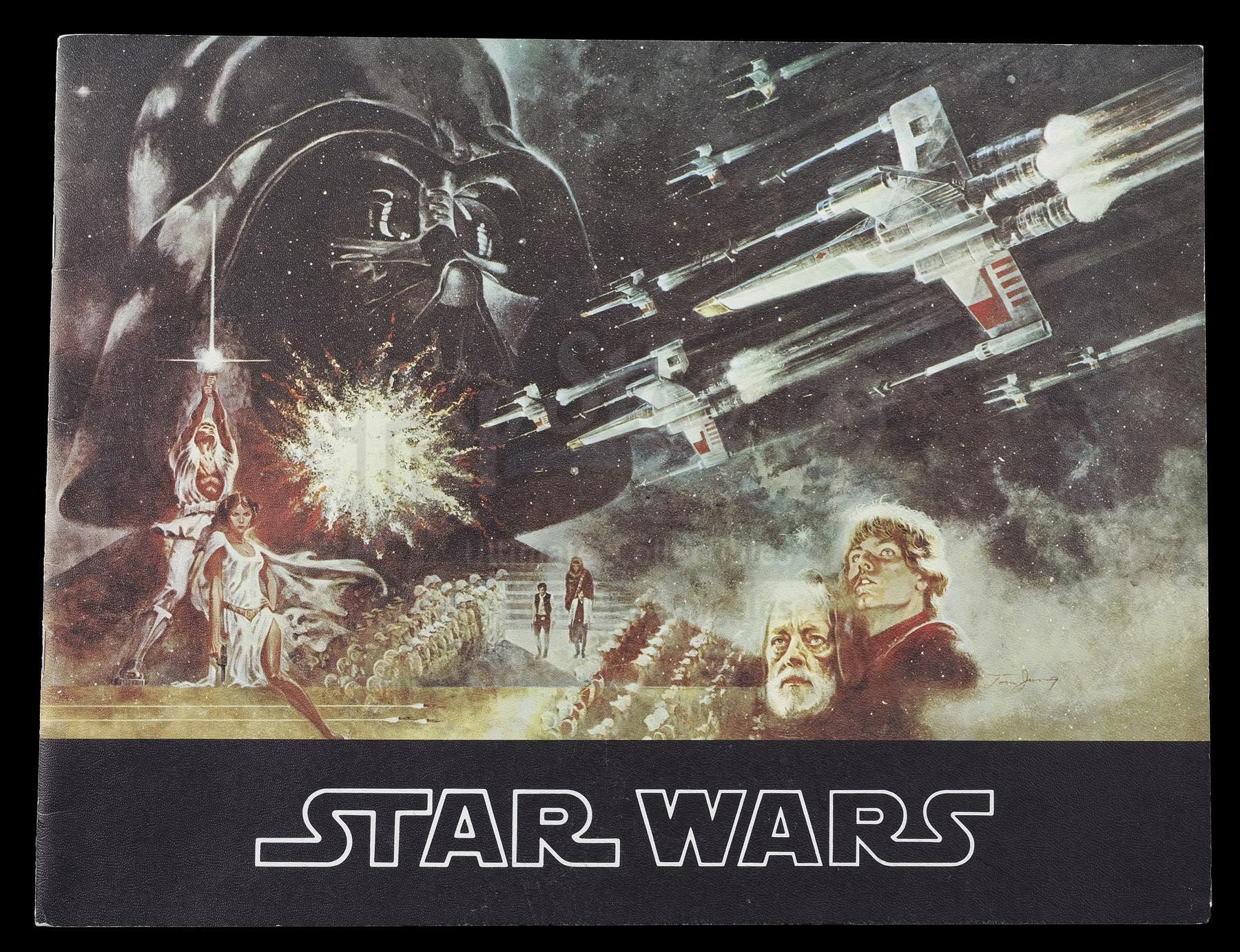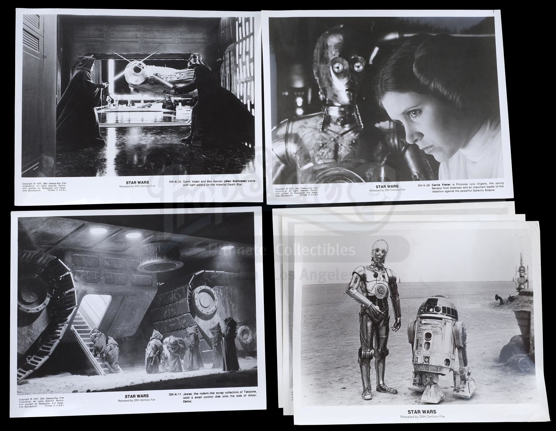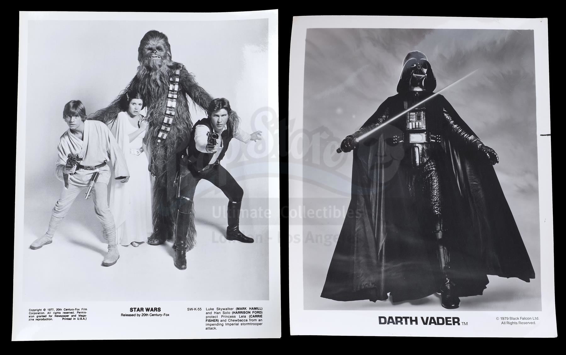 This lot will be auctioned on Thursday, July 1st. The auction will begin at 9:00am PDT and lots are sold sequentially via live auctioneer; tune in to the live streaming broadcast on auction day to follow the pace. Note other lots in the auction may close on June 29th or June 30th. A booklet, box, and stills from the promotion of George Lucas' Star Wars: A New Hope with Star Wars Corporation (SWC) paperwork. Lucas founded SWC in 1973 to maintain control of the franchise. This lot consists of a paper promo booklet featuring an early version of the film's logo; an unused shipping label with the same logo; the booklet's cardboard shipping box; 17 black-and-white promotional stills; a color still; an interoffice memorandum dated "October 22, 1975;" and an envelope addressed to "Star Wars Corporation." It is in good overall condition with minor creasing, tearing, and opening throughout. Dimensions (boxed): 17.5" x 13" x 3.5" (44.5 cm x 33 cm x 9 cm) Estimate: $500 - 700