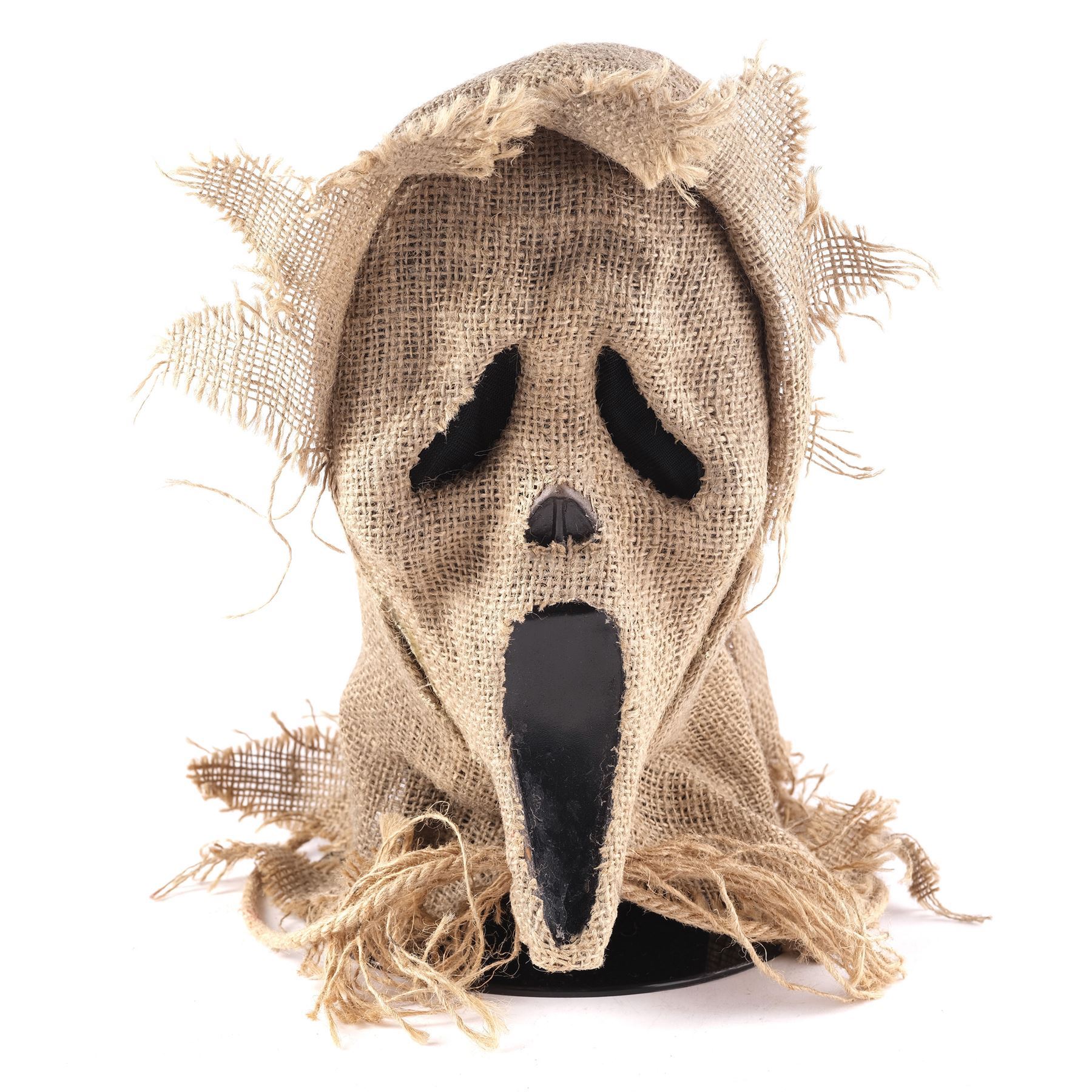 Originating from a crew member, this lot consists of one mask displayed on a black flocked styrofoam head. Commemorating Scream 4's release, filmmakers produced a small line of masks for extras to wear. This mask features a burlap-covered Ghostface-shaped mask attached to a brown burlap hood. The back of the hood features an open seam and white strips of self-fasteners. It also features two twine ties. The eyes were modified with dark mesh fabric. This lot exhibits notable snagged and loose threads and some fiber fragility.