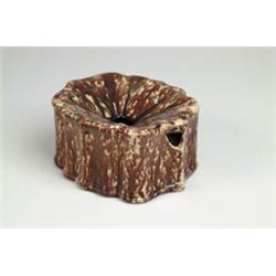 Lot # 1161: FLINT ENAMEL BENNINGTON CUSPIDOR. Unmarked. Nice green and brown mottle glaze. SIZE: 4” h x 8” w x 6-1/2” d. CONDITION: One small chip to rim, otherwise very good. 9-93937