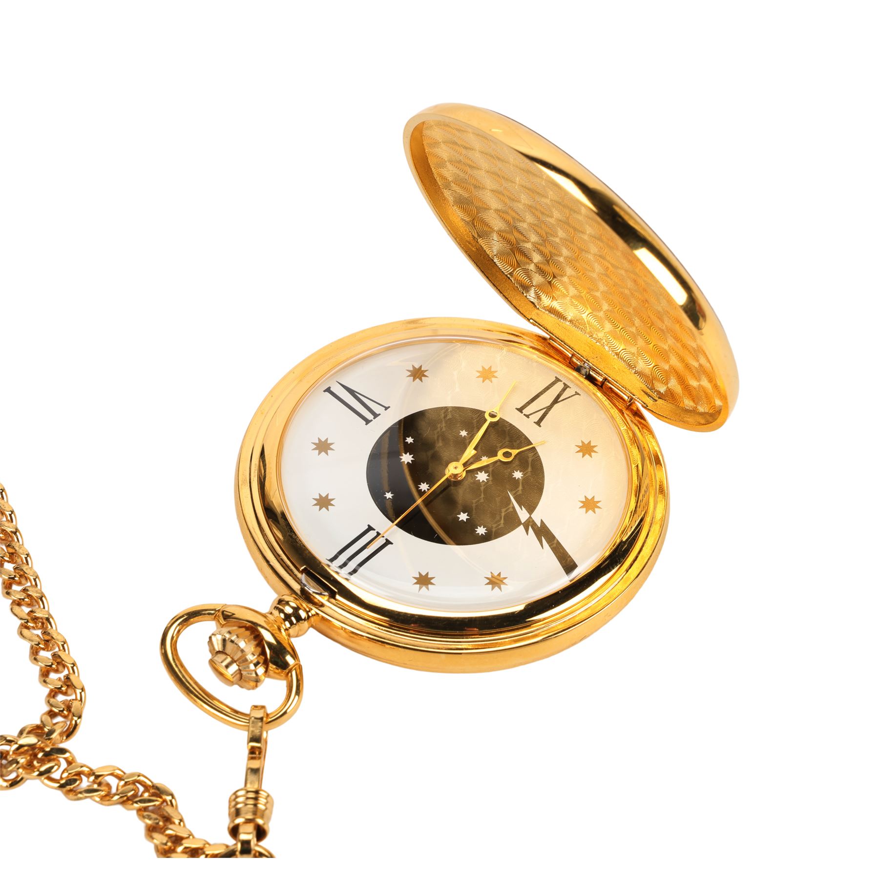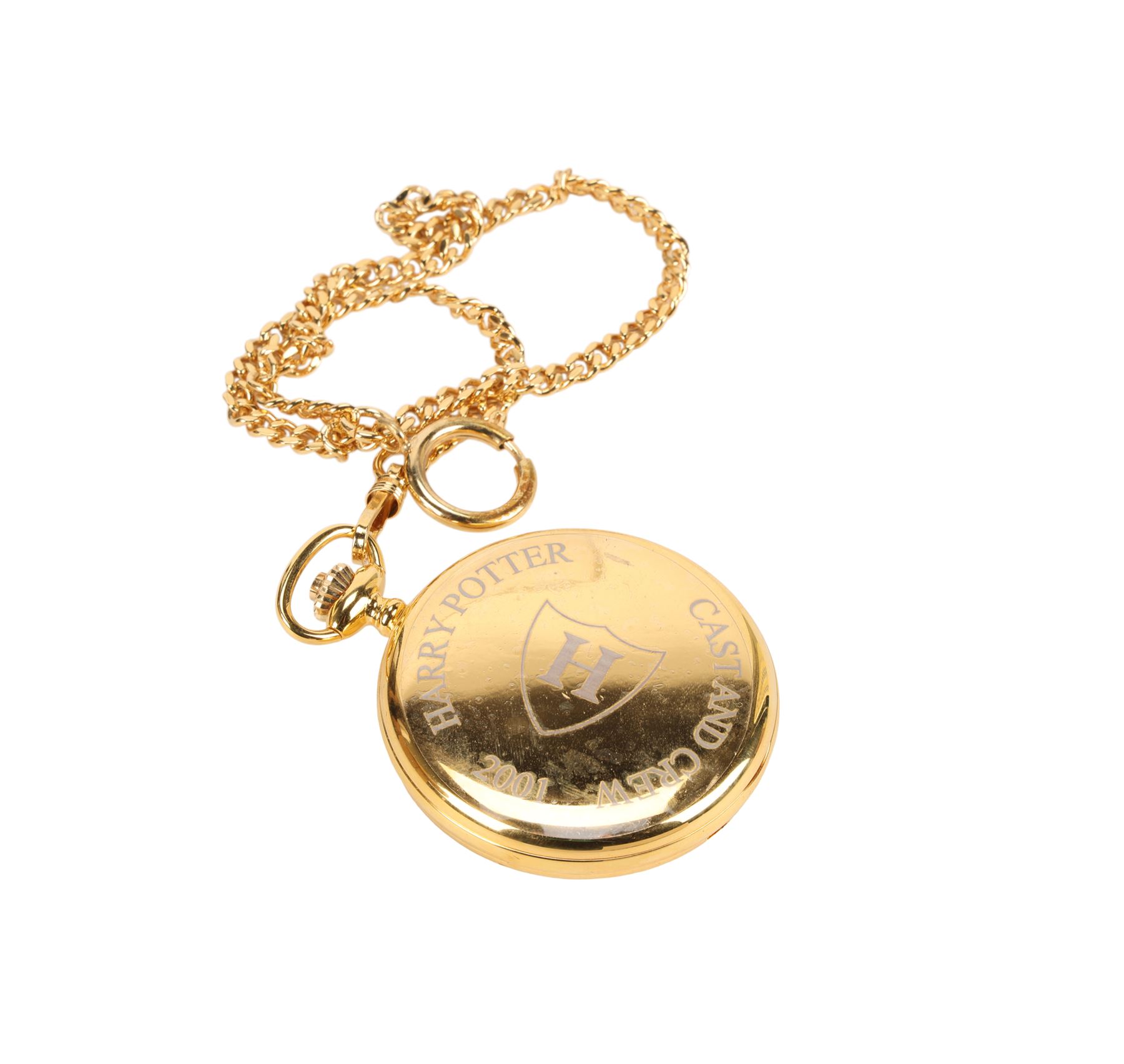 A crew pocket watch from the production of Chris Columbus' fantasy-adventure film Harry Potter and the Philosopher's Stone. This watch and others like it were gifted to crew members on completion of filming as a memento of their contribution to the production. Made from gold-plated metal, the pocket watch features a curb link chain and a white analogue face printed with a lightning bolt and stars. The inscription "Harry Potter Cast and Crew 2001" is printed on the reverse side, still covered by a clear protective sticker. The watch comes with a black velvet drawstring bag and a black presentation box. Dimensions (watch box): 10.5 cm x 10.5 cm x 3 cm (4 1/4" x 4 1/4" x 1 1/4")