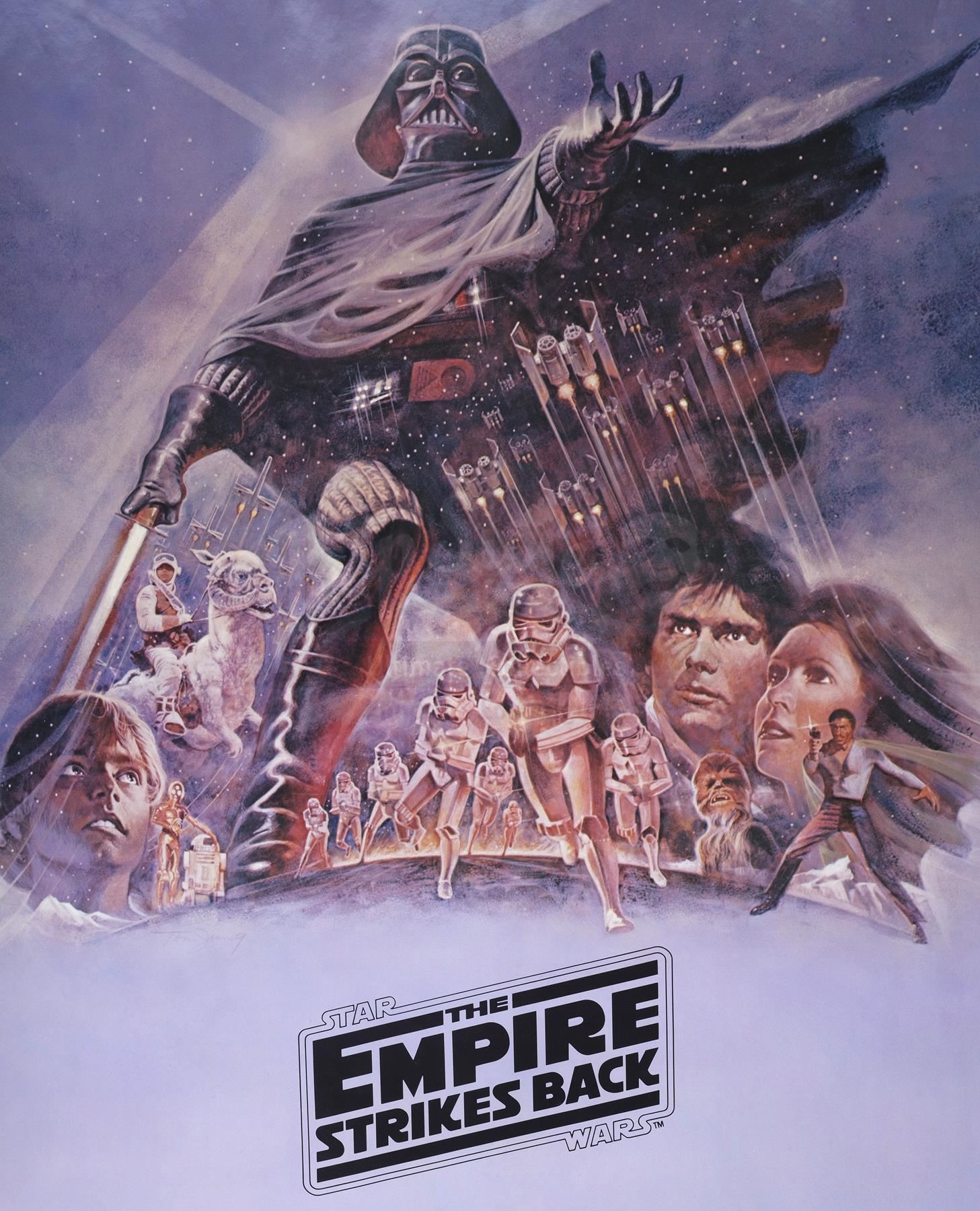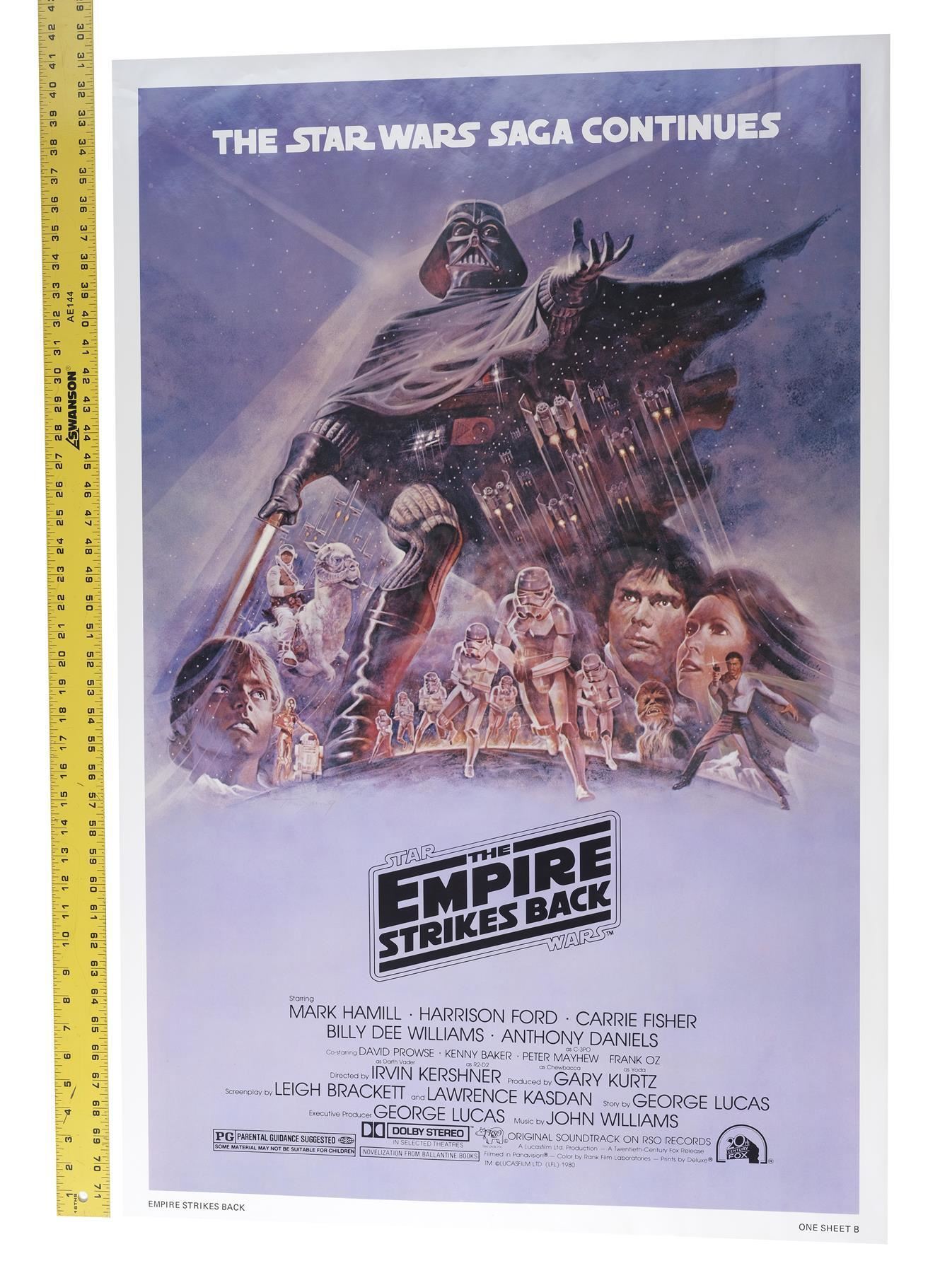This lot will be auctioned on Thursday, July 1st. The auction will begin at 9:00am PDT and lots are sold sequentially via live auctioneer; tune in to the live streaming broadcast on auction day to follow the pace. Note other lots in the auction may close on June 29th or June 30th. A Style "B" purple variant one-sheet poster from the promotion of Irvin Kershner's Star Wars: The Empire Strikes Back. Centered around an illustration of Darth Vader (David Prowse) by artist Thomas Jung, the rare purple variant of the Style "B" poster featured a distinctive dark lavender background that differentiated it from the more common light blue background version. This glossy color one-sheet comes from the collection of the film's uncredited producer, Howard Kazanjian. It is in excellent overall condition with minimal wear from handling and being rolled for storage. Dimensions: 27" x 41" (68.75 cm x 104.25 cm) Estimate: $2,000 - 3,000