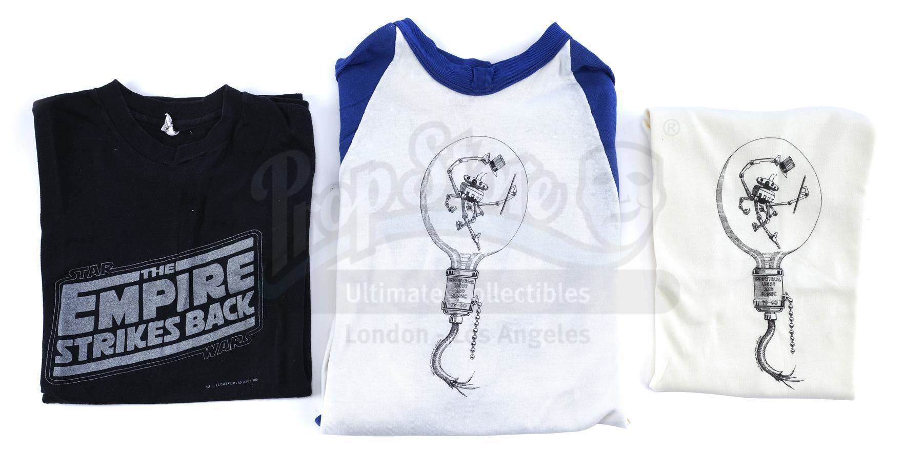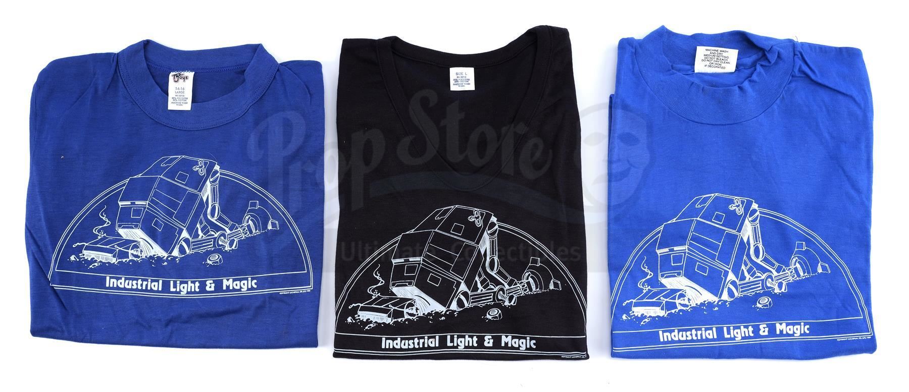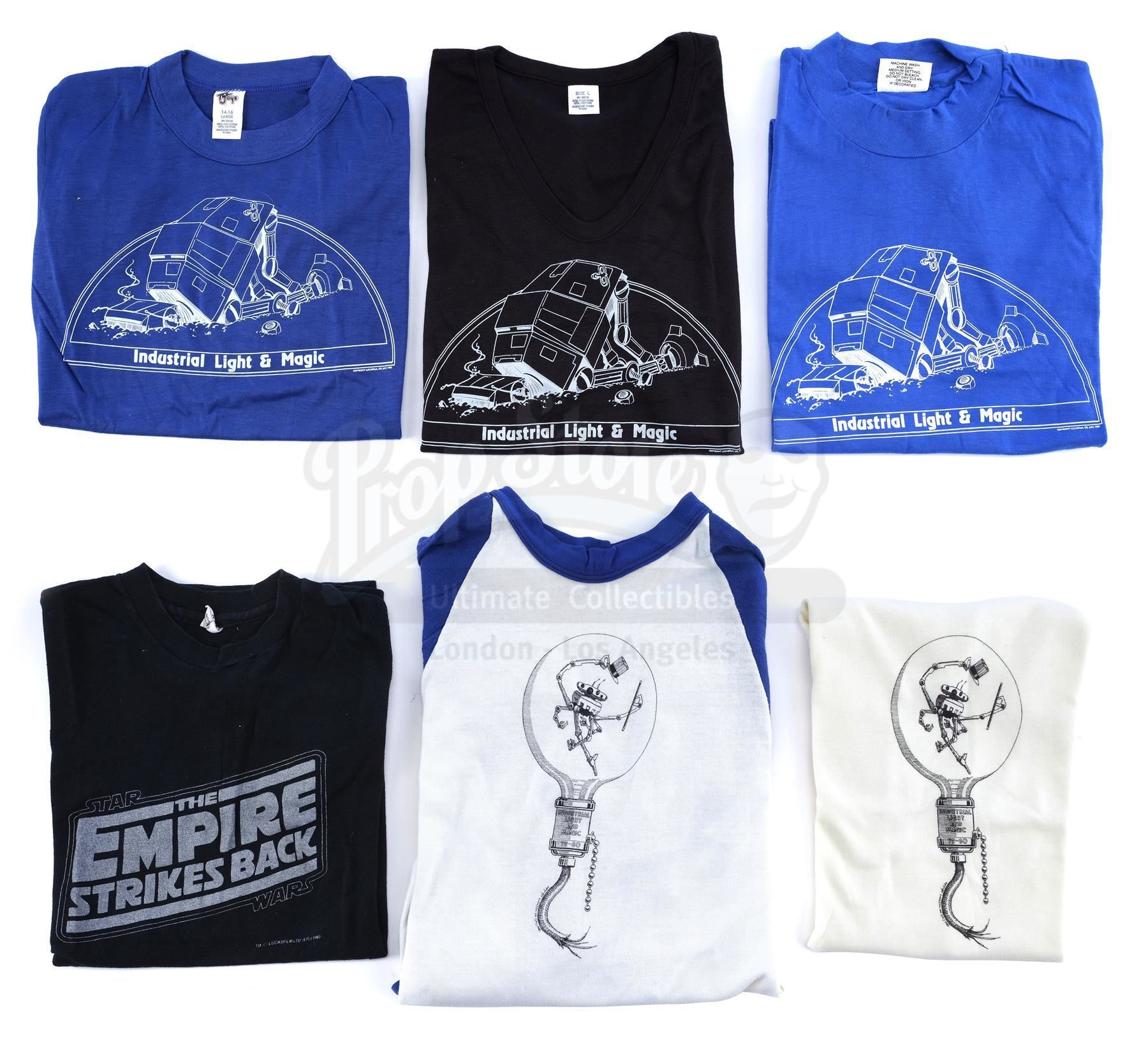 This lot will be auctioned on Thursday, July 1st. The auction will begin at 9:00am PDT and lots are sold sequentially via live auctioneer; tune in to the live streaming broadcast on auction day to follow the pace. Note other lots in the auction may close on June 29th or June 30th. Six Industrial Light & Magic (ILM) crew shirts from Irvin Kershner's Star Wars: The Empire Strikes Back. Crewmembers were given shirts bearing the project's title or related imagery. The lot consists two blue shirts featuring a crashed AT-AT and "Industrial Light & Magic;" one black variant ; one black shirt with the title logo on the front and the date and location of a benefit preview on the back; one white and blue shirt with a sketch of an Imperial probe droid with a top hat and cane dancing inside a lightbulb labeled "Industrial Light & Magic;" and one white variant . They are in excellent overall condition with minimal wear from age. Estimate: $600 - 800